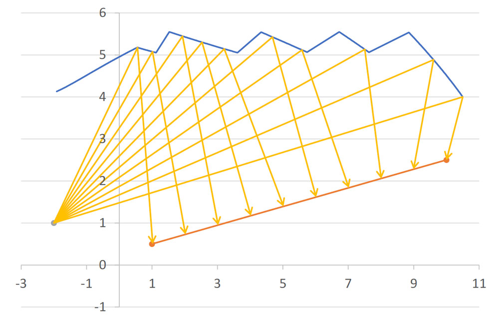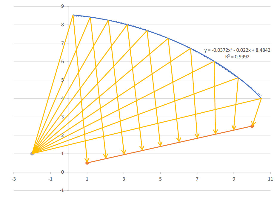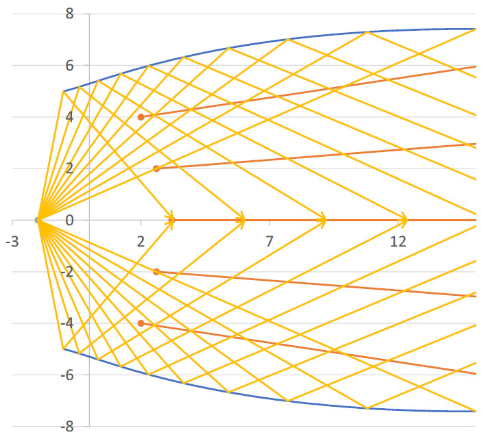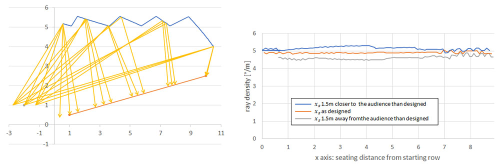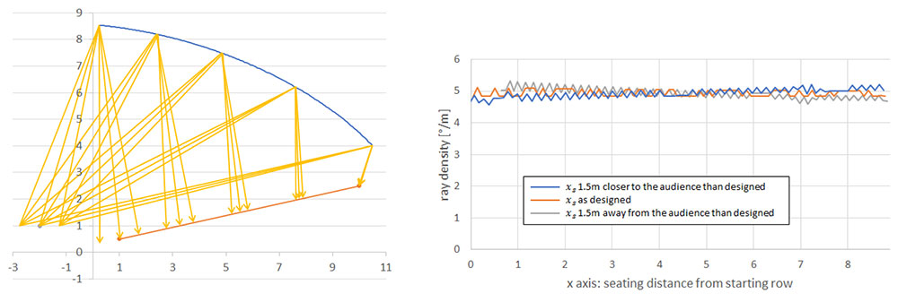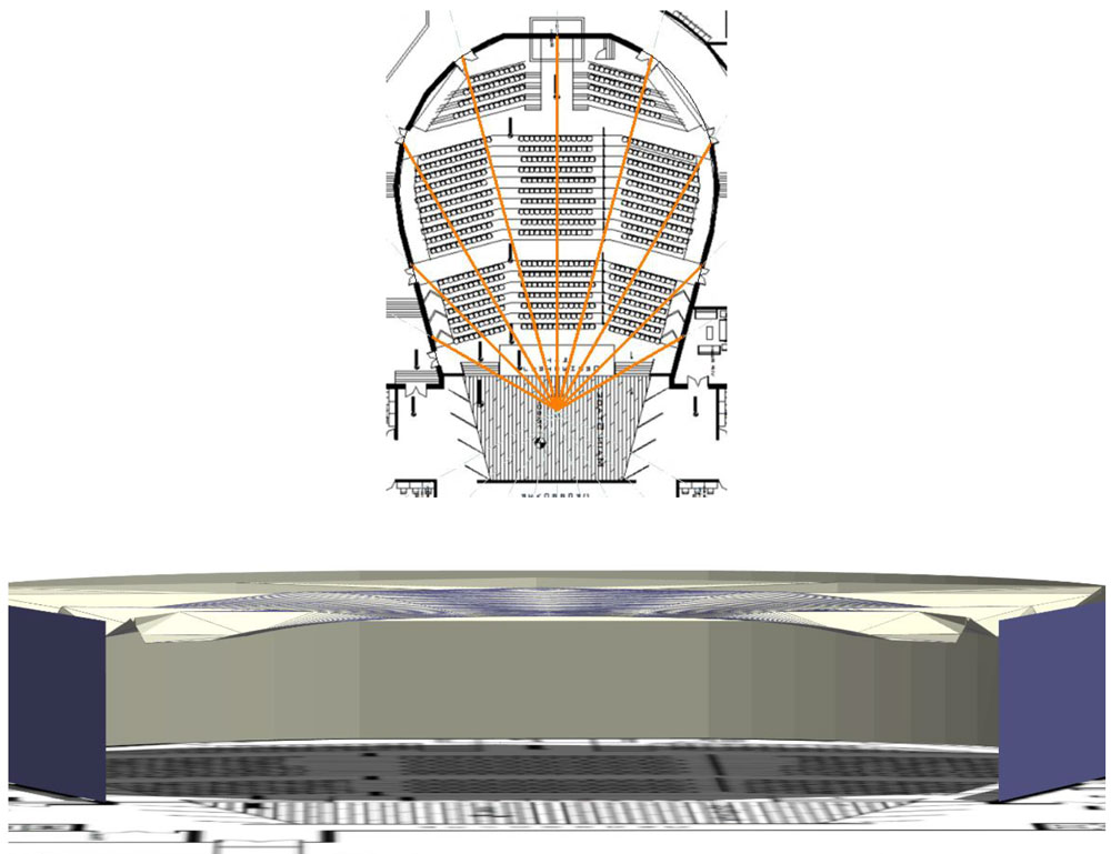 A A A Volume : 45 Part : 2 Proceedings of the Institute of Acoustics Early reflector geometry optimization methodology A. Galatas, ACC Acoustics Consultancy Company, Greece K. Dadiotis, ACC Acoustics Consultancy Company, Greece 1 INTRODUCTION It is well known that adding early reflections in auditoriums raises the apparent loudness of the direct sound in a comfortable, natural way, much more agreeable than turning up the volume. The denser the early reflections, the better a person can hear. Reflectors in concert halls are vital to the quality of the sound that reaches the audience. Roof reflections can give a very unique and characteristic sound profile in a closed space . In this paper a methodology to design the geometry of roof and/or side surfaces to evenly distribute the early reflections to the audience is presented. Through this methodology, an algorithm is developed to generate the acoustic shell by calculating the ideal curvature and the orientation of the surfaces for this purpose, while also retaining given geometric properties and constraints. 2 GEOMETRY OF REFLECTIONS In closed spaces the perceived sound level can be substantially increased compared to free field conditions, since sound energy is redirected to the audience due to reflections. As the sound waves that travel into the air encounter higher impedance obstacles, like walls and ceilings, part of the sound energy bounces back to the room causing a lower amplitude sound wave to travel in the opposite direction. When these reflections reach the ear very shortly after the initial sound wave, they are not perceived as new sound, but as an enhancement of the direct sound. The main part of the reflected energy, according to the law of reflections, will form a sound wave that will have the same angle of reflection as the angle of incidence, whereas the angles are measured relative to the perpendicular to the surface at the point where the wave strikes the surface. A simple model for simulating sound propagating from a speaker inside an auditorium would be to consider the source as a ray that travels in the room and reflects on its sound-reflective surfaces (surfaces that minimize the absorbed and diffused energy) to reach the audience and the audience as a vertically offset surface from the floor at the seating area. Figure 1: visualisation of law of reflection In two dimensions, the problem of finding the curve that will uniformly distribute the first order reflections to the audience, is formed by the givens of a point that is the sound source ( 𝑥 𝑠 , 𝑦 𝑠 ) and of a curve that represents the audience - points ( 𝑥 𝑟 (𝑡) , 𝑦 𝑟 (𝑡) ) -. The task is to find the curve (ceiling for vertical 2D-sections, walls for horizontal 2D-sections) composed by points ( 𝑥 𝑐 (𝑡) , 𝑦 𝑐 (𝑡) ): Figure 2: properties of points on reflector curve 3 ANALYTIC SOLUTION Setting an infinitesimal change in angle 𝜃 , the next point at the reflector curve is consider still lying in the perpendicular of the bisector of the incident and the reflected ray. When there is a known point on the reflector curve, the above differential equation can be solved numerically for 𝑥 𝑐 . The other coordinate, 𝑦 𝑐 , is then calculated by: 4 METHODOLOGY AND ALGORITHM The differential equation derived in the previous chapter can easily be numerically solved by implementing an algorithm, especially when the angle 𝜃(𝑡) step is linear, therefore the term 𝜕𝜃/𝜕𝑡 is constant. A linear step corresponds to evenly distributed reflected areas to the target region. Solutions for vertical mid-axis cross-sections of a typical small auditorium and of a larger concert hall composed of two seating areas, are shown in figures below. Figure 3: resulting reflector curve for vertical mid-axis cross-section of a typical small auditorium Figure 4: resulting reflector curve for vertical mid-axis cross-section of a concert hall composed of two seating areas The figures displayed in the previous page show rays casted at evenly distributed angles which are reflected to equidistance intervals at the seating areas, hence proving the accuracy of the algorithm. Two important conclusions can easily be derived from the results: a) the resulting height for a single continuous curve to act as a reflector for all of the audience is very high and not feasible for construction, especially for small to medium auditoriums, and b) each curve fits extremely well to the shape of a parabola, which seems sensible considering the reflecting property of the focus of parabolas when casting rays parallel to their axis (although the focus point of the curve-fitting parabola in this case has nothing to do with the source point). To undertake the height issue, non-continuous surface solutions can be sought, i.e. a break can be issued every time the reflector height exceeds a certain height. In order not to lose purposeful surface for reflections, the endpoints of sequential reflector surfaces should lie on a plane passing through the source point. The implementation of the above to the algorithm is shown in the figures below: Figure 5: non-continuous surface solution for Figure 3 case Figure 6: non-continuous surface solutions for Figure 4 case The same technique can be used for the side walls: Figure 7: resulting reflector curve and rays for side walls in concert hall The concept can be applied to three dimensions, where polar vertical cross-sections around the source point are solved and the results are combined to form a surface mesh for the ceiling reflector: Figure 8: resulting surface mesh by combining algorithm’s results from multiple vertical sections 5 DISCUSSION As shown, the proposed algorithm delivers vital tools for taking meaningfully into account the acoustics during early stages of auditorium design, by providing methods to generate or check the geometry regarding its ability to generate the beneficiary early reflections. The