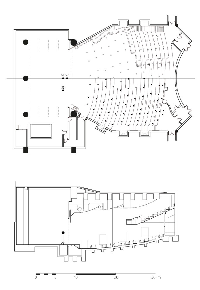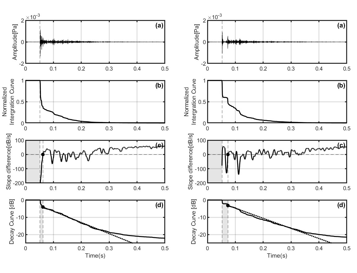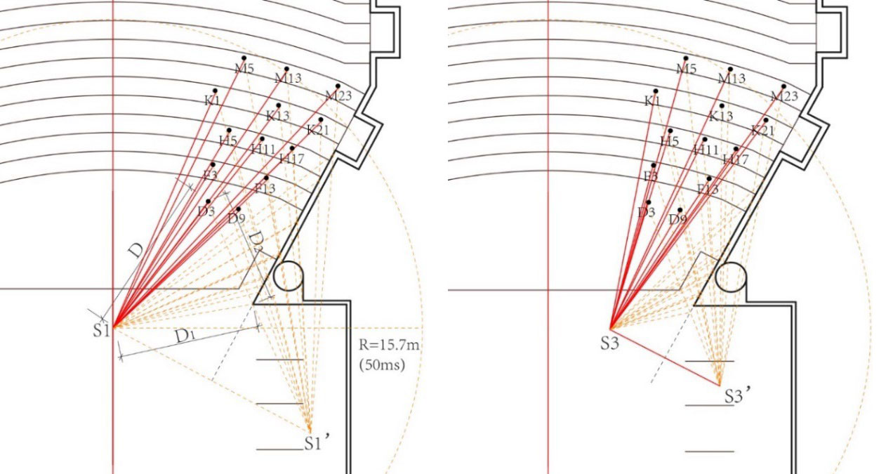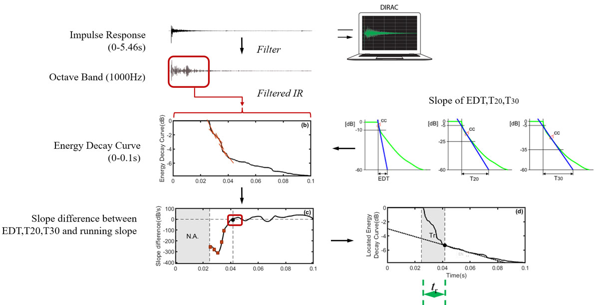 A A A Volume : 45 Part : 2 Proceedings of the Institute of Acoustics Finding early time limits 𝒕𝒆 with nonlinear regression on energy decay curves C. Q. Xia, Department of Building Environment and Energy Engineering, The Hong Kong Polytechnic University, Hong Kong, China S. K. Tang, School of Engineering, The University of Hull, Hull, UK 1 INTRODUCTION This study started with building a database for the existing Jockey Club Auditorium (JCA). Using the impulse response method to measure numerous seats which cover the whole auditorium. Based on hundreds of in-situ measurements in each seat point to investigate the hall's acoustic performance. Reverberation time (RT) distributed in the whole auditorium is always similar in the hall with fixed volume and absorption areas. While impulse response (IR) shows the apparent difference between seating areas close to a lateral wall and middle areas, The measurement shows plateau energy decay in the middle frequency which reveals an early reflection effect in the front seat area. While in the middle areas, exponential decay presents stability indicating the direct sound is predominant with subsequent reverberation attenuation. Schroeder first put forward the backward integrated energy curve also called as energy decay curve (EDC) in the 60s. All the acoustic parameters like Reverberation Time, Clarity, and Definition are based on the energy decay in EDC. Impulse responses in the entire auditorium are expected to propose by Volume and RT and Source receiver distance by Sabine and Barron. While the hall geometric data and the first lateral reflection path difference calculated from the point of source and receiver in seating areas shows differences, the middle area shows an exponential decay, while the EDC near the side wall always has a plateau. To find out the attenuation of the impulse response in the early reflection, we propose a nonlinear method to find the early time limit which separates the early reflection and lateral reverberation. Sound attenuation can be calculated with surface shapes defined by surface absorption coefficient by using simulation software with time-consuming, an intuitive understanding of impulse response could get from the early time limit 𝑡𝑒 distribution by in-situ measurement. 2 THEORETICAL METHODS 2.1 Callback to Schroeder Integrated Impulse Method Schroeder proposed the backward integration of the squared impulse response to calculate reverberation energy decay.1 The sound excites like an e-sweep or MLS signal and is generated by an independent omnidirectional sound source. Maximum length sequences (MLS) are binary sequences also known as pseudo-random binary sequences that are commonly generated by a cyclic shift of m-sized linear feedback shift registers along with a primitive polynomial. The periodic length P can be generated using the recursive formulation is equal to 2𝑁−1, where N is the order of shift register.2 A m-sequence of order 18 can generate a pseudorandom signal of 5.46 seconds with a sampling frequency of 48000 Hz. The deconvolution of interrupted noise can be analytically to generate room impulse response h(t), which backward integrated from t to infinity get energy time decay.3 𝐷(𝑡𝑘) is the decay function and 𝐷(𝑡𝑘) is the normalized decay function respectively. Thus, the logarithmic energy decay curve 𝐸(𝑡𝑘) can be expressed as the following equation, Jordan4 definite “steepness” 𝜎 at a time 𝑡0 corresponding to the 5dB below steady state during the buildup process. which is using the derivative of the decay curve for the first time. He also pointed out that early decay time (EDT) is a great parameter to describe the attenuation of the sound field from -5dB to -15dB in the early stage. Nonlinear regression is used to find the best fitted decay in the truncated time interval.5 The modified model defined the theoretical energy density following a linear decay before exponential decay.6 Berardi et al7 compared the μ model and implement factor γ to the estimated energy of the direct sound in churches. 2.2 Early Decay Curve and Running Steepness Processing Barron8 summarized the early decay curve into three typical decay shapes “cliff-type”, “plateau-type” and “sagging”. Fig. 1 illustrates the decay curve after direct sound arrival. The cliff decay represents the direct or early-reflection sound quite strongly. The plateau decay in Fig. 1(a)(ii) indicates the early reflection absence. While the measurement of JCA finds the plateau (early reflection) appears between the direct and reverberation sound in Fig. 1(b)(ii). The sagging reverberation curve is common in the back row of the auditorium far away from the source on the stage. In the actual comparison, the plateau produced by the early reflections has an apparent effect on the reverberation time (RT), it has troubled the reverberation time like T10, T20, T30 which selects -5 dB as the start point of slope reference. The same problem also happened on identifying which time interval like 50, 80 milliseconds chosen as the division of the energy ratio involving the perceived definition like Clarity and Definition.9 Figure 1: Types of early decay curve affected by early reflections in shoes-box shape auditorium compared with M. Barron EDC. (a) M. Barron EDC; (b) Measured EDC. (i) Cliff-type decay; (ii) Plateau-type decay; (iii) Sagging decay. Past research mainly focuses on overall energy decay. Here the nonlinear running “steepness” 𝜎(𝑥,𝑡𝑘) of normalized decay curve 𝑑(𝑡𝑘)calculated from the running slope interval which fits a first degree least-squares polynomial, the running slope interval ∆𝑡 of the polynomial fitting is set to 10ms to avoid the influence of signal fluctuations on the slope in very small intervals. Total sound energy can be calculated by normalized energy time decay as shown in Fig. 2. Least squares fitting proceeds the sum of the squares 𝑠