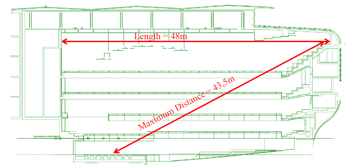 A A A Volume : 45 Part : 2 Proceedings of the Institute of Acoustics Why do large concert halls need to be optimized for early reflection coverage? E. Kahle, Kahle Acoustics, Brussels, Belgium Y. Jurkiewicz, Kahle Acoustics, Brussels, Belgium E. Green, Kahle Acoustics, Brussels, Belgium V. Berrier, Kahle Acoustics, Brussels, Belgium 1 INTRODUCTION The sound power of symphony orchestras is limited, but even in large concert halls audience members expect and demand appropriate loudness and impact. What does this mean for the design of large concert halls? In this paper, “large concert hall” means concert halls with capacities from 1,800 seats to over 2,000 seats, something which is often requested by clients for new-build halls in major cities. Several concert halls – and still more multi-purpose halls – with insufficient acoustic impact have become well-known examples of acoustically unsuccessful halls: from London’s 5,000-seat Royal Albert Hall to the 3,000-seat multi-purpose halls built in the US during the mid-20 th century; London’s Royal Festival Hall and New York’s Philharmonic Hall (then Avery Fisher Hall, now David Geffen Hall). Part of the problem was the focus on reverberation time RT as the main (or sole) design criterion, while the larger seat count and volume drove the sound to become weaker (and the audience seats further away the acoustically important reflection surfaces). Yet W. C. Sabine, the father of reverberation time and of modern room acoustics, in his seminal “reverberation” paper from 1900, had placed loudness first – and before reverberation – in his list of three factors influencing room acoustic quality. With reverberation time taking “centre stage” during the decades following Sabine’s pioneering work, loudness – and the corresponding criterion of Strength G, with the subdivision into early loudness Gearly and late loudness Glate – was not extensively studied before the second half of the 20th century. Barron1, based on his subjective and objective studies of British Concert Halls, postulated a Strength requirement of G ≥ 0dB for a concert hall, in order to have sufficient loudness and acoustical impact. In a subsequent paper2, Barron analysed the situation in more detail and postulated that all seats in a concert hall should fulfil this requirement of G ≥ 0dB, not only the hall average Strength for all seats. Achieving G ≥ 0dB for every seat in a concert hall, including the most distant seats, necessitates the average G of the hall to be at least between 2dB and 3dB, if not more. This corresponds to typical requirements stated in acoustic briefs for new concert halls: for the 2,400-seat Philharmonie de Paris the acoustic brief3 required a G of minimum 3dB (average within the hall) and for the planned new 1,900-seat concert hall for the BR Orchestra in Munich, the brief proposed to obtain an average close to 5dB, if possible. To clarify, in this paper all G-values are for the empty, unoccupied concert hall (without audience), since in general objective measurements for G are only available and published for the unoccupied state of the room. From these requirements for the room average G, and depending somewhat on the specific target for C80, it follows that the average values for both Gearly and Glate must be approximately 0dB to produce large concert halls with sufficient acoustical impact and sufficiently audible reverberation. The question therefore presents itself, to what extent the early and late sound strength must be acoustically optimised, to ensure sufficient acoustical impact and loudness? 2 DISTANCE In principle, a Gearly of 0dB should not frighten an acoustician, since the definition of G is 0dB at a distance of 10m in free field. This means that the energy of the direct sound, at a distance of 10m, will be 0dB (neglecting seat dip effect), and the acoustics of the concert hall will add some further early energy to the direct sound. But what is the average distance between a source and a receiver in a large concert hall? And, therefore, how much does the room have to add to the direct sound to achieve a sufficient level of early sound? The average source-receiver distance has been calculated for several typical concert halls of different forms. Let’s start with a typical shoebox hall, here the 1,900-seat KKL Lucerne concert hall, and use the hall’s dimensions: the length of the hall is 48m, from the organ to the rear wall, and the maximum distance from the last row in the top balcony to the centre of the stage is 43,5m (measured on the centre line using the long section). With a maximum distance of 43,5m, the average distance will be more than 20m – especially as a significant portion of the audience seats are in the four rear balconies, with all seats in the balconies at a distance of more than 30m from the centre of the stage. Figure 1: Long section, KKL Luzern. The length of the 1,900-seat shoebox concert hall is 48 m and the maximum distance from the last row in the top balcony to the centre of the stage is 43.5 m. All rear balcony seats in the hall are at distances of more than 30 m, and the average distance between sources on stage and receivers in the house is significantly above 20 m. For the 2,400-seat Philharmonie de Paris, the hall proudly puts forward that the most distant seat is at a distance of only 32m from the conductor’s position – significantly less distance than for example in KKL Luzern. For Philharmonie de Paris, a 3D-Rhino model of the hall was used to calculate the average distance from all seats to the centre of the stage. The calculation yields a result of an average distance of 21,5m – still above 20m. Figure 2: Philharmonie de Paris. 3D-Rhino model of the seats (left) and the result of the calculation of average distance (right). The furthest seat in PdP is at 32 m from the conductor, and the average distance between audience members and sources on stage is 21.5 m, also 