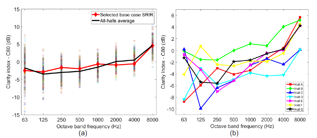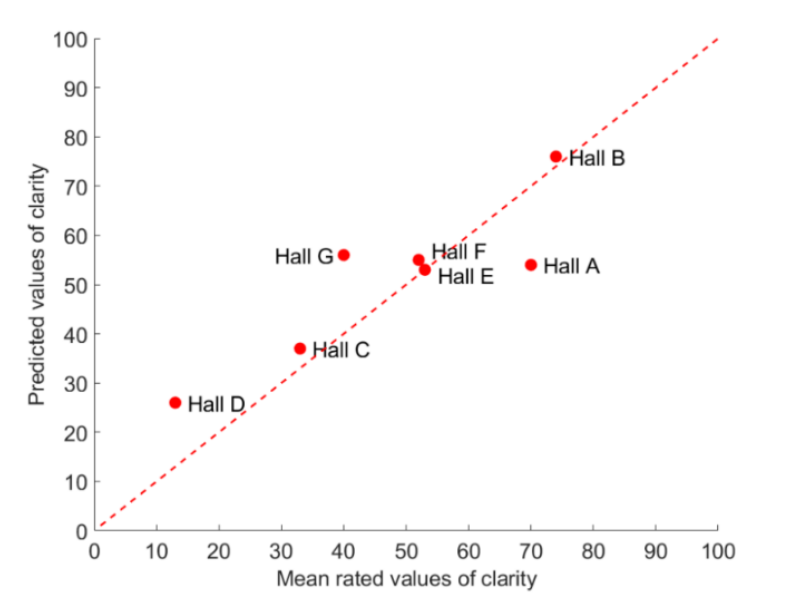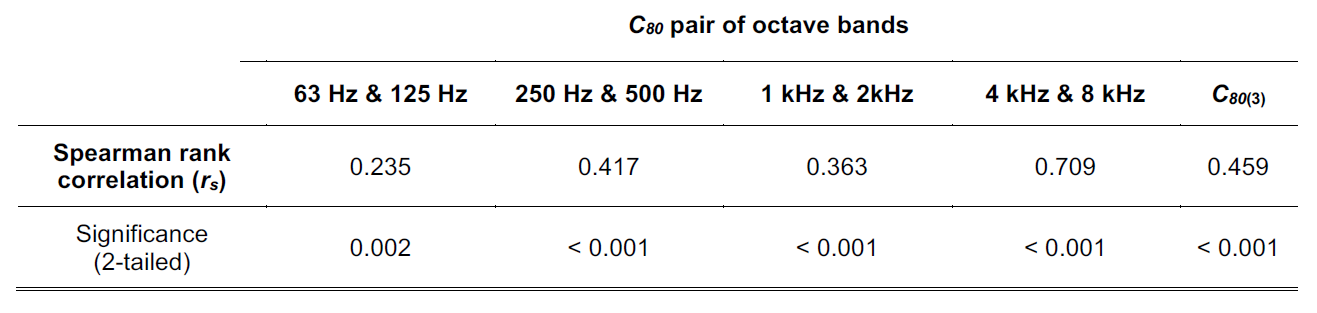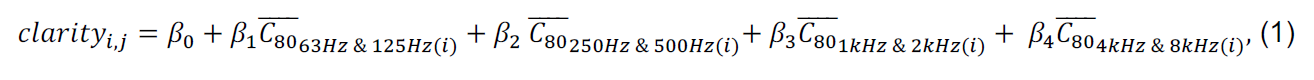 A A A Volume : 45 Part : 2 Proceedings of the Institute of Acoustics The importance of the high frequencies of clarity index for the perception of musical clarity F. del Solar Dorrego, Graduate Program in Acoustics, The Pennsylvania State University, University Park, Pennsylvania, USA M. C. Vigeant, Graduate Program in Acoustics, The Pennsylvania State University, University Park, Pennsylvania, USA 1 INTRODUCTION The seminal work conducted by Wallace C. Sabine at the turn of the XXth century [1], provided acousticians with the first set of scientific rules to predict a specific aspect of the acoustics of a room, its reverberation time (T30). Sabine’s work was limited to the study of reverberation and its subjective counterpart, reverberance, but more recent findings highlighted the fact that other perceptual aspects are important for the appreciation of room acoustics besides reverberance. The importance of the temporal structure of sound fields for the perception of clarity of speech and music, was highlighted by a series of studies conducted in the 1950s and 1960s [2] [3] [4]. The clarity index metric (C80) was proposed as an objective parameter that can quantify the degree of musical clarity in a sound field, based on the early-to-late ratio of sound energy in the room impulse response (RIR) [4]. Clarity index is a well-established metric and has been included in the Annex A of the ISO 3382-1 standard [5], along with other metrics derived from the RIR. However, there is little information of which octave bands of C80 have more influence on the perception of musical clarity. In the past, recommendations on how to average different octave bands of C80 to obtain a value better correlated with the perception of clarity have been proposed [5] [6] [7], but these recommendations have often been made without sufficient scientific validation. The purpose of the present study was to propose a weighted average of the octave-band values of C80 , called a single-value frequency-averaged metric (SVFA), to obtain a metric better correlated with perceived musical clarity. 2 PREVIOUS RESEARCH ON PREDICTORS OF CLARITY Starting in the decade of 1950, a series of studies conducted in Germany analysed the effect of sound reflections on the appreciation of the acoustic character of speech and music signals. A general analysis of the influence of the delay and relative amplitude of sound reflections on the perceived acoustics, was undertaken by Thiele [3], who highlighted the importance of “useful” reflections, associated with the early sound, versus “detrimental” reflections associated with the late sound. Reichard and Kussev [4] set the integration value for the useful reflections at 80 ms after the direct sound, based on the observation of the duration of musical notes and transients of musical instruments. The C80 metric was defined as the ratio of the energy of the RIR up to 80 ms, and the energy of the sound reflections after 80 ms, in decibels. Several studies have proposed averaging schemes for the different octave-band values of C80 that are better correlated with perceived clarity. Soulodre and Bradley [8] conducted a subjective study in which they evaluated the correlations between different combinations of the octave band values of C80 and musical clarity. In their investigation, the highest correlation with musical clarity was found for the average of the 500 and 1000 Hz octave band values of C80. Beranek [6] and Barron [7] recommended, without rigorous scientific validation, that averaging the values of the 500, 1000, and 2000 Hz octave bands of C80 yields a metric, C80(3), that has a high correlation with musical clarity. Barron [7] justifies this operation since the human ear has a low temporal resolution for frequencies below 500 Hz. The ISO 3382-1 standard [5] proposes the average of the 500 and 1000 Hz octave band values of C80 to obtain a SVFA measure that is better correlated with musical clarity. More research is needed to elucidate the dependency of musical clarity upon the different frequency ranges of C80. The present work proposes a SVFA of C80 that can better predict musical clarity based on a subjective study using realistic auralizations of concert hall acoustics. 3 EXPERIMENTAL OVERVIEW The investigation presented in this paper is separated into three tasks. The first task, Task 1, was designed to obtain a regression model that can predict subjective ratings of clarity from the octave band values of C80 of an arbitrary RIR measured in a hall. The stimuli used in Task 1 were composed of a base case spatial room impulse response (SRIR) extracted from a database of concert hall acoustics measurements [9] [10], which was computationally modified to obtain an additional set of stimuli with specified values of C80 in different pairs of octave bands. Since changes in C80 were made in individual pairs of octave bands, Task 1 will be referred to as the “one-factor-at-a-time” (OFAT) task, since each factor (pair of octave bands) was modified individually. Task 2, referred to as the “validation task”, consisted of the validation of the regression model obtained in Task 1. Seven SRIRs, corresponding to a representative sample of seven halls from the same database used in Task 1, were used as the stimuli. These SRIRs were rated by the subjects in terms of perceived clarity, and the obtained ratings were compared with those predicted by evaluating the regression formula obtained in Task 1 with the C80 octave band values of these halls. In Task 3, a correlation analysis was performed between the ratings of clarity of the seven halls used in the validation task (Task 2) and their octave-band C80 values. The purpose of the correlation analysis was to further assess the level of association between the different frequency ranges of C80 and the perception of clarity in the acoustics of concert halls. A direct scaling method was selected to quantify the sensory impression. The su