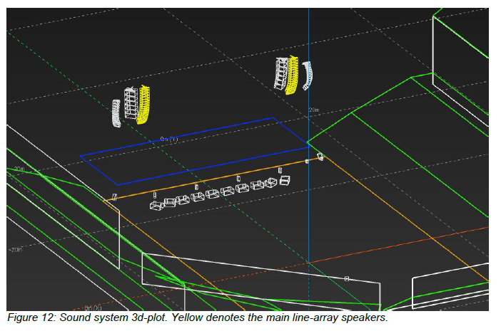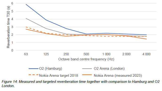 A A A Volume : 45 Part : 2 Proceedings of the Institute of Acoustics Room Acoustic Design of a 15 000-Capacity Multi-Purpose Arena P Laukkanen Akukon Ltd., Helsinki, Finland J Riionheimo Akukon Ltd., Helsinki, Finland J Pätynen Akukon Ltd., Helsinki, Finland H Penttinen Neural DSP Ltd., Helsinki Finland 1 INTRODUCTION Nokia Arena is a 15 000-capacity multipurpose Arena located in Tampere, Finland. The Arena was designed and built on top of a major railway line between 2015 and 2022. Within the same project, a hotel and two mixed-use towers were built on the same deck. The Arena is used for many types of events such as ice hockey, commercial fairs, and various music events. This paper concentrates on the music use of the venue, which was the driving use scenario for most of the room acoustic design decisions during the project. So far, the feedback from the audience and mixing engineers has been positive when it comes to the room acoustics of the venue. The paper presents the room acoustic design process of the multipurpose arena and the results of acoustic commissioning measurements of the finished Arena. Measurement results are compared to the design criteria as well as room acoustic measurements of similar international Arenas. Based on the measurement results, the relationship between subjective observations and objective measurements is discussed. Finally, the key lessons learned are summarized. 2 PRIOR RESEARCH ON ARENA ROOM ACOUSTICS Arena room acoustics have been studied over the years based on room acoustic measurements, computer modeling, and subjective experience on achieved acoustics2,3,4. Early research has typically been limited to individual case studies of certain Arenas and individual conclusions based on one space. The first and presumably the largest study, where different venues have been compared to each other, is by Niels Adelman Larsen from 2005-20101. Adelman Larsen’s research includes measurements and assessment of room acoustics of 55 venues, from which around 15 are comparable to Nokia Arena, in terms of use profile and volume or capacity. According to Adelman Larsen1, the most important room acoustic criterion for large pop/rock venues is the reverberation time at low frequencies, T 60 at 125 Hz octave band being the most important octave band. Other conclusions from Adelman Larsen1 include that there should not be disturbing late reflections that can be heard as echoes. In his book, Adelman Larsen also discusses the importance of stage acoustics and how musicians should get sufficient feedback from the hall to be able to feel the same acoustic climate as their audience. Based on his research, Adelman Larsen gives a recommendation for reverberation time for large indoor venues as a function of room volume. 3 ACOUSTIC DESIGN OF THE NOKIA ARENA 3.1 Room acoustic considerations in the competition stage The author gave acoustic design advice for the (winning) competition entry already before the project fully started. Alongside the sound insulation of the building envelope, the room acoustic characteristics of the roof build-up were identified as critical for the success of the acoustics of the Arena. In terms of surface area, the roof/ceiling is the largest individual surface in indoor Arenas, and hence it is important to be able to integrate as much absorption into the ceiling as possible. Figure 1 shows a roof build-up sketch drawn for the competition entry, where the designed room acoustic element was a perforated steel sheet with mineral wool backing. 3.2 Target criteria As soon as the project concept design started, room acoustic criteria were set based on Adelman Larsen1 recommendations. The reverberation time target was set to 2 seconds at mid frequencies and to 2,2 seconds at 125 Hz, respectively. These were based on Adelman Larsen's recommendation for 150 000 m 3 Arena. In addition to reverberation time targets, the brief specified that no individual audible echoes shall occur. Figure 2 shows the reverberation time target of Nokia Arena, together with the measured reverberation time of O2 Hamburg (500 000 m3, 16 000 capacity) and O2 London (400 000 m3, 20 000 capacity)1. 3.3 Room acoustic modelling Room acoustic Odeon model was built at an early stage of the design process. The key finding from the early Odeon modelling was, that the roof/ceiling itself won’t be able to provide enough absorption at low frequencies, and additional surfaces had to be sought where low-frequency absorption could be integrated. 3.4 Roof/ceiling construction Figure 3 shows the implemented final roof build-up from 2021. For building-physics-related reasons there was a limit in the mineral wool thickness that could be integrated into the underside of the roof element. The absorption performance of the final roof build-up was measured in a reverberation chamber. Based on the absorption data of the final roof build-up, the amount of additional absorption was calculated, and integrated into the architectural design of the Arena. Multiple locations for added (low frequency) absorption were found. These are discussed in more detail in the next section. 3.5 Designed absorption surfaces Figures 4-8 show the absorption surfaces with additional absorption. Surface (4) was not implemented in the end due to a low effect compared to price and installation challenges. Absorption surface number (7) was not implemented, as it was found architecturally difficult to fit together with the rear seat row. This was, however, identified as a big risk in causing/boosting a specular reflection that could be audible as an echo. This assumption was subsequently confirmed with audible reflections projected to some parts of the flat floor area. This effect is discussed in Chapter 4. Based on the final Odeon modelling, the absorption surfaces that were included in the final design were not quite sufficient to meet the reverberation time criterion at low frequencies. This was accepted by the client as th