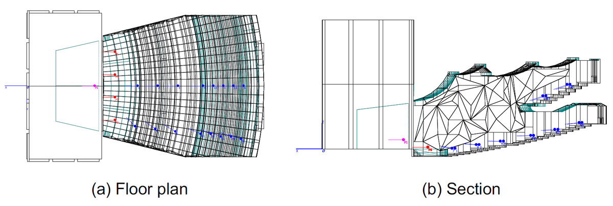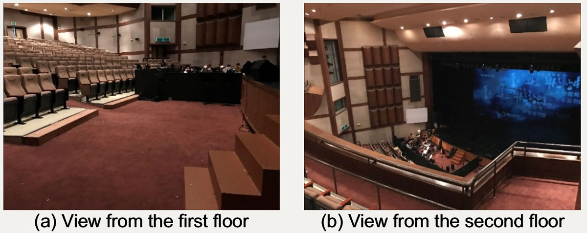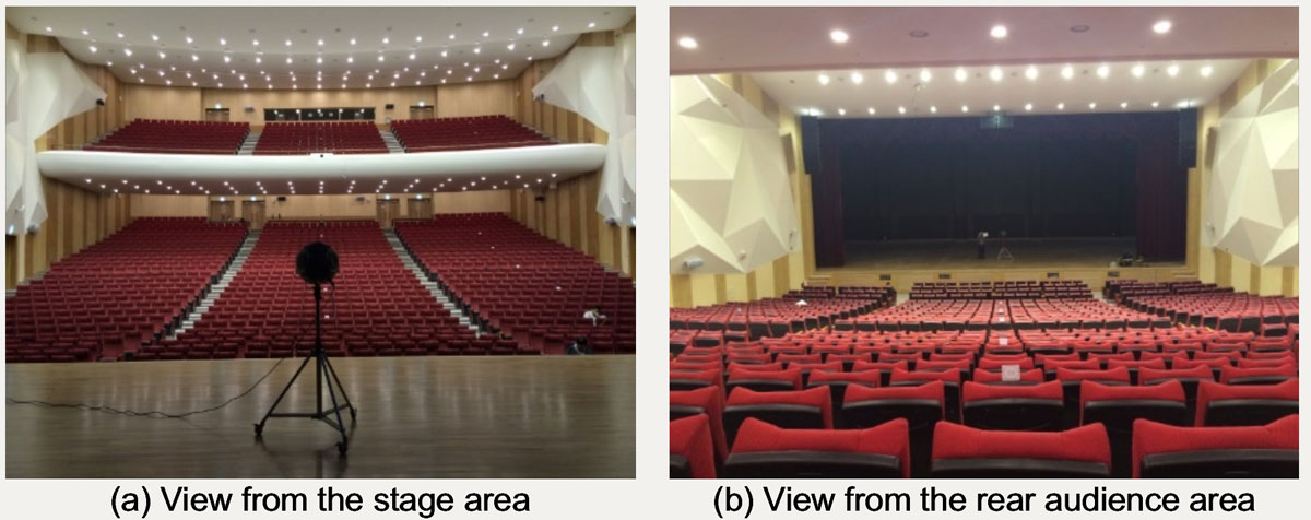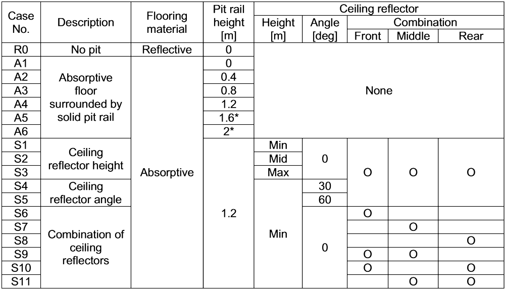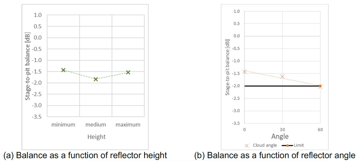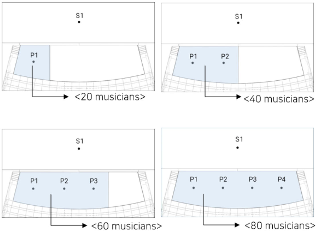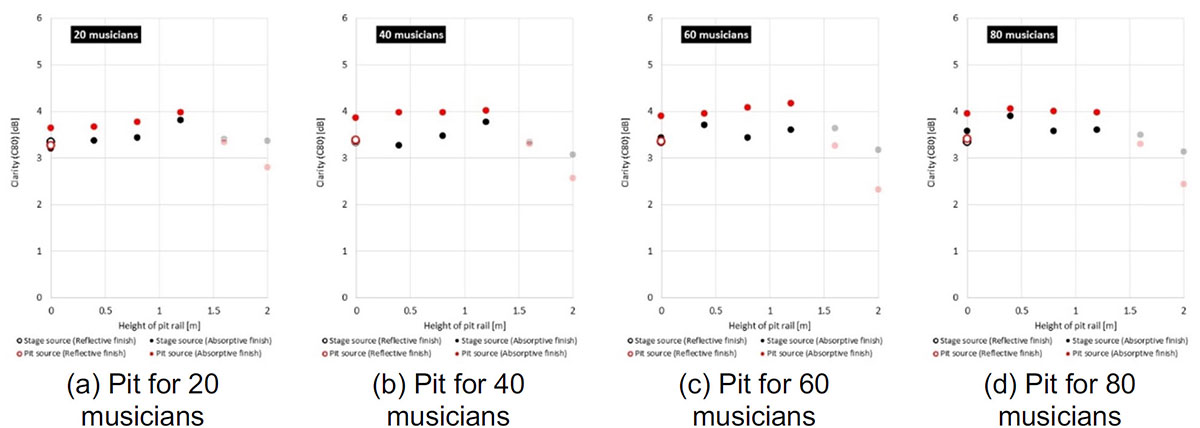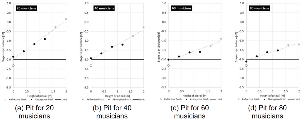 A A A Volume : 45 Part : 2 Proceedings of the Institute of Acoustics Improvement of stage-to-pit balance in a small multi-purpose hall with open style pit SE Jeon Pusan National University, Busan, South Korea YH Kim Youngsan University, Yangsan, South Korea 1 INTRODUCTION The sound quality of a music venue has a major impact on both the performers and the audience1. This is particularly important in opera houses or classical concert halls, where natural sound is used without the use of electrical sound, and the influence of architectural sound is important2. When designing an opera house, there are design criteria such as 1.3 s to 1.8 s reverberation time3, 2.5 m depth of the proscenium4, and ensuring acoustic/visual intimacy2. Another critical design factor is the balance of sound levels between the singers on stage and the orchestra in the pit5. In an opera house, the singers on stage and the orchestra in the pit work together to create sound. However, because the sound power levels of the singers and the orchestra are very different, it is difficult to work together if one side is too loud. Therefore, studies have been conducted on stage-pit balance to control the volume of these sounds. In the previous studies, Barron considered the appropriate range of balance to be 0.9 dB to 4.5 dB6 and Sato et al. suggested a range of -2.0 dB to +2.3 dB7. In most cases, the sound of the orchestra in the pit is much louder than that of the singer8. It is therefore essential to control the sound of the orchestra in the pit to control this balance. Since an ordinary opera house has the shape of a covered pit, the size of the opening of this pit controls the sound of the orchestra in the pit. However, there are some cases where a small or medium-sized multipurpose hall is not large enough to accommodate a covered pit. Therefore, in the case of such a concert hall, the performance is performed without an orchestra pit, and currently, the sound of the performer is so loud that the sound of the singer is often drowned out. Figure 1 shows an example of a small multipurpose hall with an open pit for opera performances. Therefore, further research is needed to control the sound of the orchestra with architectural acoustics. This paper investigates architectural treatments to improve stage-to-pit balance using computer simulation in a medium-sized multipurpose hall without an orchestra pit. A 1,500-seat hall with a poor stage-to-pit balance of -2.6 dB due to its open-style environment was selected as shown in Figure 1, and the simulation model hall was reproduced by acoustic verification based on the field measurement results. To improve the stage-to-pit balance, architectural treatments such as changing the floor material, installing pit rails, and installing reflective panels on the ceiling were considered to find the optimum shapes to improve the stage-to-pit balance. Figure 1: Example of a small multi-purpose hall with an open-style pit for opera performances 2 MATERIALS AND METHODS 2.1 A hall with an open-style pit for simulation modelling A medium-sized multi-purpose hall with an open pit was selected for simulation evaluation. The target hall was approximately 1,500 seats, with a rectangular floor plan and a second-floor rear balcony. Figure 2 shows the interior views of the target hall. Field measurements of room acoustic performance were taken to build the computer simulation model in accordance with ISO 3382-19. As the measurement results, it was found that the target hall had a reverberation time (RTmid-frequency) of 1.2 s, an early decay time (EDTmid-frequency) of 1.14s, a definition (D50,mid-frequency) of 54%, a clarity (C80,3B) of 3.3 dB, a lateral energy fraction (LFE4) of 0.18 from the stage sound source. Based on the measurement results, a simulation model was built as shown in Figure 3. Acoustic fitting of the computer simulation model was performed to ensure that the just noticeable difference9 (JND, relative 5%) of the reverberation time was within the range of the field measurements. Figure 2: Interior views of the target hall Figure 3: Computer simulation model with source and receiver position 2.2 Measures for the stage-to-pit balance The previous studies6,7 on the stage-to-pit balance have made subjective preference judgments for combinations of different source positions to investigate the relationship between acoustic parameters and subjective preferences. The stage-to-pit balance (B) can be defined as the G value on the stage minus the G value in the pit7. The balance was only assessed using the average G-value, but it is considered that the area that meets the minimum balance is also important. Since the volume in the orchestra pit is inherently louder than the singers' voices on stage, the balance value is prone to negative values. However, it is also not desirable to have too much volume on stage, so previous research has suggested a range of 0.9 dB to 4.5 dB6 or a range of -2 dB to 2.3 dB7. In this study, we set the recommended range suggested by Sato et al.7 as the target for balance improvement. The balance value measured on-site at the target space was -2.3 dB, indicating that the orchestra's loudness was largely transmitted to the audience due to the open environment with no pit rails installed. As a result, both singers and orchestra reported acoustic difficulties when performing small scale opera in this space. 2.3 Setting up an open-orchestra pit based on the performer size In general, the area of the opening of the covered pit and the covered area are important, but the design criteria of the open pit are different. In a covered pit, the minimum floor area of the pit should be at least 1.5 m2 per musician, but in an open pit, the minimum floor area of the pit should be 1.2 m2 per musician9. The number of performers was defined within the maximum number defined by Gade5. Figure 4 shows the position of the loudspeaker in the pit and on the stage, divided by size according