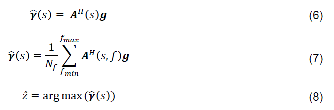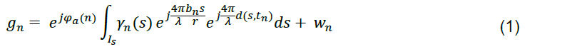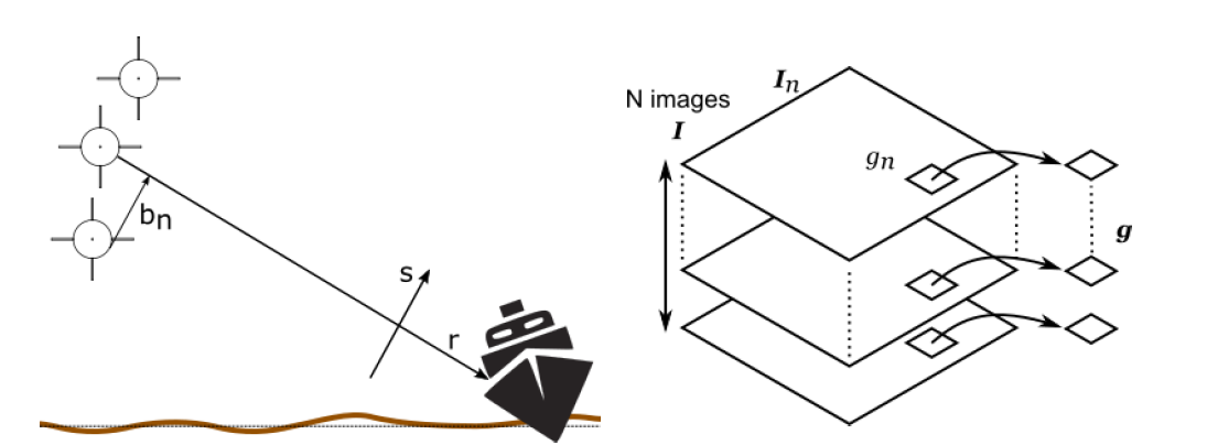 A A A Volume : 38 Part : 3 Proceedings of the Institute of Acoustics An investigation into optimal acquisition geometries for repeat-pass synthetic aperture sonar bathymetric mapping BW Thomas, Department of Mechanical Engineering, University of Bath, Bath, UK AJ Hunter, Department of Mechanical Engineering, University of Bath, Bath, UK 1 INTRODUCTION Synthetic aperture sonar (SAS) systems are able to generate two-dimensional images of the seafloor with resolution on order of a centimetre. This high resolution is achieved by coherent processing of the acoustic data collected from multiple pings along the path travelled by the sensor. It is desirable to achieve the same resolution in height for 3D mapping since 3D shape information is invariant to imaging geometry and may therefore improve the probability of classification of underwater objects. Traditionally this is achieved by interferometry, which uses two vertically separated arrays mounted on the vehicle. However, due to size constraints on typical autonomous underwater vehicles (AUVs), these arrays have a vertical separation limited to the order of several tens of wavelengths. This gives a resolution in the vertical direction on the order of tens of centimetres, which is significantly poorer than the 2D image resolution of a typical SAS. It has been shown in the synthetic aperture radar (SAR) literature1 that combining data from multiple passes using tomographic processing can improve resolution in elevation compared to interferometry between only two passes. Successful coherent co-registration of SAS images has been shown with timescales varying from hours to a few days2. Furthermore, tomographic imaging has been successfully demonstrated from a circular SAS system performing 9 passes of an interferometric array both at multiple heights and radii3. In recent work, repeat-pass interferograms were demonstrated over multiple passes from the CMRE MUSCLE AUV4, suggesting that repeat-pass SAS tomography is possible with this hardware. Carrying out repeated passes for high-resolution 3D tomography is time-consuming. Therefore, we wish to choose the optimal number of passes to achieve a desired resolution. To this end, we have used analytical and numerical models to simulate the expected height resolution as a function of the number of passes and the repeat-pass geometry. We intend that this information will be used to inform the planning of future 3D mapping missions. 2 3D TOMOGRAPHIC PROCESSING 2.1 Forward model In order to perform tomographic processing, multiple passes are made over a scene from slightly different positions, as illustrated in Figure 1. In the following, ‘π ’ is the elevation axis, ‘π’ is the range and ‘ππ’ is the orthogonal component of the baseline between some chosen reference pass and the ππ‘β pass. We make the assumption that for the range of elevations of interest, the elevation axis may be assumed straight. Figure 1: - Repeat-pass imaging geometry Figure 2: – Accumulation of images Tomographic processing is performed on the 2D images obtained by any standard SAS focussing method. Thus, a 3 dimensional stack π° of π images π°π is available for processing. The value π π of each pixel in these complex-valued images is given by the coherent sum of all back-scattering contributions along the elevation direction s. This complex backscattering function is termed πΎ(π ) . where πππ(π) is a phase term associated with the propagation velocity in the medium, π is the wavelength, πΌπ is the extent of the scene in the elevation direction, π(π ,π‘π) is the deformation affecting the scatterer at elevation s, and π€π is a noise term, accounting for thermal noise and decorrelation. In the following it is assumed that the medium propagation term is compensated for in a pre-processing image registration step, so the first term may be discounted. If the assumption of simultaneous passes is made such that there is no deformation term, then the tomographic equation is reached5: This equation is identical to the Fourier transform operator, allowing the problem to be posed as one of spectral estimation. πΎ(π ) may be seen as the spatial signal, with ππ being a spatial spectrum sampled with spatial frequencies ππ = −2ππ/(ππ). Discretising equation 2, and assuming the scattering is distributed over small elevation intervals within the range of elevations of interest, where π collects the values of a particular pixel over N passes as shown in figure 2, π(π ) is the steering vector representing the tomographic model; for pass π , π(π )π = π −π2ππππ /√π . The noise in each pixel is collected in the vector π. The problem may then be phrased as a matrix multiplication, where π¨ collects the steering vectors for all passes over the range of elevations of interest, and πΈ(π ) is the vector representing the complex back-scattering function over that range. 2.2 Inverse model The desired backscattering function πΈ(π ) may then be estimated by approximate inversion of the matrix π¨(π ), as in Equation 6. Since π¨(π ) is in general not a square matrix, in the classical beamforming methodology the Hermitian operator is used. For wide-band systems, the resolution may be improved by performing the tomographic processing at a range of frequencies, and computing the mean back-scattering function πΈΜ(π ), as in Equation 7. Under the assumption that only one dominant scatterer is present in each pixel stack, the elevation π§Μ of that pixel is approximated as the location of the maximum of its estimated backscattering function. The height of the peak is termed the ‘multi-acquisition coherence’ and gives a measure of the degree to which the estimate may be trusted. Finally, a 3-pixel square median filter is applied to the height estimates, which acts to reject outliers. Various alternative methods of spectral estimation have been presented in the liter