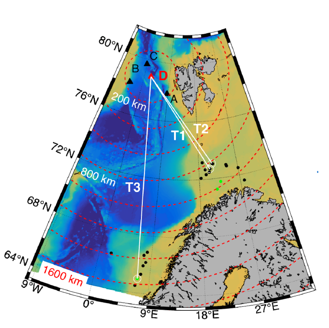 A A A Volume : 38 Part : 3 Proceedings of the Institute of Acoustics Impact of long distance propagated seismic signals on the soundscape in the Fram Strait: Use of ACOBAR data and PE modelling E. Storheim, Nansen Environmental and Remote Sensing Centre, Bergen, Norway A. Yamakawa, Nansen Environmental and Remote Sensing Centre, Bergen, Norway H. Sagen, Nansen Environmental and Remote Sensing Centre, Bergen, Norway G. Pedersen, Christian Michelsen Research AS, Bergen, Norway 1 INTRODUCTION The expected increase in anthropogenic noise in the Arctic, due to increased shipping and resource exploitation, may have a negative influence on the living conditions for marine life. The Fram Strait, and in particular the Marginal Ice Zone (MIZ), is a habitat for marine mammals and fish. It is therefore important to establish a soundscape baseline for this region, and to monitor the changes in the acoustic environment. One of the key components of anthropogenic sounds is that of seismic airguns, which are used in e.g. seismic surveys for oil and gas exploration, and to map the bathymetric profile and geological properties of the seafloor. These airguns often have a very high source level (SL), which, combined with low attenuation in water for the relevant frequencies, allows for long-range propagation of sound which retains a significant sound pressure level. Many simulation tools have been developed and used to study the influence of different parameters, such as bathymetry and variability in the ocean environment, on sound propagation1. For example, Tronstad & Hovem2 used ray tracing to investigate propagation of airgun signals over 10 km to 50 km long transects, with range-independent sound speed. The effect of a typical summer and a winter sound speed profile was shown, along with the effect of the bathymetry. Impact on marine life was also discussed. Thode et al.3 investigated airgun signals propagating in the Arctic Ocean, and the influence due to a changing ice cover. In this study, airgun signals were observed from 400 km to 1300 km. Tollefsen and Sagen4 observed airgun signals originating from the Norwegian Sea 1400 km away, during an experiment with sonobuoys to investigate the spatial variability of ambient noise in the MIZ. Measurements of the soundscape in the Fram Strait resulted from the ACOBAR5 ocean acoustic tomography experiment. Seismic airgun activity6 was observed in a significant amount of the hydrophone recordings made during the experiment. During this study, a seasonal variation in the vertical distribution of the sound was found. The objective of the present work is to analyse this behaviour, and to use simulation tools to illustrate how the sound propagation is affected by: 1) the bathymetry; and 2) the seasonal variability in the sound speed profile between summer and winter. 2 METHODS 2.1 Experimental configuration The experimental results presented here are obtained from the ACOBAR5 (Acoustic Technology for Observing the interior of the Arctic Ocean) acoustic tomography experiment. The project was designed to monitor the properties and transport of water masses to and from the Arctic Ocean through the Fram Strait. It was made up of four distributed vertical line arrays (DVLA), placed in the Fram Strait between Svalbard and Greenland, illustrated by the large black and red triangles in Figure 1. Recordings from mooring D are used in the present work. 8 hydrophones were distributed along the vertical mooring at design depths of 227.9 m, 323.9 m, 419.9 m, 515.9 m, 614.2 m, 710.2 m, 806.2 m, and 902.2 m. The sampling frequency is 1000 Hz, and recordings were made between 10 Hz and 500 Hz for 100 seconds, every third hour over two years. The measurement results shown in Section 3.2 are obtained from mooring D at two different dates: 1) 2011-02-22; and 2) 2011-07-19. 2.2 Simulation setup The 2D simulations of the transmission loss (TL) as a function of range, 𝑟, and depth, 𝑧, are performed using RAM7. A point source with unit amplitude and a 100 Hz frequency is placed at 10 m depth. The source radiates into lossless water with a flat water/vacuum interface at the top, and a semi-infinite, range-dependent bottom profile. The simulation results are shown in terms of the signal level S, given by the passive sonar equation as1 where SL is the source level. The source level used here is 250 dB re 1 µ Pa. The absorption in seawater is assumed to be negligible for the frequencies used here. The range-dependent sound speed profile is obtained from the 2013 World Ocean Atlas8 (WOA13), with a 1/4° resolution. The bathymetric profile is obtained from the International Bathymetric Chart of the Arctic Ocean9 (IBCAO). The material properties used for the bottom are: a longitudinal sound speed of 3000 m/s, a density of 1500 kg/m3 , and an attenuation of longitudinal waves of 1.5 dB/ λ. These parameters are for the present case set to range-independent. Three different transects are investigated in the following, from two regions: Two from the Barents Sea, denoted T1, and T2; and T3 in the Norwegian Sea, cf. Figure 1. These are selected based on the bathymetric conditions and the spatial variation in the sound speed profiles. The simulations are performed with a uniform spatial resolution of 𝛥𝑟 = 500 m in the horizontal direction, while the vertical resolution is depth-dependent. The profile is sampled every 5 m above 100 m, every 25 m from 100 m until 500 m, every 50 m from 500 m to 1000 m, and every 100 m below 1000 m. 3 RESULTS 3.1 Seismic surveys General information about seismic surveys in Norwegian territorial waters, such as the time period, region, and the size and number of airguns used, is available from the Norwegian Petroleum Directorate (NPD)10. Typically, most of the activity is performed in the summer time, due to e.g. poor weather or low-light conditions in the winter. For the present case, 6 different surveys were performed in the winter period, and 33 differen