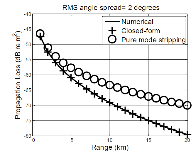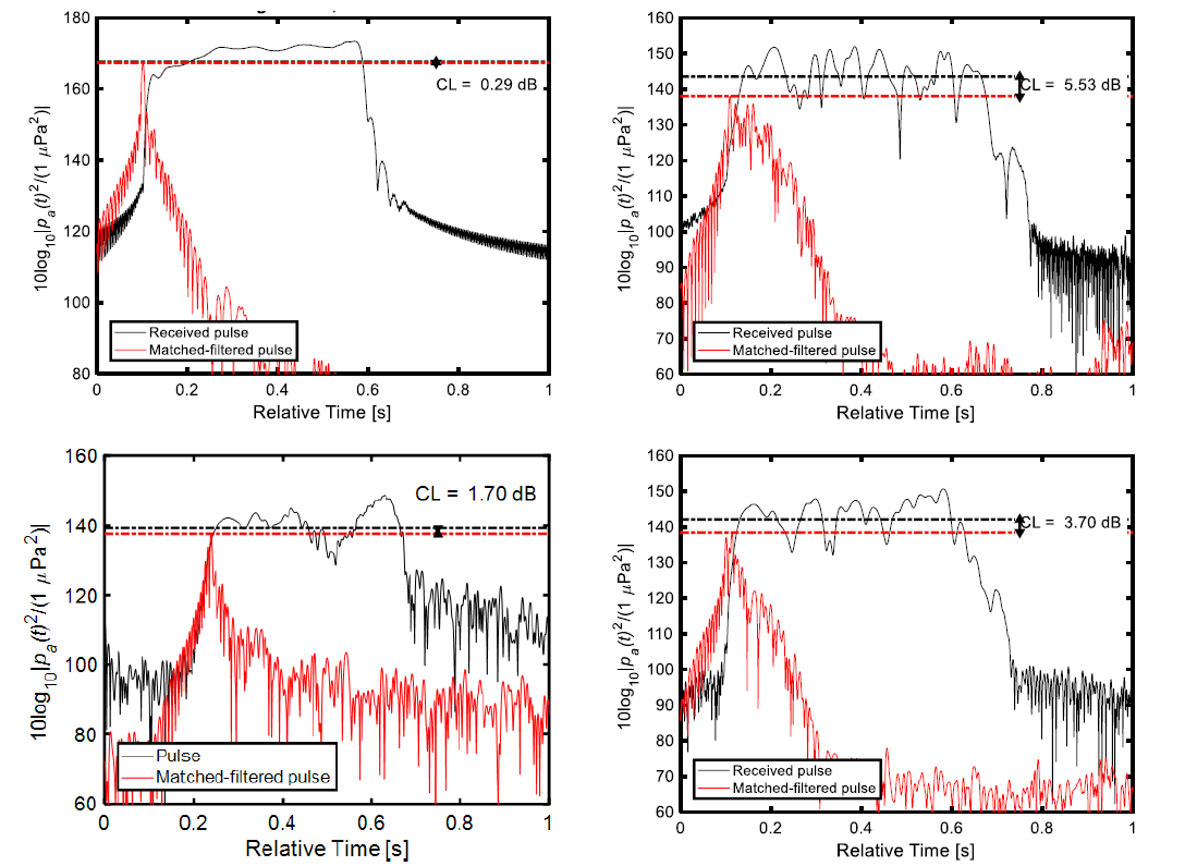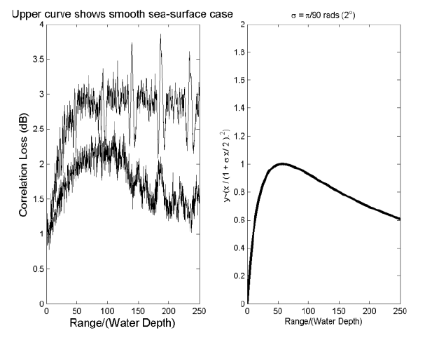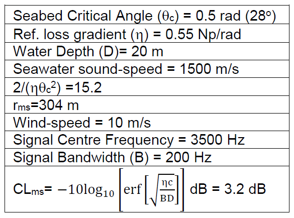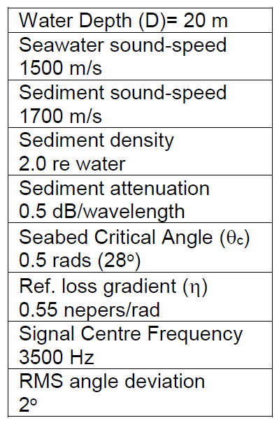 A A A Volume : 38 Part : 3 Proceedings of the Institute of Acoustics The influence on correlation loss of reflection from rough sea surfaces M.K. Prior, TNO, The Hague, Netherlands M.A. Ainslie, TNO, The Hague, Netherlands M.E.G.D. Colin, TNO, The Hague, Netherlands P.H. Dahl, Applied Physics Laboratory, University of Washington, USA D. Dall’Osto, Applied Physics Laboratory, University of Washington, USA D.D. Ellis, Mount Allison University, Sackville, New Brunswick, Canada P. Hines, Hines Ocean S&T Consulting Inc., Dartmouth, Canada S. Pecknold, DRDC Atlantic, Dartmouth, Nova Scotia, Canada R. van Vossen, TNO, The Hague, Netherlands 1 INTRODUCTION Acoustic propagation in shallow-water environments is strongly influenced by sea-surface interactions. Surface waves cause incident sound to be scattered over a range of angles, while air-bubbles beneath breaking waves increase acoustic attenuation and change local sound speeds via their influence on the average density and compressibility of seawater1, 2. The acoustic consequences of these surface effects cannot be considered in isolation and there is an interaction with the acoustic influence of the seabed. Sound incident on the seabed at low grazing angles suffers reflection loss as some proportion of the incident intensity is transmitted into the sediment, reflection loss being proportional to the grazing angle. This behaviour continues until a sharp rise in reflection loss around a seabed “critical angle” determined by the ratio of seawater and sediment sound-speeds. The changes of propagation angle undergone by sound incident on the sea surface will therefore have an effect on the reflection loss encountered during subsequent bottom interactions. Furthermore, the cycle distance of a ray (the distance between successive seabed reflections) is generally smaller for larger propagation angles. Consequently, an increase in propagation angle due to surface scattering will increase acoustic losses via a double effect of increasing the reflection loss per bounce and increasing the rate of surface interactions with range. This paper considers a situation in shallow-water with a rough sea surface. Acoustic propagation is predicted using numerical solution of the wave equation and closed-form expressions based on depth-averaged formulas for ‘mode-stripping’ conditions where seabed reflection loss is proportional to grazing angle3. Acoustic propagation is quantified via the familiar ‘propagation loss’ and also a ‘correlation loss’ that measures the reduction (due to multipath) in gains expected from replica-correlation of active sonar transmissions. Measured data gathered in an ocean-acoustic experiment carried out in the Gulf of Mexico are used to illustrate correlation loss. The following section discusses the experimental configuration and introduces the concept of correlation loss. The following section discusses the experimental configuration and introduces the concept of correlation loss. Section 3 presents numerical predictions of correlation loss and compares them with values derived from measured data. It then derives closed-form expressions for correlation loss and propagation loss for mode-stripping conditions in the presence of a rough sea surface. Limitations of the closed-form expressions are discussed. 2 THE TREX EXPERIMENT 2.1 General In 2013, the large scale Target and Reverberation Experiment (TREX2013) was organised4 near Panama City, Florida, supported by the U.S. Office of Naval Research (ONR). A specific run organised by Defence Research and Development Canada (DRDC) provided an opportunity to measure matched-filter gain in a characterised environment. During this experiment the DRDC SMART-ER echo-repeater5 was towed by CFAV Quest at increasing ranges from the Five Octave Research Array (FORA) 6 deployed by the Applied Physics Laboratory of the University of Washington (APL-UW) and Pennsylvania State University. In addition to the FORA data, acoustic recordings of the one-way-propagated field were made on a hydrophone co-located with the echo-repeater. Measurements of the surface roughness spectrum carried out by APL-UW 7 provided input for modelling the effect of the surface. 2.2 Correlation Loss Measurements Matched filter gain is equal to ten times the logarithm of the ratio of the signal to noise ratio after matched filtering (smf ) and before (s) : We define correlation loss (CL) as the difference between 10 log10 [BT] dB and MFG where B and T are the bandwidth and duration of the transmitted pulse: Correlation loss can be evaluated with the following expression8: where p(t) is the received waveform and pmf (t) is the matched filtered received waveform. Ifp(t) is a delayed and attenuated version of the transmitted waveform CL=0. This quantity can either be evaluated from measurements or from simulations. In the case of the TREX experiment, CL was estimated by considering the signal recorded at the DRDC echo-repeater5 deployed at depth of 6.5 m along the “reverberation track” of the TREX experiment. The echo-repeater was pinged at by an ITC 2010 ring deployed at 18.35 m with linear frequency modulated waveforms of 200 Hz bandwidth and 0.5 s duration. The results considered here are for a 3.5 kHz centre frequency signal. These time series were used to compute one-way correlation loss. Active-sonar echoes will be distorted by two-way propagation and by multipath imposed by target characteristics. The correlation losses here are therefore lower than would be observed with active-sonar echoes. 2.3 Sea-Surface Measurements In parallel to acoustic measurements, parameters of the sea surface were measured by a directional wave-buoy deployed by APL-UW7 on the acoustic path. This system recorded the directional sea surface spectrum over the duration of the experiment every 30 minutes. Based on these measured spectra, realisations of the sea surface were generated9. The spatial spectrum of such a realisation, us