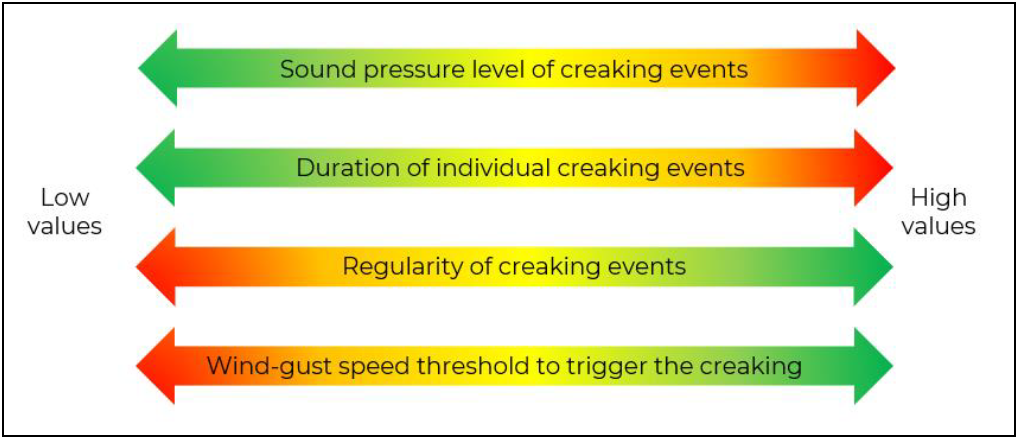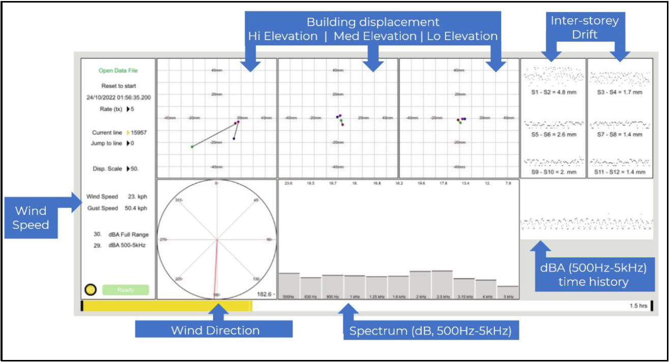 A A A Volume : 46 Part : 2 Proceedings of the Institute of Acoustics Wind induced creaking noise in tall buildings – Part 1 A. Korchev, Clarke Saunders Acoustics, UK E. H. Clarke, Clarke Saunders Acoustics, UK S. Dance, London South Bank University, UK O. Rispoli, London South Bank University, UK ABSTRACT During the last decade increasing numbers of high-rise apartment residents have reported disturbance from creaking noises seemingly generated within the building structure during high winds. It is a growing phenomenon as cities continue to build upwards, yet due to the sensitivity of the topic, it is seldom openly discussed. Building on experience studying the topic in a consultancy capacity, this research aims to address some of the key knowledge gaps, namely: identification of the mechanism generating the creaking; control measures that target the mechanism; and how the noise can be assessed to determine the relative magnitude of impact. Data from extended noise monitoring in affected rooms during a range of wind speed conditions, paired with targeted vibration measurements on various internal fit-out building elements have been used to study this issue. Findings to date demonstrate that the noise is generated when a building sways laterally due to wind loading. This leads to inter-storey drift causing rigidly fixed internal fit-out elements to rub against one another as they overcome static friction (or stiction). This releases energy which is manifested as noise when reradiated by connected elements. In steel frame wall constructions, this is found to primarily occur along the interface between the head track and studs. Mitigation therefore relies on mechanically decoupling the offending elements, whilst maintaining structural stability and safety. The paper will report on modifications which can achieve the necessary decoupling, and a methodology to assess the relative impact of the noise in modified and unmodified constructions. 1 INTRODUCTION Owing to the sensitivity of the topic, published research on wind-induced creaking noise is limited beyond the anecdotal sail-boat analogies published in popular media,[1] and as such, a significant knowledge deficit exists in the acoustics industry regarding the systems that cause the phenomenon and what can be done to mitigate it. This ongoing PhD research project therefore aims to assist acousticians in assessing the sound by focusing on four primary research directives, namely: 1) identifying the mechanisms that contribute to the sound; 2) developing a methodology to measure and assess the sound; 3) benchmarking existing mitigative systems and contributing to the development of a new system; and 4) developing a risk assessment that can be used during design stages to identify if a building may exhibit the sound. This paper focuses on identifying the mechanisms that contribute to the sound, the outcomes of early development of a measurement and assessment methodology and some high-level insight into mitigative efforts that can limit the occurrence of the sound. 2 MEASUREMENTS & MECHANISMS As for many acousticians professionally involved in the topic, the journey into this research began with a client enquiry regarding an uncommon sound within a tall building. The author, on behalf of Clarke Saunders Acoustics, visited the site to observe the sound as well as to conduct some early investigative measurements. These pilot studies included some attended noise monitoring within an affected building, paired with vibration measurements along various internal fit out elements within a wall. Vibration measurements along the various elements quickly gravitated to the boundaries between the studs and head-track as the data suggested that the epicentre of the sound was at these connections. Unattended noise measurements within affected areas of the building were then undertaken alongside wind measurements on the roof of the building, at a height of +10m. A careful review of the noise data exposed a clear character and pattern of the sound in both the time and frequency domains, which has been confirmed as part of long-term monitoring in a number of buildings exhibiting the creaking sound. In the frequency domain, the sound is typically limited between the 500Hz and 5kHz third-octave bands with varying dominant frequencies, typically around the 1kHz and 2kHz octave bands. In the time domain, the sound often varies in duration, with individual creaks often lasting between 1 and 2 seconds repeating rhythmically during peak wind conditions. This identification enabled a detailed analysis of noise and wind data. A review of the wind data showed that average wind speeds were not sufficient in identifying all creaking periods as these are typically measured in 10-minute durations as per BS EN IEC 61400-50-1:2022,[2] whereas 3-second gust speeds provided a clearer relationship with the creaking sound. The time histories of the datasets showed a good correlation (between 0.5 and 0.7) between the noise and wind data which made clear that the noise is indeed occurring during periods of sustained, increased wind speeds. A study of building displacement was then undertaken on a building which exhibited the sound. This featured a number of triaxial transducers placed at varying elevations of the building all monitoring movement at a time interval of 100ms. Noise was also measured at a rate of 100ms during periods of increased wind speeds. Due to the size of the dataset that was collected during these periods, a bespoke programme to analyse the data was required. A system was developed in the programming language Max.MSP to organise and visualise the data. An annotated still image of the system is presented in Figure 1. Figure 1: Bespoke noise / displacement programme The results of the study demonstrated that the noise occurs during periods of significant, sustained wind loading where higher levels of displacement were exhibited. As the building is loaded, the b