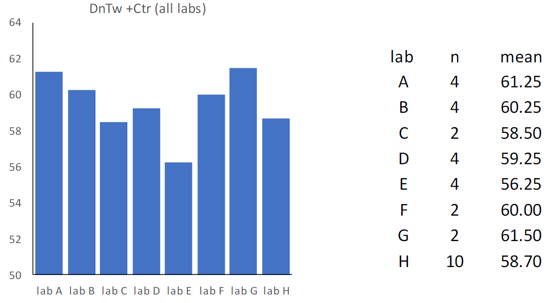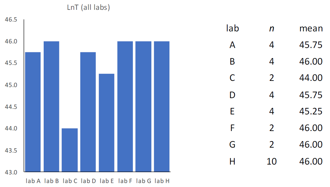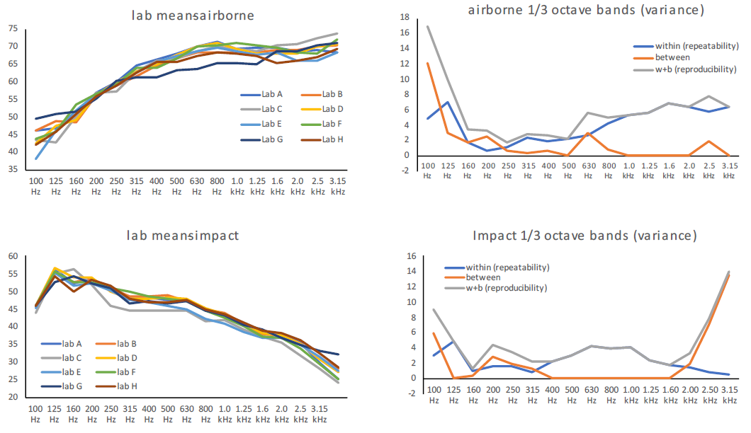 A A A Volume : 46 Part : 2 Proceedings of the Institute of Acoustics Measurement uncertainty in sound insulation Bill Whitfield, noise.co.uk Ltd, UK John Fenlon, University of Warwick, UK Laura Church, Vinci, UK 1 INTRODUCTION Eight acoustic laboratories took part in a Round Robin test in a Vinci Construction student accommodation block in East London in 2022. Both airborne and impact sound insulation testing was carried out on the separating floors following the test method requirements of Approved Document E of the Building Regulations. The paper describes the experiment procedure and the round robin repeatability and reproducibility results for the measurement systems. 2 METHOD 2.1 Field Testing - Sound Insulation The proposed method was that each lab would test the sound transmission through floors using their own standard equipment, with two engineers each taking two samples. In BS ISO 57251,2 testing is generally assumed to be a chemical sample, which is then sent to several laboratories for analysis, and the result determines two derivatives: repeatability and reproducibility, the first being the variance (variability) due to the taking of multiple samples by a single lab, and the second being reproducibility, the overall variance comprising both the within lab variance (repeatability) and the between lab variance, essentially the variance between the results of the different labs. The repeatability gives the ‘average’ variability taken by a specific lab, while the reproducibility is the variability to be expected if the result is sent to a random lab, i.e., any lab in the system. With sound measurement, instead of a control sample being sent to each lab, each lab visits a ‘control’ room and measures the sound profile with its own equipment. This is analogous to chemical tests in that different labs often have different equipment (i.e., purchased from different manufacturers) for conducting a specific chemical analysis. In the case of acoustic research, we might also expect some difference between engineers, so we have built that into the procedure as well. 3 ANALYSIS 3.1 Statistical Analysis The standard method of analysis for this type of data is called analysis of variance. For a particular set of observations, say DnT,w + Ctr for airborne measurements there will be an overall measure of the variability of the data called the variance – for the record, it is a statistical measurement of the difference between all the individual measurements and the average of them, and is given by where 𝑥𝑖 stands for the individual measurements (running from 1 to n), 𝑥̅ for the mean (average) of them, and the Greek letter Σ indicates summation. Analysis of variance enables the variance to be divided into components that indicate where the variation is concentrated. In these tests, we can draw out the variance due to repetition, i.e., the variance due to each engineer taking two (independent) measurements, essentially the variability between the pairs of measurements combined across all engineers; what remains is the difference between engineers. In the following, the breakdown is into these two components. Had all organisations complied with the ‘formal’ rules of two readings by two engineers it would be possible to break down the ‘between engineer’ variance (which is combined across all organisations) into two further components: between engineers within organisations, and between organisations. It is possible to make some estimate of these given the data we have but it is not entirely reliable because of the imbalance in the data. 4 RESULTS 4.1 DnT,w + Ctr (airborne) The mean results for DnT,w + Ctr are shown as a histogram and a table in Figure 1. The overall mean is 59.2 dB, although the mean of the lab means is 59.5 due to the different numbers of sample in each lab, and the lower mean of lab E. The statistical analysis relies on a method that takes the overall variance and splits it up into three components: a) the difference between the lab means; b) the difference between engineers in the same lab (combined across labs); and c) the difference between duplicate samples by an engineer (combined across all engineers). Item c is the repeatability, whereas item b includes the repeatability and the difference between engineers, while item a includes all three components. Figure 1: mean DnT,w + Ctr for all labs: labs means and replication (sample size) on the right To calculate the reproducibility the three components need to be extracted so that we can add the single components together – this is not the same as variance (a) because of the different levels of combination for the laboratories. In actual fact, as stated in the previous section, (a) and (b) have been combined, so we have a value for (c) of 2.781 (repeatability), while the combined value of (a) and (b) is 0.903. According to ISO 5725, the reproducibility is the sum of these two: 3.684 (reproducibility): essentially, the variance of taking an engineer and a reading at random. The variance is a square measure of variability; if we take the square root, we get a measure in the same units as the mean (dB) called the standard deviation, in this case 1.919 dB. The implication of this is that if we were to choose an engineer at random from one of the participating companies, then any measurement he/she takes would lie within ±2 x s.d. of the ‘true’ measurement 95% of the time. We don’t know the true measurement so we take the ‘consensus’ value of 59.2 dB, and we therefore expect a ‘random’ measurement (as defined above) to lie between 55.4 and 63.0 dB. If we try and break down the variation further, we are thwarted by the fact that different labs used different numbers of engineers, but the data suggest that the difference between engineers within the same lab was effectively zero, and the variation was due to lab differences. In practical terms this probably makes sense, accounting for diff
