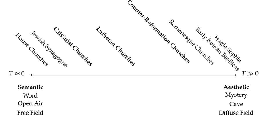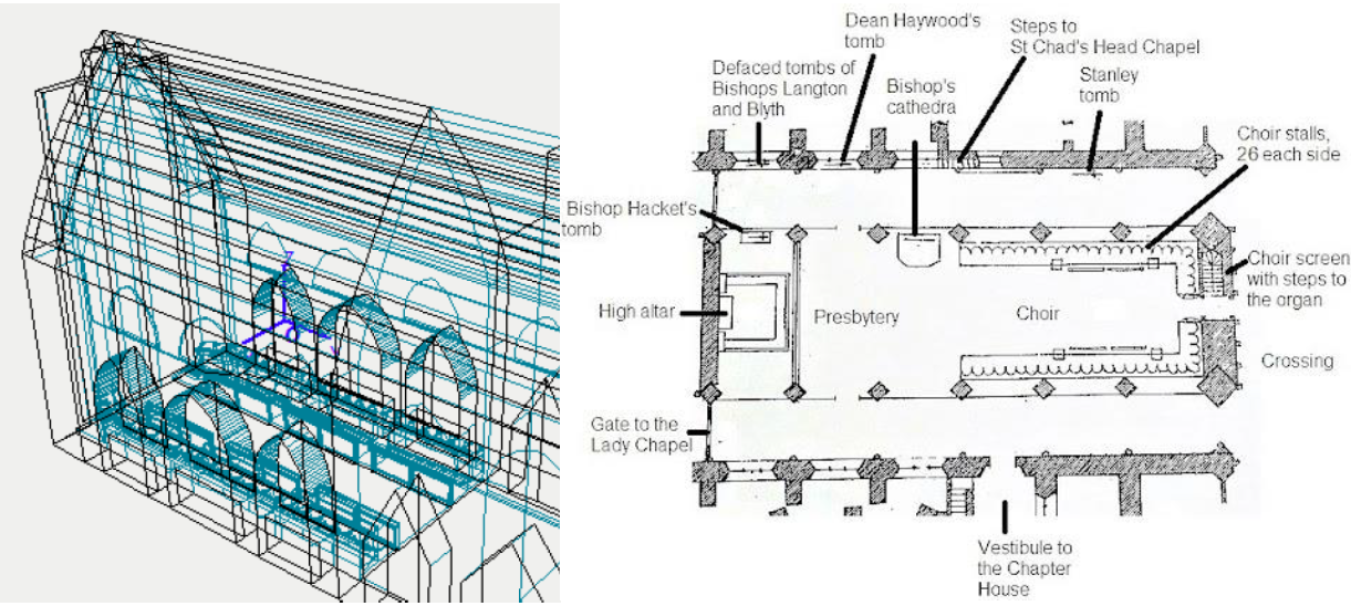 A A A Volume : 46 Part : 2 Proceedings of the Institute of Acoustics The historical auralisation of Lichfield Cathedral’s quire George Moore Birmingham City University, Birmingham, UK Benjamin West Birmingham City University, Birmingham, UK Islah Ali-MacLachlan Birmingham City University, Birmingham, UK 1 INTRODUCTION This project concerns acoustic models of Lichfield Cathedral’s Quire, both in its modern state and at three points throughout its history; these being a theoretical reconstruction of how it may have sounded from its Anglo-Saxon Christian roots and a model of its soundscape when the Quire was blocked off from the rest of the wider Cathedral. Once these models were constructed with adequate detail and accuracy, suitable auralisations were used to conduct a listening test, with listeners being asked to rate the soundscape of each model using a metric devised from contemporary research into an acoustic understanding of relevant religious history. Listener responses as well as raw data from the models allow determination on what differences present themselves between historical periods, as well as make conclusions as to the historical and cultural reasons behind those differences. This project bears a heavy influence from reasonably new advances in the sociological understanding of religion. In a break from its philosophical/theological roots, religious discourse since the turn of the century has begun to incorporate sociological ideas, studying religion from the outside rather than the inside, looking at the ways worship is performed between cultures or even between various religions.23 This came to a certain crystallisation with Whitehouse’s writings concerning “modes of religosity” at the turn of the millennium, designating two general categories of religion across all of human culture: “imagistic” and “doctrinal”22. This all is relevant to this project on account of a development of these categories that ties the theory together with acoustic theory. Braxton Boren’s 2021 paper “Word and Mystery” undergoes a psychoacoustic analysis of the Protestant Reformation, discussing how the radical differences in doctrine between the established Catholic Church and the burgeoning Protestant Reformation are actually echoed in the soundscapes present in their churches/cathedrals. In order to demonstrate this, he creates a two- point continuum along the descriptors “Semantic” and “Aesthetic”. In this continuum, a semantic space favours clarity of speech (exemplified by the free field “open air“ acoustic) in order to deliver religious revelation by way of scripture, to encourage a direct understanding of the religion by an individual – the “word” portion of Boren’s paper. Conversely, an aesthetic space favours the “mystery” portion of Boren’s paper, which means a space that focuses instead on creating an appropriate atmosphere for music and other more emotive religious factors, encouraging a personal relation with God experienced through emotional revelation, rather than an intellectualised understanding of religion (exemplified by the diffuse field “cave” acoustic)9. This semantic/aesthetic idea is used in the listening test in order to provide a metric for participants to understand and judge the auralisations by. Two snapshots of the history of the Cathedral were chosen to be recreated for the historic models. The first is its history as a Saxon Church. BBC History and the Victoria History of Lichfield state that prior to the Norman Conquest of England, the site that is now the Cathedral was a Saxon wooden church, roughly in the area which is now the Quire. Whilst detailed architectural details of the area at this time are not available, an approximation of the distinct soundscape present at this early point in its history is created by modelling a very simplified version of the Quire as a wooden construction. The second point relates to a large reconstruction performed in the Cathedral around the 16/1700s, introducing neo-gothic architectural approaches to the Cathedral. In a controversial “modernisation”, James Wyatt performed a drastic change specific to the Quire area. Prior to this reconstruction, the Quire was separated from the rest of the Cathedral proper by a heavy stone screen, which created an isolated acoustic environment within the Quire. A drawing by Wyatt from before his reconstruction was used to recreate the Quire in this isolated state, allowing auralisations to show the sound in the Cathedral prior to its neo-gothic modernisation.7, 10, 18 2 METHODOLOGY 2.1 Measurements Acoustic measurements of the Quire were taken in accordance with ISO 3382-1. In order to take measurements more appropriate to the unique acoustic character of a worship space2, Martellotta’s 2009 guidelines for the acoustic measurement of churches were followed. The equipment used was specified deliberately to satisfy Martellotta’s “intermediate” configuration in his paper concerning the acoustic measurement of churches. This configuration calls for an omni-directional electro-acoustic sound source, a receiver measurement microphone with an omni-directional pattern, and a deterministic noise source (in this case a sine sweep) recording in octave bands up to 8kHz17. The chosen sound source for this task was the NTi DS3 dodecahedronal loudspeaker, and the microphone chosen was an Earthworks M32mp measurement microphone. The sine sweep was generated via “Room EQ Wizard”, a powerful piece of freeware that allows for extensive acoustic measurement within spaces using a source/receiver configuration like this. The metrics it measures also satisfy Martelotta’s “intermediate” requirements. It measures reverberation in T20 and T30, as well as measuring many other metrics such as early reflections, as well as generating an SPL curve to determine which frequencies are amplified and which are attenuated within the space. The measurements 