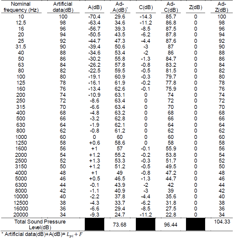 A A A Volume : 46 Part : 2 Proceedings of the Institute of Acoustics Why A-weighting Network is inadequate for measurement of noise with high content of infrasound and low frequency noise (ILNF)? Hadi Asady1, Mariana Alves-Pereira2, Mohammad Bakhtiari3, Adrian Fuente4, Siamak Pourabdian1, Farhad Forouharmajd1,* 1Department of Occupational Health Engineering, School of Health, Isfahan University of Medical Sciences, Isfahan, Iran. 2School of Sciences for Economics and Organizations, Lusofona University, Lisbon, Portugal. 3Behbahan Faculty of Medical Sciences, Behbahan, Iran. 4École d’orthophonie et d’audiology, Faculty of Medicine, Université de Montréal, Montreal, Quebec, Canada. 1 INTRODUCTION Humans with normal hearing are able to detect sounds that fall within a frequency range from about 20 Hz to 20 kHz, with the upper limit dropping off somewhat in adulthood. Not all mammalian species are sensitive to the same range of frequencies, and most small mammals are sensitive to very high frequencies but not to low frequencies[1]. As can be seen in Figure 1 the human auditory system has threshold less than or equal to 10 dB for frequency range between 250-8000 Hz. Figure 1: Audiogram showing the average human threshold for pure tones obtained in a sound field, hearing range is usually specified as the range of frequencies audible at a level of 60-dB SPL[2] With decreasing of the frequency from the 250 Hz to lower frequencies the human hearing threshold increase and the sounds with level less than those thresholds are not auditable by most of humans. In the other words the sound level less than the human hearing threshold at the low frequencies (20<=f<=200 Hz) [3, 4] and infrasound (f<20 Hz) will not be detected and perception. This fact was reflected in the A-weighting network. The A-weighting filter was born with the work by Fletcher and Munson to determine loudness level contours for various sound levels. They selected 23 healthy, young males, whom were assumed to have good hearing. These subjects were exposed to a series of different, single, pure tones at different levels of loudness and asked to score the sounds for equal loudness. The tones, produced by valve oscillators and amplifiers, were presented to the listener by occluded (covering the ear) headphones. The basic range of 20 Hz to approximately 16 kHz was used because those were the limits of the equipment at the time[5]. Figure 2 shows the Fletcher and Munson loudness curves from their 1933 paper. Three years later, these curves were used in the first American standard for sound level meters developed by the Acoustical Society of America[6]. Figure 2: Loudness level counter[7] Historically, the A weighting network on a sound level meter were derived as the inverse of the 40 dB Fletcher-Munson curves and used to determine sound level. Since A-weighting correction are too large for low frequencies[8] so we expect that carry out measurement of low frequency noise with using of this network underestimate the results too much. this problem was reported by some researchers. Alves-Pereira and et al. reported that the LFN components of noise-rich environments are most often unknown because noisy environments are usually only described by a dBA-level measurement[9]. Baliatsas and et al. showed that an issue of importance in terms of exposure characterization is the weighting method used to measure LFN. A-weighting is widely used in public health research. Adapted to the sensitivity of the average human ear, sound level meters set to the A-weighting network cannot efficiently evaluate the contribution of LFN components, since the human ear is less sensitive to very low-pitch or high-pitch noises[10]. The question is why A-weighting network is unappropriated for measurement of noises with high content of infrasound and low frequencies? Or approximately equal content of different frequencies including infrasound, low and high frequencies. We will try to answer to this question. 2 MATERIALS AND METHODS At this part we used methods and equations which presented in the IEC 61672-1 as an international standard[11] for calculation of A, C and Z frequency-weighting networks. 2.1 Frequency-weighting C For any frequency f in hertz, the C-weighting characteristic C(f) shall be calculated, in decibels, from: Normalization constant 𝑪𝟏𝟎𝟎𝟎 represents the electrical gain, in decibels, needed to provide a frequency weighting of 0 dB at 1000 Hz. We can calculate 𝑪(𝒇) with using of formulas and values which presented in table 1 and 2. Table 1: Table 2: 2.2 Frequency-weighting A The A-weighting characteristic 𝑨(𝒇) shall be calculated, in decibels, from: Normalization constant 𝑨𝟏𝟎𝟎𝟎 represents the electrical gain, in decibels, needed to provide a frequency weighting of 0 dB at 1000 Hz. We can calculate 𝑨(𝒇) with using of formulas and values which presented in table 2 and 3. Table 3: 2.3 Frequency-weighting Z For any frequency in the range of a sound level meter, the Z-weighting characteristic 𝒁(𝒇) shall be given, in decibels, by 𝒁(𝒇) = 𝟎 𝒅𝑩 Equation 3 2.4 Converting formula The formula for converting octave-band sound pressure levels into sound levels on the X-weighting network is: LX-weighting (dB): Sound level on the X-weighting network, X being C, A or Z. Lpi (dB) = Sound pressure level for the ith octave band, F(dB) = Correction factor, 3 RESULTS With using of formulas 1, 2,3, weight values related to the three different weighting network including C, A, Z were calculated at different frequencies (related to the one-third octave bands) (see table 4). As you can see in table 4 highest weight was related to the frequency 10(Hz) for both A and C weighting network. The weighing increase with increasing of frequency from 10 to 5000 Hz and 10 to 160 Hz in the A and C weighing network respectively and after those frequencies starting to drop. For C-weighing network weight for nine frequ