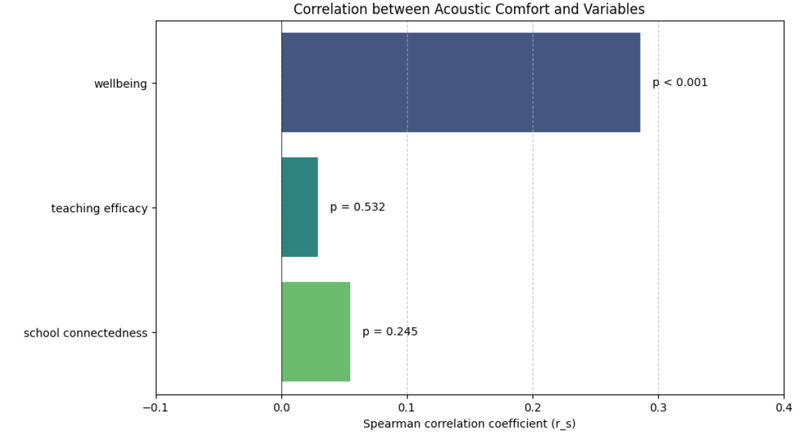 A A A Volume : 46 Part : 2 Proceedings of the Institute of Acoustics Association between perceived acoustic comfort and wellbeing for schoolteachers at work: A cross-sectional survey in the UK Hatice Kurukose Cal, UCL Institute for Environmental Design and Engineering, The Bartlett, London, UK Francesco Aletta, UCL Institute for Environmental Design and Engineering, The Bartlett, London, UK Jian Kang, UCL Institute for Environmental Design and Engineering, The Bartlett, London, UK 1 INTRODUCTION The impact of school acoustics on both students and teachers is critical. Although the negative effects of noise on teachers have been investigated, research has primarily concentrated on its impact on children. For instance, studies have shown that noise can lead to stress in children, potentially resulting in health issues such as asthma, fatigue, and headaches(1). Additionally, noise has been associated with decreased memory, lower motivation, and impaired reading skills in school children, which can negatively impact their academic performance(2). Moreover, studies demonstrated the effects of reverberation and noise level on student’s concentration engagement and overall wellbeing(3). In terms of age-related differences, noise negative effects on both primary and secondary school children have been studied(4,5,6). It is apparent that the negative impacts of school acoustic on children have been studied extensively, as they are primary occupants of schools. However, teachers spent a significant amount of their lifetime in schools. While the large numbers of students make their experience important, it is also crucial to study the effects of noise on teachers' perception, health, and wellbeing. Noise has been identified as a primary factor contributing to discomfort in teachers' workplaces, potentially leading to vocal health issues(7,8). In particular, high reverberation and background noise levels can affect teachers' concentration, leading them to raise their voices, which can further strain their vocal health(9). According to research, acoustic conditions in classrooms have been linked to vocal health concerns for teachers, emphasizing the need for attention to classroom acoustics to support teacher wellbeing(10). It is likely that, poor acoustic environments affect teachers' not only physical health, but they can also impact teachers’ mental health and overall wellbeing. Teachers' wellbeing could be directly affected by where they work. The state of overall health and satisfaction experienced by individuals in relation to their work environment refers to Job specific wellbeing. Teachers' job specific wellbeing is a crucial aspect with significant consequences for both educators and students. Several factors can influence teacher wellbeing, including work related stress, availability of support, and the overall school environment(11). Family support, positive teaching profession, and a supportive school environment can be essential elements in improving teachers' wellbeing. Among these factors, the physical environment within schools, covering factors like classroom acoustics, lighting, and thermal conditions, can also impact teacher wellbeing(12). Excessive noise levels in classrooms, for instance, have been associated with acoustics related symptoms among teachers(12). Research has indicated that noise and poor classroom acoustics can affect teachers' overall wellbeing(13). Studies highlight that poor acoustic conditions are associated with negative effects on teachers' vocal health and overall wellbeing(14). Not only poor acoustic conditions and noise but also overall school soundscape found crucial for enhancing learning environments and reducing stress(15). The literature emphasizes the need for improved soundscape in schools to support teacher health and wellbeing. Therefore, addressing both the psychosocial and physical aspects of the school environment is essential to promote and maintain teacher wellbeing. Moreover, it is critical to see how teachers’ job specific wellbeing relates the acoustic environment of schools. The primary objective is to investigate the relationship between acoustic comfort and teachers’ job specific wellbeing. The acoustic environment plays a crucial role in creating a conducive learning environment for both students and teachers. However, the impact of acoustic comfort on the wellbeing of teachers remains an area that requires further exploration. Examining the correlation between acoustic comfort and teacher wellbeing aims to shed light on the potential effects of noise, sound quality, and overall soundscape on teachers' daily experiences. In this study, it is questioned whether there is an association between perceived acoustic comfort and teacher wellbeing in school environments. The findings from this study will contribute to the existing body of knowledge in the field and provide insights for educational institutions to improve the acoustic environments within their facilities. This knowledge may inform strategies for improving school environments to better support teacher wellbeing. 2 METHODOLOGY An online questionnaire targeting UK teachers was developed as the method to collect information on teachers' well-being and overall acoustic comfort. The questionnaire was distributed to 480 teachers. Following data cleaning, 28 questionnaires were discarded, leaving a final sample size of 452 teachers. 2.1 Participants A total of 452 teachers from various UK educational institutions participated in this study, selected through random sampling to ensure a representative sample and decrease selection bias. Participants were recruited via Prolific an online questionnaire participant recruitment tool(16). The sample was designed to cover a wide array of teaching experiences, educational backgrounds. Ethical approval was obtained from the UCL BSEER Local Research Ethics Committee. The study achieved a margin of error of about 4.6% at a 95% confidence l