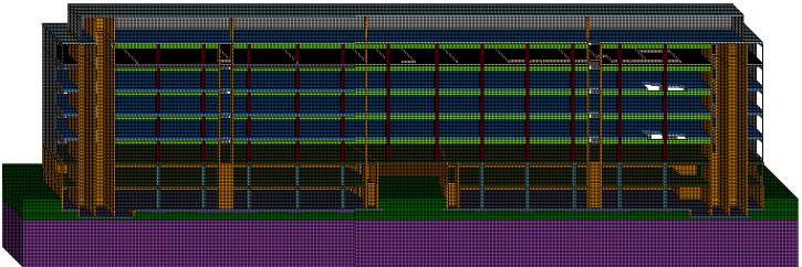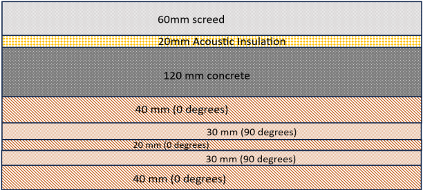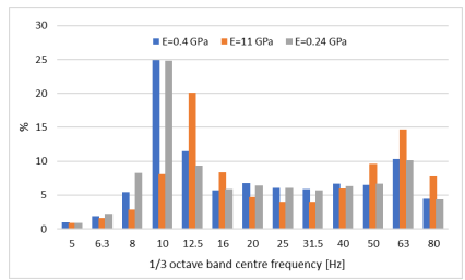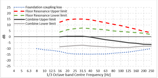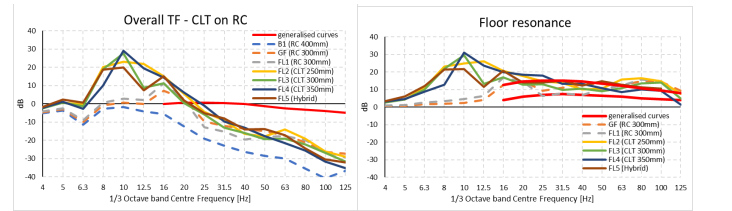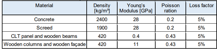 A A A Volume : 46 Part : 2 Proceedings of the Institute of Acoustics Investigating vibration effects on wooden frame buildings: A focus on CLT response to traffic-induced vibration J. D’Avillez, WSP, Birmingham, UK Jorge.deAvillez@wsp.com Z. Yang, WSP, Manchester, UK River.yang@wsp.com 1 INTRODUCTION Wooden frame buildings, especially those constructed with Cross-Laminated Timber (CLT), have become increasingly popular due to their sustainable nature and structural efficiency. Nevertheless, there are ongoing concerns about their vulnerability to environmental vibration, particularly those caused by nearby traffic, which may pose risks to the building's serviceability. CLT is a complex material to be modelled as it relies on multi-layer with anisotropic properties. This study will evaluate the effectiveness when employing a simplified CLT modelling strategy. And will evaluate the environmental vibration impact on a mix construction (concrete and wooden frame). 2 BUILDING RESPONSE TO ENVIRONMENTAL VIBRATION When vibration transfers from open ground (free-field) into a building, its magnitude and phase will change at the surface-building interaction due to impedance mismatch between propagation media (ground structure) and the building structure. To simplify the modelling process when assessing building response from environmental vibration, a set of ground-to-building transfer functions, empirically derived, has been compiled by previous publication 1,2,3 . These transfer function curves indicate that conventional residential buildings with spread footings up to 4 stories high can experience vibration attenuation of up to 12 dB around the 63 Hz 1/3 octave-band. They also suggest that heavier building constructions generally exhibit greater coupling loss. Once the vibration reaches the foundation, it propagates through the building's primary structure, including load-bearing external walls, structural columns, and floor slabs, typically losing some energy along the way. Figure 1 presents the generalized empirical curves typically used when carrying out an environmental impact assessment to establish the vibration impact on building from passing trains. The foundation coupling loss has been derived from measurements on heavy masonry buildings. The floor resonances are measured on typical mid-size rooms (in the 1970s) from city apartment buildings. The overall transfer function is the combining effect from both the coupling loss and the floor resonance. Figure 1: Generalised empirical curves2. Recent years have witnessed significant changes in construction methods, particularly in internal structures where lightweight construction materials like CLT floor plates. 3 MODELLING PROCESS 3.1 Modelling Tool To evaluate the building response from traffic-induced vibration, FINDWAVE® 4 , a well-established three-dimensional finite difference time-domain numerical model (FDTD) which computes the propagation of waves in elastic media, has been used. The vehicle module, forcing function, represents the train as a stack of damped masses and springs. The dynamic excitation is provided from an input file containing an assumed vertical rail profile. The environment module (e.g. rail/ground/building) models the dynamic behaviour of the rail surface supporting the vibration source (e.g. train), and the medium surrounding it, e.g. soil or air, together with structures below or above ground level. The structures of concern are represented by cells in a 3-dimensional orthogonal grid; and to each cell is assigned density, Lamé constants and loss factor. By creating a representation of the system of elastic materials as a three-dimensional array of discrete cells, each possessing the four fundamental properties of an elastic medium, namely shear modulus, compression modulus, density and loss factor, and applying the rules of wave propagation in elastic media, it is possible to represent the real-life behaviour of the system, subject only to the accuracy of the parameters used and the limitations of the size of the cells in the array. To account for complex geometries the cell parameters (density and Lamé constants) are scaled accordingly to capture the static and dynamic behaviour of the elements being modelled. For example, with the appropriate scaling a rectangular element, which is defined by a cell, will be able to approximate the dynamic behaviour of an I-beam. Given the small level of vibrations, it is assumed that the connections between beams and columns are rigid (e.g. beams and columns use the clamped boundary condition). 3.2 Test Building Design For this study a prototype building of a mixed construction (see Figure 2) will be assessed under the influence of rail traffic using the above mentioned FDTD method. Figure 2: Isotropic view taken from the numerical model showing the building under evaluation. The building, which is supported by a reinforced concrete foundation, spans a footprint measuring 100 m in length and 17 m in width. Concrete structures, such as columns and floorplates, forms the building structure from the basement up to the first-floor level. Transitioning from the second floor upward, wooden structural elements such as façades, floors, columns, and beams are utilized. There are five core structures (elevators and staircase shafts) rising from basement up to the sixth-floor level providing adequate constrain to the wooden frame. From the ground floor to the first level, the floor structure comprises concrete slabs upheld by concrete columns arranged on a 7 by 5.5 m gride. The perimeters of these floor structures are securely fastened to the concrete façade (clamped). This layout remains uniform across all levels, with only the materials varying. Starting from the second floor and extending upwards, wooden columns are utilized exclusively. Moreover, all CLT floorplates are further supported by two parallel beams fixed to the columns, running along the building's length (see Figur