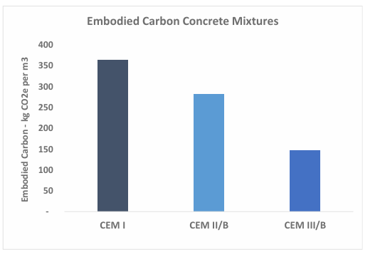 A A A Volume : 46 Part : 2 Proceedings of the Institute of Acoustics Reducing embodied carbon in heavyweight acoustic design T Van Dongen Mason UK Ltd, Farnham, Surrey, United Kingdon 1 INTRODUCTION Heavyweight materials are a common feature of good acoustic design, for several key reasons outlined in the following section. Unfortunately, heavyweight materials are typically correlated with increased levels of embodied carbon, both in terms of production as well as material handling. This paper examines potential avenues for reducing embodied carbon within heavyweight acoustic design, with minimal or no loss in performance. The aim of this paper is to be agnostic to the supplier of the acoustic isolators; for the purposes of this analysis, only the embodied carbon of the mass layers is considered, with the aim to make the findings applicable to all suppliers and installers of acoustic isolation systems. 2 HEAVYWEIGHT MATERIALS IN ACOUSTIC DESIGN 2.1 Reasons for use Heavyweight materials are a mainstay of acoustic design for one principal reason: performance. The generally accepted golden rule of acoustics comes down to, “the heavier, the better”. For a given amount of disturbing energy in the form of sound or vibrational energy, a heavier material will respond with a correspondingly lower amplitude response; the more mass, the harder it is to move. Given that practical limits are unavoidably placed on the allowable depth for a given acoustic system, high density heavyweight materials become a practical necessity. Within the context of this paper, heavyweight materials are defined by their high mass, or relatively high mass within their product category; cement particle board for example will have a significantly higher mass at a given thickness than acoustic rated plasterboard, but both would be considered heavyweight materials owing to their positioning compared to lightweight options within their category (plywood and standard plasterboard respectively in this example). Cementitious screeds, concrete and steel are the main other materials under consideration as heavyweight materials. One idea often put forward is to design out the need for such materials and this is unquestionably the best strategy for achieving the most significant carbon savings. However, that is not within the scope of this paper, wherein the working assumption is that the heavyweight constructions being considered are necessary to achieve the required level of performance, which is a realistic boundary condition in practice; sometimes there is no workable alternative to a heavyweight system from a practical and performance standpoint. 2.2 Sustainability Issues The principal concern with heavyweight materials comes down to their relatively high embodied carbon content. Concrete and other cementitious materials account for approximately 8-9% of all carbon emissions worldwide1, for example, while steel production accounts for approximately 7% of global carbon emissions2. By contrast, timber-based materials can actually have negative global warming potential (GWP total as defined within the context of an Environmental Product Declaration (EPD)) owing to their negative GWPbiogenic value, explained by the planting of new trees to replenish stock of trees felled in production3. Nuance should be considered when using this figure, as the GWPfossil figure quoted in an EPD can be quite high and the practical reality of the situation should be considered; is it really correct to say that adding unnecessary timber materials to a building will bring down its overall content of embodied carbon? Common sense would dictate that can’t be correct. For this reason, the end of life of a material has to be considered when using including carbon storage for GWP comparisons, as that carbon will be returned to the environment at the end of service life, either by decaying in landfill or through incineration for energy production. 3 COMMON HEAVYWEIGHT MATERIALS 3.1 Concrete Concrete is composed of four basic ingredients: cement, aggregate, sand and water. There are other minor additives, but the vast majority is comprised of those four ingredients and of those, over 70% of the embodied CO 2 comes from the cement content alone1. Cement comes in a variety of forms, from CEM I through to CEM IV, with the Portland cement content varying depending on the type, with cement replacement content varying in accordance. See figure 1 for a comparison of the material properties of different cement types relative to CEM I. Figure 1: Table of comparison for different cement types5. Portland cement is manufactured by heating limestone with aluminosilicate minerals (usually in the form of clay) to form relatively large lumps, referred to as clinker, which is then ground into a fine powder with approximately 5% gypsum added1. CO2 is released as a direct by-product of this process, as well as from the combustion of the fuel needed to heat the mixture up to 1450°C. Given that the manufacturing process of cement is so energy and carbon intensive, this explains why it contributes the vast majority of the embodied carbon in any given concrete mixture. As an aside, the sand, water and aggregate needed as the other main constituents of concrete are locally sourced and as such their secondary contribution varies from region to region. Given that cement is both the main source of embodied carbon and a centrally manufactured product compared to the other constituents, as well as having the most actionable routes for reducing carbon contribution, this will be the main focus of this portion of the paper. The main strategy for reducing embodied carbon in cement is to increase the quantity of cement replacement material, chief among which are fly ash, which is a by-product of coal fired power stations, and ground granulated blast furnace slag (GGBS), which is a by-product of steel production. These cement types are typically referred to as “blended” as opposed t