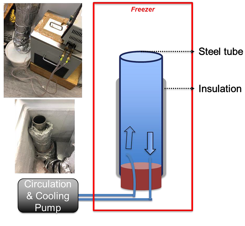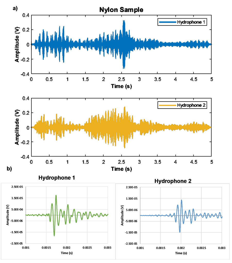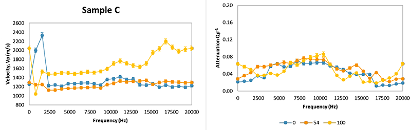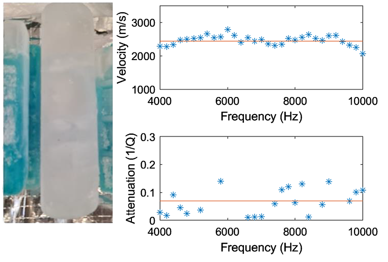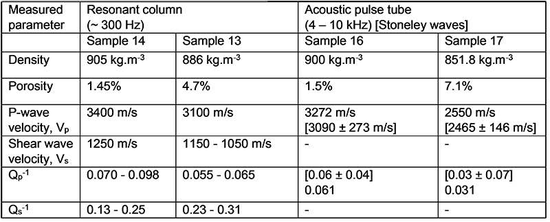A A A Volume : 46 Part : 1 Proceedings of the Institute of Acoustics Laboratory acoustic pulse tube studies for seafloor and sea ice greenhouse gas quantification AI Best, SK Sahoo, LJ North, National Oceanography Centre, Southampton, United Kingdom BN Madhusudhan, H Sutiyoso, University of Southampton, Southampton, United Kingdom O Sanford, T Clarke, Defence Science & Technology Laboratory, United Kingdom 1 INTRODUCTION The acoustic pulse tube, or impedance tube, is a useful method for quantifying compressional wave properties of various materials. We use an instrument designed for studying wave propagation in porous media, especially seafloor sediments and latterly sea ice, and for broader applications to ocean acoustics research. Notable design improvements over extant systems include full ocean depth pressure rating (60 MPa), the ability to extract broadband signatures over 1 – 20 kHz using a novel sonar projector with a transmission line calibration/modelling approach, and jacket designs allowing porous medium effective pressure control. The temperature can be controlled between -5°C to 55°C. We obtain complementary shear wave velocity and attenuation measurements at 200 – 500 Hz (depending on material properties) using a separate geotechnical resonant column instrument rated to 20 MPa effective pressure with temperature control between -20°C to 20°C. Novel scientific results on synthetic sea ice cores with different air contents, and sand samples as a function of water saturation and pressure, provide insights into wave propagation mechanisms for these complex porous media. The data are suitable for modelling using effective medium theoretical approaches (e.g. modified Biot theory1 to estimate the volume and distribution of free gas, needed for constraining impacts of greenhouse gases in the seafloor and in sea ice, of interest to climate research in rapidly changing polar regions. We present below an overview of novel instrument developments and some example scientific results. 2 LABORATORY MEASUREMENTS 2.1 Acoustic pulse tube experiments on ice and sand samples An acoustic source (located at the base of a 4.5 m long, 70 mm internal diameter, stainless steel, thick-walled tube filled with water; see Figure 1b) projects a Stoneley wave that approximates a plane wave propagating up the tube through the test sample suspended halfway2. Hydrophones in side-wall ports below and above the test sample record the acoustic signals from which sound wave velocity and attenuation (Q -1 ) frequency spectra are calculated with respective accuracies of ± 2.4% and ± 5.8% for jacketed sediments, and ± 10% and ± 15% for synthetic ice samples (using a different arrangement shown in Figure 1a). Figure 1: Cross-section through the acoustic pulse tube showing different arrangements for measurements on a) ice cores, and b) sediment samples. The main innovation from the method presented in McCann et al.2 is the ability to extract spectral signatures over the 1 – 20 kHz bandwidth, as opposed to single average values of velocity and attenuation over the frequency bandwidth. An acoustic chirp pulse is projected into the pulse tube and the recorded signals are deconvolved to obtain the time series of transmitted and reflected broadband pulses at the hydrophones. Example chirp and deconvolved time series are given for a Nylon calibration sample in Figure 2. For samples suspended inside the tube (Figure 1b), we use the scattering matrix method to remove the effects of extraneous reflections from the pulse tube end caps and multiple reflections from the sample ends. See Equation 1 and Figure 3. We assume that the tube system is a 1-D transmission line with one input and one output without any harmonic distortion. The wave is assumed to propagate only in one dimension, i.e., a plane wave without any propagation at the sidewalls, multiple paths, or shear-wave coupling. where A represents the incoming wave from the sound source and reflections from the bottom endcaps of the pulse tube, B is the reflection from the sample, C is the outgoing wave from the sample, and D is the second incoming wave from the reflection from the top pulse tube endcap. To simplify Figure 2: Example acoustic pulse tube time series for a Nylon calibration sample recorded at Hydrophones 1 and 2 in Figure 1. a) Raw chirp data, b) Time gated first arrivals of deconvolved signals (note relative time scale). After Sutiyoso et al.3. the calculation, we assume the sample is cylindrically symmetrical. The attenuation Q -1 (inverse of the quality factor Q) is calculated from the complex velocity output from the scattering matrix method according to4 where ν1 and v2 are the real and imaginary parts of the complex velocity, respectively. The time series of the water-filled pulse tube both with and without the sample are required in the above analysis. A frequency domain analysis is used to represent the geometry of ice samples floating on top of the water column without a metal end cap (Figure 1a). Figure 3: Transmission line model for extracting acoustic velocity and attenuation spectra from pulse tube time series. After Sutiyoso et al.3. 2.2 Sediment and synthetic sea ice sample preparation Sample preparation is an important step in the experimental work requiring a number of considerations. For loose seafloor sediments such as gravel, sand and mud, the method lends itself to either sub-sampling of actual seafloor sediment cores 2 or use of synthetic granular materials (e.g. quartz sand packs 3 ). In both cases, the sediment must be enclosed inside a jacket to maintain integrity inside the pulse tube. The jacket can be made from a range of materials, such as plastic tubes with sealing endcaps that can slide up and down inside the jacket to accommodate the strain resulting from applied external and internal pore fluid pressures. For geological materials, it is important to control both confining and pore fluid pressures to replicate th