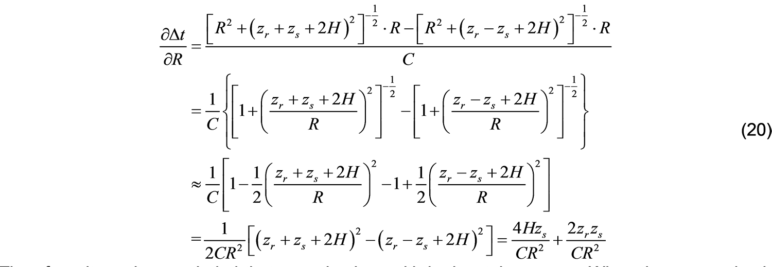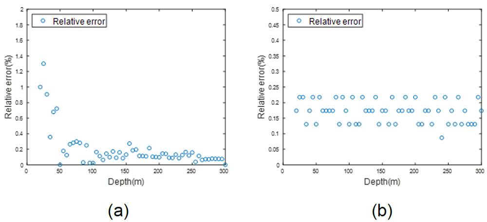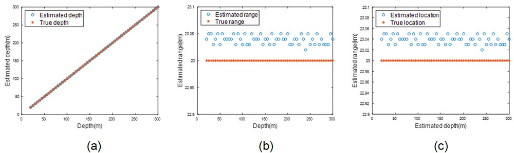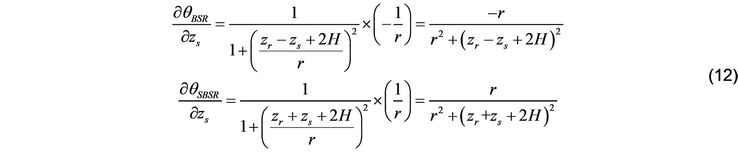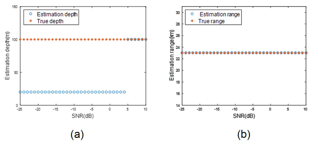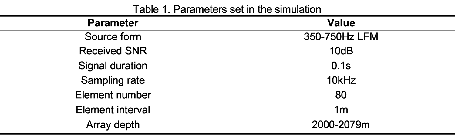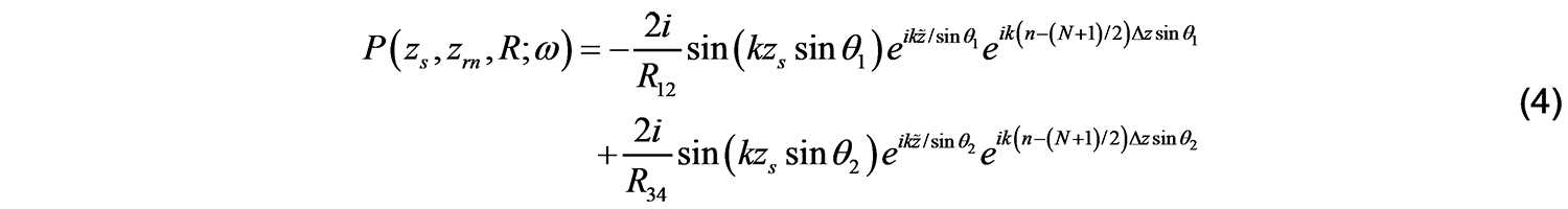 A A A Volume : 46 Part : 1 Proceedings of the Institute of Acoustics A joint estimation method of underwater source range and depth in deep ocean bottom bounce area Chenyi Xu, College of Underwater Acoustic Engineering, Harbin Engineering University, Harbin, China Shengchun Piao, College of Underwater Acoustic Engineering, Harbin Engineering University, Harbin, China Junyuan Guo, College of Underwater Acoustic Engineering, Harbin Engineering University, Harbin, China 1 INTRODUCTION In recent years, the research on ocean has gradually moved from shallow sea to deep sea. Deep sea source positioning is an important issue in passive underwater acoustic detection. Since the sound field in the shallow sea is different from the deep sea, the positioning method is different in the two environments. Matching-field processing (MFP) technology is the most commonly used method in deep-sea passive positioning. It can be traced back to the 1980s, Fizell and Wales used a vertical array combined with MFP to achieve successful localization of long-distance sound sources in the Arctic Ocean1. Transfer and Hodgkiss conducted deep-sea matching field positioning experiments in the northeastern Pacific Ocean. In the range direction, the estimation results were good; in the depth direction, the estimation results were poor2. Lei used a dual-sensor vertical array to locate the target by matching the cross-correlation function of the signals received by two hydrophones3. Although the effectiveness of MFP has been proven by a large number of experiments, it is difficult to make progress because it is highly sensitive to the environment. Environment-focused MFP and Bayesian MFP methods have been proposed to solve the environment mismatch problem, but they have high real-time requirements4-5. This paper uses Bellhop to simulate the arrival signal of the vertical array located in the deep ocean bottom bounce area to obtain the multipath structure. For the sound source near the sea surface, a sound source positioning method matching the vertical arrival angle of the specified sound ray and the corresponding multipath delay difference is proposed. The effectiveness of this method is analyzed by simulation, and the results show that it can provide the basis for the deep ocean bottom reflection signal localization. 2 ANALYSIS OF THE MULTIPATH ARRIVAL STRUCTURE OF THE OCEAN BOTTOM BOUNCE AREA When the sound source and the hydrophone are both near the sea surface, the deep-sea sound field can be spatially divided into direct area, shadow area, and convergence area according to the range. Figure 1(a) shows the sound speed profile (SSP) used in the simulation, where the sea depth is 4400m and the channel axis depth is 1046m. It is assumed that the seabed type is acoustic half space, the seabed sound speed is 1550m/s, the seabed density is 1.6g/cm3, and the absorption coefficient is 0.2dB/λ. The ray model is selected and Bellhop is used for simulation. The depth of the sound source is 200m, the frequency of the sound source is 550Hz, and the acoustic propagation path is shown in Figure 1(b), and the acoustic propagation loss is shown in Figure 1(c). Figure 1(c) shows that the propagation path forms a convergence area with a width of several nautical miles and a depth of several hundred meters near 60km and 120km. There are shadow areas between 6~55km and 65~115km, which are inaccessible to direct waves. The sea-bottom bounce area of interest in this paper mainly consists of the primary seabed reflected sound rays, and is an important part of the first shadow area. The hydrophone is placed in the sea-bottom bounce area, with a range of 18 km and a depth of 2000m. Figure 2(a) shows the eigen rays received by the hydrophone, and it can be seen that the sea-bottom bounce area mainly consists of four sound rays, which are bottom-reflected (BR) path, surface-bottom-reflected (SBR) path, bottom-surface-reflected (BSR) path, and surface-bottom-surface-reflected (SBSR) path. Keeping the reception depth of the hydrophone unchanged and changing the reception range, the structure of the arrival sound path is shown in Figure 2(b), and it can be seen that the difference between BR and SBR becomes larger with the increase of the reception range, while the difference between BSR and SBSR does not change significantly; therefore, in this paper, we consider the sound paths BSR and SBSR for the estimation of the sound source. Figure 1: (a) Sound speed profile (b) Sound propagation path diagram (c) Sound propagation loss diagram. Figure 2: (a) Eigen rays diagram (b) Structure of sound path arrivals (15-35km) The use of virtual source theory to analyze the sound field in the sea-bottom bounce area, the reflected sound rays through the sea surface and the seabed are regarded as sound rays emitted by their respective virtual sources, and the number of virtual sources increases with the number of reflections of the sound rays6. The establishment of the coordinate system rOz shown in Figure 3, assuming that the depth of the deep sea H, the speed of sound in the sea to take the average value c, the depth of the sound source, and the hydrophone from the surface of the sea for z s and z r , the horizontal range between the transceiver for R. Let the slant distance between the source and the mirrored source to the receiver and the mirrored receiver be R1 , R2 , R3 , R4 , and the slant distance of each of the four sound rays can be introduced from the figure as The received signal is the superposition of four sound rays. When the angular frequency of the transmitted signal from the sound source is ω, with the background interference and time factor not considered, and the sea surface is a free boundary, the signal at the reception point is written as Since the source is placed near the sea surface, the depth of the source is negligible compared to the sea depth, so R1 and R2 , R3 and R4 can be approximately equal, and the signal is simplified as Figure