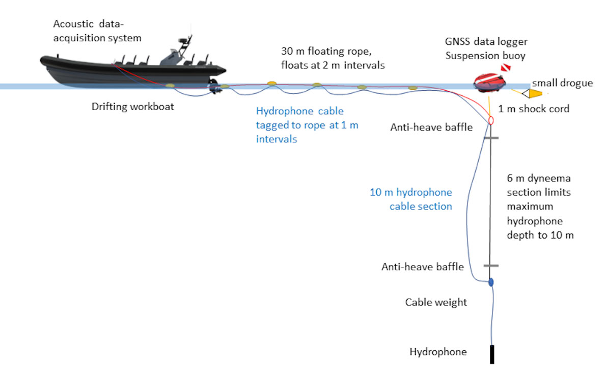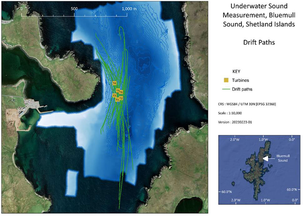 A A A Volume : 46 Part : 1 Proceedings of the Institute of Acoustics Underwater acoustic measurement, characterisation, and modelling of Nova Innovation tidal energy converters at Bluemull Sound, Shetland D. Jervis, Seiche Ltd, UK R. Lee, Seiche Ltd, UK S. J. Stephenson, Seiche Ltd, UK C. Pierpoint, Seiche Ltd, UK C. Birch, Seiche Ltd, UK 1 INTRODUCTION Tidal Energy Convertors (TECs), such as tidal turbines, harvest tidal stream kinetic energy as a sustainable source of electrical power. To gain consent for new tidal energy developments, it is important that any potential environmental impacts are understood, such as the impact of underwater sound produced by the devices on marine life. Knowledge of the underwater acoustic characteristics of TECs can therefore assist in the preparation of environmental impact assessments for new developments. Measurements of underwater sound from TECs can provide insight into these impacts and can be used as input to underwater acoustic models that predict the expected sound field and associated impacts of future projects. This paper describes the collection and analysis of underwater acoustic data by Seiche Ltd to evaluate the noise contribution of Nova Innovation’s (henceforth referred to as “Nova”) Shetland Turbine Array, and the subsequent acoustic modelling. Data collection was carried out at Bluemull Sound in the Shetland Islands, Scotland, where Nova has installed an array of six 100 kW non-surface piercing gravity-based tidal turbines (henceforth referred to as Turbines 1-6, or T1-6). The site is essentially a scoured channel orientated approximately North- South, with a maximum depth of approximately 44 m and a maximum width of approximately 850 m. The relatively shallow water is characterised by highly turbulent tidal flow across a mostly solid, rocky substrate. Underwater sound recordings were collected on-site using a tethered drift buoy method. This novel data collection methodology aimed to mitigate the effect of turbulent flow noise while still adhering to established standards. There were two types of turbines measured during the study: three direct drive turbines and three geared turbines. This study focussed primarily on the direct drive turbines T4, T5, and T6, because Nova has now discontinued the use of the less efficient geared turbine design used in T1, T2, and T3. At first, data collection was exclusively focussed on characterising T6, but sample recordings for the other turbines were collected opportunistically. The location of the turbine array is shown in Figure 1. Figure 1: Map of Bluemull Sound with turbine locations marked. 2 MEASUREMENT METHODOLOGY Acoustic measurement in highly dynamic tidal environments poses certain challenges. Using static hydrophones presents logistical difficulties in anchoring moorings to the seabed. Furthermore, static hydrophone installations are exposed to turbulent water flow across their surface which results in spurious ‘flow noise’ that may mask sounds of interest. Flow noise affects lower frequencies (up to ~1000 Hz) in particular, which are important in characterising tidal turbine signals. Using drifting hydrophones reduces flow noise but interweaves temporal and spatial patterns. Collecting enough data through multiple drifts across areas of the same spatial extent at different times of the tidal cycle can help to account for observed variability. Drifting hydrophones have the advantage of measuring the turbine sound field as a function of range, aiding in estimating local propagation loss. Accurate measurements of turbine sound at a series of distances and estimates of propagation loss are both necessary to back-calculate the source level of the turbines. The focus of the project was to conduct detailed measurements with which to characterise underwater sounds produced by direct drive tidal turbines. It was possible to make sound recordings during periods when single turbines were operating only (recording sessions with T6 and subsequently T4). Whilst on site, the opportunity was also taken to undertake measurements on other turbines and multiple turbines, including the other direct drive turbine T5, the older geared turbines (T1, T2 and T3) and the entire array of six turbines. The data collection method used an 11-m rigid-hulled inflatable workboat (RIB) as a drifting platform from which to deploy a calibrated hydrophone system. The cabled hydrophone was tethered to the Seiche PAM-Go™ data acquisition system carried on the boat and drifted approximately 25-30 m from the boat and approximately 10 m depth below a surface (suspension) buoy. Global navigation satellite system (GNSS) data were logged at the buoy above the hydrophone at a rate of 10 Hz. A schematic drawing of the data collection system is presented in Figure 2. Figure 2: Schematic drawing of the data collection system. In accordance with International Electrotechnical Commission (IEC) TS 62600-40 2019 requirements for Level A characterisation, acoustic data were sampled, where possible, from four zones surrounding the turbines: “upstream”, “downstream”, “port”, and “starboard”. Each zone is represented by a square polygon which measures 25 m on edge and is offset from each turbine by approximately four times the longest dimension of the rotor. Each sampling zone at the array was offset by 21.5 m to the edge, or 34 m to the centre (four times the longest dimension of the turbine rotor). The polygons were orientated to the direction of the flood and ebb tidal stream, therefore as the tide changed direction the boxes switch. A series of drifts were carried out to collect acoustic data from each of the sampling zones offset from individual tidal turbines. 3 ANALYSIS METHODOLOGY In-house Seiche software created with LabVIEW and Python was used to categorise the collected acoustic data based on the GNSS position, proximity to each turbine, tidal flow direction, and turbine power. The drift line GNSS data