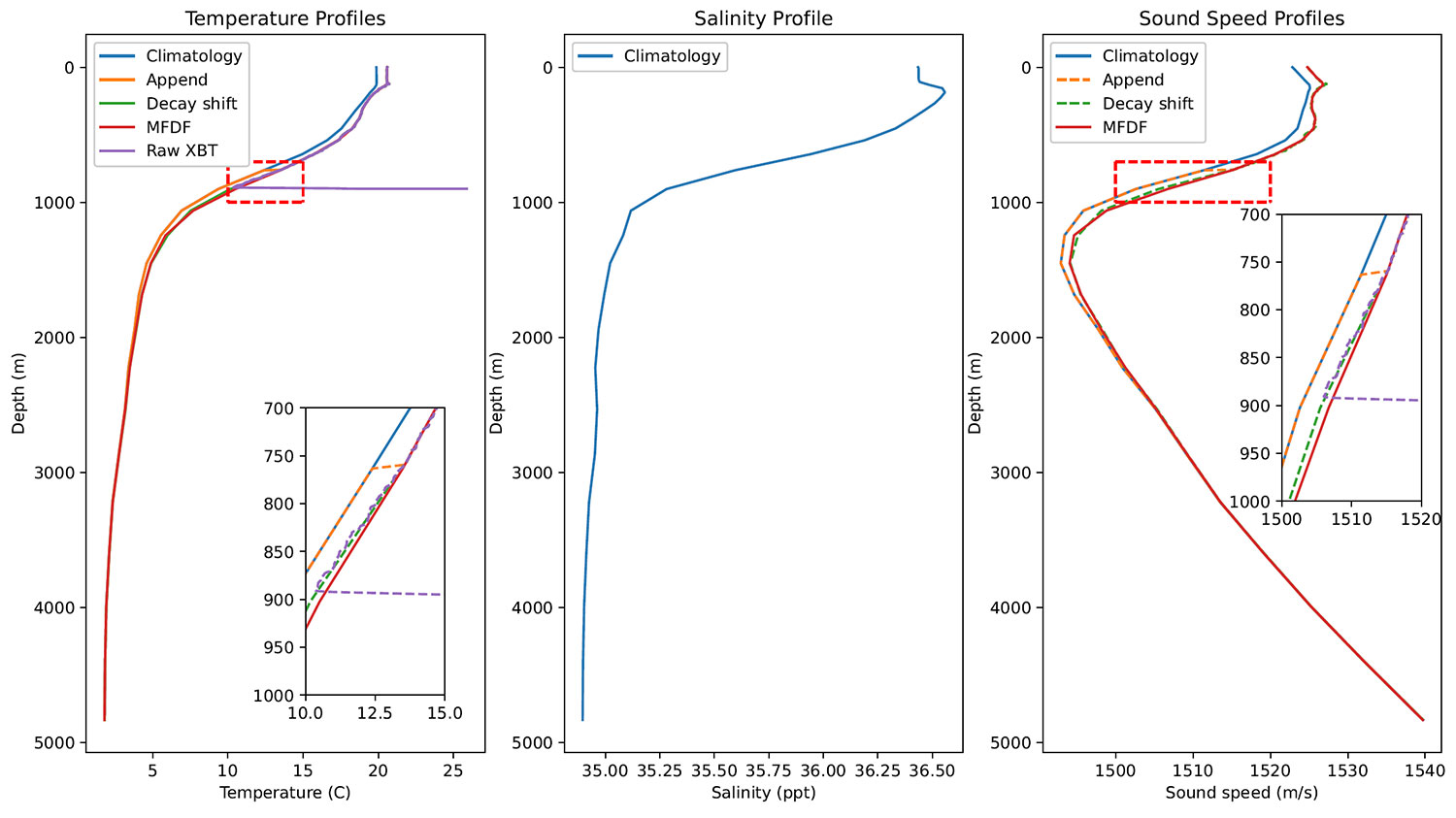A A A Volume : 46 Part : 1 Proceedings of the Institute of Acoustics Gaussian processes for merging water column parameters F. Boulton, University of Liverpool, Liverpool, L69 7ZL, UK D.J. Colquitt, University of Liverpool, Liverpool, L69 7ZL, UK S. Timme, University of Liverpool, Liverpool, L69 7ZL, UK D.P. Williams, Dstl, Porton Down, Salisbury, SP4 0JQ, UK 1 INTRODUCTION Accurate sound speed profiles are essential for effectively modelling the propagation of acoustic waves. However, in-situ, point-in-time measurements are often limited to XBT and XCTD probes, at a discrete location and time, providing environmental parameters for the top of the water column. Often historical climatological, or very occasionally forecast, data for a given time-period is used as a “best estimate”. In cases where measured in-situ data exists, invariably these measurements either does not match the climatological/forecast data and/or does not cover the entire water-column. To address this problem we use a Gaussian Process (GP) data fusion method called Multi-Fidelity Data Fusion (MFDF) to extend in-situ measurements, in depth, using historical/forecast climatological data, yielding potentially more accurate, up to date, estimates of the chosen water column parameter. We apply this method to in-situ temperature data from XBT probes and historical climatological data. The merged data is then used to calculate the sound speed profile. We examine the effect of using MFDF to water column parameters with acoustic propagation modelling. In-situ measurements of temperature and depth can be obtained with instruments such as XBT probes, while simultaneous in-situ estimates of temperature, salinity and depth can be performed by Expendable Conductivity Temperature-Depth (XCTD). These instruments are typically rated up to depths of approximately 460m to 1000m, depending on the type of instrument. As such, these instruments measure parameters in the upper section of the water column which is the most variable in temporal changes. The deep water section of the profile remains relatively constant over time in many deep water areas, hence we can use pre-existing climatology to estimate the parameter profile in this section of the water without resorting to extrapolation. These merged parameter profiles can then be used to calculate the sound speed using equations such as the United Nations Educational, Scientific and Cultural Organization (UNESCO)5, or the Leroy et al14 sound speed equations. Various factors can affect the speed of sound and how sound waves propagate through water, including temperature, pressure, and salinity. Small changes in these parameters can have a significant impact on sound speed profiles, introducing features such as ducts and sound channels (a region within the water column where sound is trapped), which dramatically affect acoustic propagation. These profiles are essential for sonar systems, aiding in target localization, range estimation, and detection performance. In underwater communication, reliable data transmission relies on understanding sound speed variations. Additionally, sound speed profiles are vital for environmental monitoring, helping to track oceanic phenomena and interpret oceanographic data. Sound speed profiles also naturally play an important role in underwater imaging techniques like sonar imaging. Indeed, accurate sound speed profiles underpin many aspects of underwater acoustics, enabling better decision-making and more effective use of acous tic technologies. There are several existing methods to merge in-situ measurements with historical/forecast data. The simplest approach is to append historical/forecast data to the in-situ data, such that the merged profile covers the whole water column. This method is simple and easy to implement but often results in discontinuities in the merged profile, which can have a significant impact on acoustic propagation modelling. Another method developed by McHugh18 uses a decaying shift equation based on the idea that the temperature profile from the historic climatology is shifted by a small amount at the maximum depth of the in-situ profile such that the in-situ and historic profiles coincide, then a decaying shift is applied at subsequent depths to smoothly merge the two profiles. Anand et al.2 also used this approach, developing software to merge water column parameters collected from in-situ measurements and historical climatology from the 2009 World Ocean Atlas15. A piece of open source software called Sound Speed Manager was developed by Masetti et al.16, the main functionality of which, is to read data collected in various formats, which can then be enhanced by in-situ profiles using oceanographic atlases before exporting this output for use in other applications. A more recent effort by Huang et al.10 combines in-situ data with the 2018 world ocean atlas4to reconstruct sound speed profiles using the UNSECO sound speed equation5. In this paper, we develop an approach to merging water column parameters using GPs, specifically MFDF. A GP is a collection of random variables, any finite number of which have a joint Gaussian distribution21. In essence, GPs provide a principled, non-parametric approach to regression and classification tasks, offering a natural way to incorporate prior knowledge and uncertainty into predictions21. GP have found applications in underwater acoustics for a range of tasks including, for example, Direction-of-Arrival Estimation11 and underwater communication12. MFDF is a developing methodology that focuses on integrating information from multiple data sources, each with varying levels of fidelity or accuracy, to improve predictive modelling and decision-making processes9. This approach is particularly relevant in scenarios where data from different sources have different costs, resolutions, or reliability levels. For this application, less expensive data sources (such as climatological data) might prov