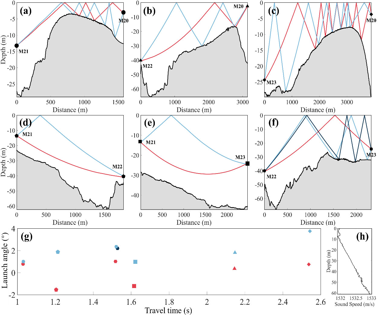 A A A Volume : 46 Part : 1 Proceedings of the Institute of Acoustics Ocean current observation with mirror-type underwater acoustic tomography sensing network Guangming Li, National Innovation Institute of Defense Technology, Beijing, China Dexin Zhao, National Innovation Institute of Defense Technology, Beijing, China Shijie Xu, Zhejiang University, Zhoushan, China Pan Xu, National University of Defense Technology, Changsha, China Luwen Meng, National Innovation Institute of Defense Technology, Beijing, China Ge Niu, National Innovation Institute of Defense Technology, Beijing, China 1 INTRODUCTION Sound wave is a basic tool for information transmission and communication in marine environment, which can also be used in ocean dynamic process observation. Ocean acoustic tomography (OAT) is an advanced technique for observing marine environment via signal travel time delay variations, it was first proposed by Munk [1]. Woods Hole Oceanographic Institution successfully observed three-dimensional (3D) structure of mesoscale eddies at the first OAT experiments in Bermuda Sea [2]. Coastal acoustic tomography (CAT) was developed by Kaneko, Hiroshima University based on OAT for shallow water observations at coastal region [3]. OAT reconstructs flow and temperature fields using long-distance acoustic signal transmission via ocean acoustic channel [4-8]. Compared with deep sea environment, the acoustic field in shallow sea area is more complex and variable. Different from fix-point measurement using Acoustic Doppler Current Profiler (ADCP), Conductivity Temperature Depth system (CTD), PIES, etc., acoustic tomography is a more efficient way to reconstruct 2D or 3D results with acoustic stations [9-10]. In recent years, new CAT observations and methods were developed. Park et .al proposed a new method for vertical temperature profile estimation using sea surface temperature, near-bottom temperature and water depth based on CAT. They successfully obtained monthly temperature variations in the southern coastal region of Korea with mean root-mean-squared difference for February, May, August, and November were 0.23, 0.30, 0.50, and 0.24℃ , respectively [11]. Minmo Chen et. al reconstructed two-dimensional flow fields using a coast-fitting inversion model of five- station reciprocal transmission and obtain the M2 and M4 tidal currents and the residual current [12]. Ze-Nan Zhu, et. al successfully observes two complete flood processes of the Yangtze River via two CAT systems with synchronized transmission [13]. Mirror-transponder costal acoustic tomography (MCAT) is a further development of traditional CAT, its key point is to obtain the sound wave reciprocal transmission information by signal mirror transferring [3]. It is an innovative method for underwater signal receiving by solving the travel time between station pairs through the mirror signal after networking transmission. Thus, the underwater signal transmissions can be obtained with one land station, which simplifies experimental setting and forms the networking array observation model. MCAT was initially applied for two-station transmission experiments. Chen et. al first introduced the MCAT system, and performed a feasibility experiment by the minimum unit (one land and one key station) in the Nekoseto Strait of the Seto Inland Sea, Japan. The experiment prove performance of MCAT via the root-mean-square error (RSME) of the hourly mean range-average currents calculated by mirror travel time is significantly smaller than the variation ranges of the semidiurnal tidal current [14]. Syamsudin et. al successfully observed the subsurface structures of internal solitary waves via two MCAT over a path length of 18.286 km in the Lombok Strait, Indonesia, and reconstructed temperature profiles by four layer-averaged which temperature peaks is synchronized with the diurnal tides [15]. The station types in MCAT experiment are divided into land station, key station and normal station. In general CAT experiments, acoustic stations are deployed at same depth and fixed by a anchored boat. However, in MACT experiments, key and normal stations are designed as shallow markers, which are deployed at deep sea. The land station is placed in the shallow water near shore, key station is placed between land station and normal station for signal transferring. The non-fully depth region derived from land to ocean is the most suitable observation area for MCAT with the most significant environmental variations. But the area is not applicable for CAT due to the fluctuated terrain and complex shallow acoustic channel. Thus, mirror signal transmissions have advantages in shallow sea. 2 MIRROR RECIPROCAL TRANSMISSION MODE The mirror reciprocal transmission mode of MCAT is combined with a land station, a key station and several normal stations. The core of this model is the travel time obtained through mirror-type signals transmission via key and normal stations. In a stranded multi-station remote sensing system, different station has its role: land station is deployed near shore and can obtain mirror data, key station is the offshore autonomous underwater station which is used for mirror reciprocal transmission with normal stations and transferring received data to land station, normal station is also the offshore autonomous underwater station which is used to reciprocal transmitting between normal and key stations. During the mirror transmission, three signal sending and receiving exist between station-pairs, which named original signal, mirror 1st signal and mirror 2nd signal. Figure 1: Time chart for reconstructing travel times between land (M0), key (M1) and normal (M2-M3) stations. Red solid and dashed rectangular boxes are transmit pulses and receiving windows in original transmission, respectively. Blue dashed rectangular boxes are extra record time. Yellow solid and dashed rectangular boxes are mirror transmit pulses and receiving windows in mirror 1st transmission. 