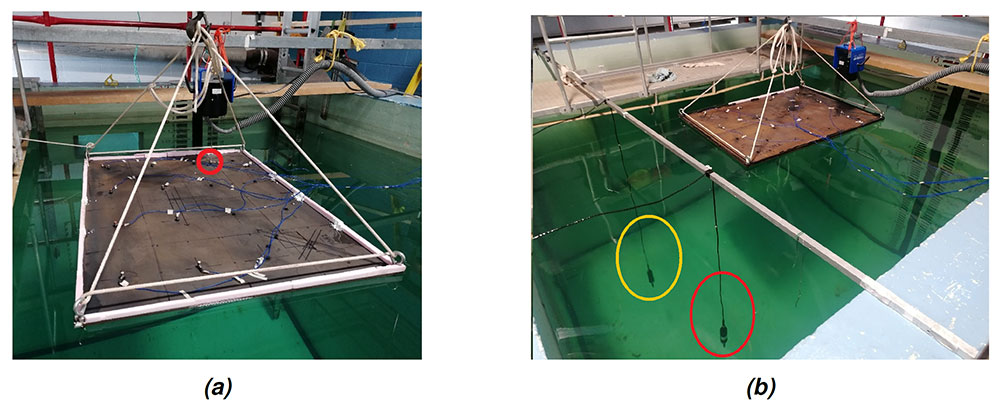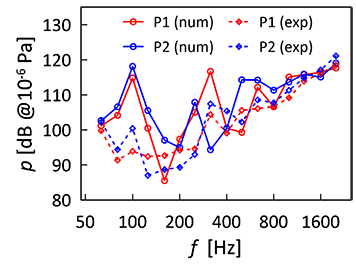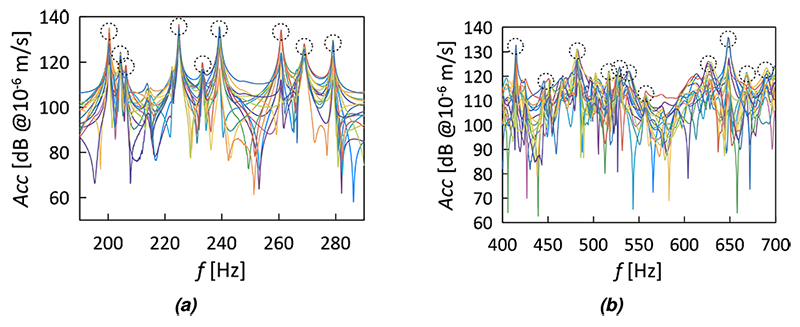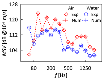 A A A Volume : 46 Part : 1 Proceedings of the Institute of Acoustics Model tuning of a vibrating plate in contact with water G. Rognoni, Dept. of Engineering and Architecture, University of Trieste, Trieste, Italy L. Moro, Dept. of Ocean and Naval Architectural Engineering, Memorial University of Newfoundland, St. John’s, NL, Canada M. Biot, Dept. of Engineering and Architecture, University of Trieste, Trieste, Italy 1 INTRODUCTION The underwater environment experiences an increasing anthropogenic influence, manifesting in amplified noise pollution. Together with noise pollution, the international community concern is also growing. Jalkanen et al.1 showed an increasing trend in underwater acoustic energy emitted by ships in most ocean areas, although by different scaling factors, between 2014 and 2020. Reversing this trend should be the primary goal of national and international jurisdictions through the creation of regulations on noise pollution control. Smith and Rigby2 illustrated an exhaustive list of countermeasures, examining underwater noise sources, discerning principally between hydrodynamic noise generated by the propeller and noise generated by the machinery on board. These countermeasures are technical interventions aimed at making the ship quieter. There are other possible solutions, such as reducing speed, re-routing, and constant maintenance3. Within this context, a Ph.D. project started at the University of Trieste to study and evaluate the possibility of using acoustic metamaterials (AMM) to mitigate structural vibrations and reduce underwater radiated noise from ships. AMM constitutes innovative solutions for acoustics and vibration control, and the scientific interest around them has increased in the last twenty years. One typology of AMM is called Acoustic Black Holes (ABH). Introduced by Mironov4 in 1988, they are now the focus of renewed interest for their potential. During the last two years, the Ph.D. activity mainly focused on exporting this technology from a laboratory to an operational environment5. To do this, we developed a strategy based on a series of experiments to test our prototypes on different structures, from small-scale sub-panels to large-scale ship mock-ups6. The first of these tests evaluated the reduction of vibration and radiated sound of a plate when four ABHs were installed. The plate was tested in two different configurations: hung in the air (dry condition) and hung with a face in contact with water (wet condition). This paper reports the preliminary results obtained on a bare plate without dampers. In particular, the paper focuses on developing a numerical model that can replicate the response of a vibrating plate when in contact with the water. The model will then be used to predict the ABH mitigation effect. The literature on tests on plates vibrating in water is almost entirely focused on the match between experimental, analytical, and numerical modes of vibrations7,8. The current numerical software are able to predict the fluid contribution to the system dynamic with good accuracy; what lacks reliable data is the quantification of the water-added damping. Water-added damping depends on many factors: change in mode-shape due to fluid pressure, vortex shedding, viscosity, flow velocity, surface roughness, the proximity of the nearby structure, and submergence level9. Within the listed factors, viscosity is indicated as having a major critical role in reducing vibration levels. It is assumed that dissipation due to viscosity happens at a fluid-structure interface in a thin boundary layer. We highlight the role of viscosity as the typical approach to modelling fluid-structure interaction disregards this particular quantity, which is then incorporated by means of loss factor, a dimensionless quantity often obtained from measurements10. The paper is organized as follows: section 2 briefly describes the theoretical and numerical modelling of fluid-structure interaction (2.1), the experimental activity carried out (2.2), and FE model (2.3), focusing on the updating logic selected for this specific case; the results obtained, the loss factor of the system, the surface velocity and the radiated pressure of the plate, are illustrated in section 3, followed by the discussion in section 4, and conclusions 5. 2 METHODS 2.1 Fluid structure interaction modelling in FEA Fluid-structure interaction concerns physics problems involving mechanically-excited elastic structures entirely or partially submerged by a fluid. The elastic structure is generally modelled by finite elements (solids, shells, membranes, beams, rods). In contrast, the fluid can be modelled using different methods: finite elements (adopted in this paper), boundary elements, infinite elements, matrix or analytical techniques11. The modelling presented here is implemented in the Hexagon Actran software used for the numerical calculations in this paper. The formulation chosen for the fluid is Eulerian, meaning that a scalar, the pressure, describes the fluid response, while the elastic structure response is described by the displacement vector. Pressure in the fluid must satisfy the wave equation (Eq. 1): where ∇2 is the Laplacian operator, p the pressure, and c the fluid sound speed. The fluid is treated as a compressible, inviscid, non-flowing medium; the fluid is described by volume finite elements defined using the Galerkin approach. The procedure at the base of the FE formulation used in Actran is reported in detail by Cesari12 or Desmet and Vandepitte13. The fluid medium is discretized by three terms which, in analogy to the elastic structure, are called: acoustic stiffness matrix Ka, acoustic damping matrix Ca, and acoustic mass matrix Ma (Eq. 2): Fa is the external force vector applied to the fluid. Although the names of these three matrixes recall those of the same components in the elastic structure FE formulation, they represent something different. The construction of these 