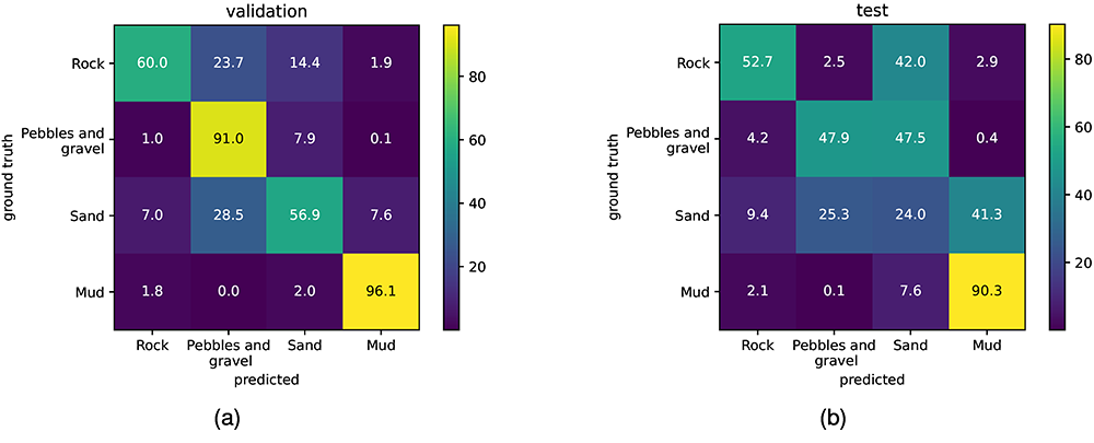 A A A Volume : 46 Part : 1 Proceedings of the Institute of Acoustics A deep segmentation approach for multibeam echo sounder backscatter data based on seafloor type H. Moreau, Lab-STICC UMR CNRS 6285, ENSTA Bretagne, Brest, France S. Homrani, Lab-STICC UMR CNRS 6285, ENSTA Bretagne, Brest, France I. Mopin, Lab-STICC UMR CNRS 6285, ENSTA Bretagne, Brest, France J. Le Deunf, Service Hydrographique et Océanographique de la Marine, Brest, France J. Bignon, Service Hydrographique et Océanographique de la Marine, Brest, France G. Le Chenadec, Lab-STICC UMR CNRS 6285, ENSTA Bretagne, Brest, France 1 INTRODUCTION Characterising the seafloor has many applications, including geology, deep-sea mining, and benthic habitat characterisation. To obtain large-scale information on the seabed, multi-beam echo-sounders (MBES) are often used. However, interpreting these sensor data is not trivial. Many publications tackle the problem of sediment type prediction using multibeam echosounders. Methods are diverse, including machine learning algorithms such as fully-connected neural networks8, Random Forest2,6 or explicit statistical modelization with Gaussian Mixture Models7 or Conditional Random Fields1. They rely on a certain amount of handcrafted features, values which are representative of the problem to solve. When dealing with MBES measurements, features can be derived from soundings (depth, slope, roughness) or from the seabed acoustic responses, often called backscattering strength (BS), both measured simultaneously during a survey. However, the relationship between BS and sediment properties is complex5 and despite recent advances10, designing the right features to provide a machine learning model is not a solved problem. One way to circumvent this hurdle is to use deep neural networks, a family of algorithms known for their ability to simultaneously produce features and classify the samples. However, deep neural networks, used as-is, require vast amounts of labelled data. A common way to obtain labels for the seafloor is to use either grab samplings, photo, or video evidence. These methods allow for a highly detailed characterisation of the seafloor, but they are limited to punctual measurements. In contrast, the areas covered by bathymetric or mosaic maps are much wider. This means that even by assigning a label to a set of nearby soundings6, the amount of labelled data is bound to be much smaller than the number of soundings. One alternative to the problem chosen by Garone et al 4 is to use sedimentary maps drawn by experts (covering the whole study area) instead of using directly objective measurements like grab samplings. The authors trained a convolutional neural network to perform a two-class problem (bedrock/non-bedrock) using these labels. It resulted that the depth (along with its derivatives like the slope) was more efficient than the backscatter for a neural network to predict the seafloor sediment type from. The present article aims at exploring the use of supervised deep neural networks to predict a seafloor type using backscatter and/or depth data provided by a MBES. We work on data organised as a [ping, beam] matrix. This publication is organised as follows: Section 2 describes the data, the area of study and the process employed to create the labels. Then, section 3 describes the practical implementation of the neural network, before section 4 presents the results. We conclude with some ways our work can be improved in Section 5. 2 DATA DESCRIPTION The study area consists of two zones located off France, on the continental shelf in the east of the Atlantic Ocean and in the west of the English Channel (see Fig. 1). The survey was carried out by the French hydrographic and oceanographic service SHOM (Service Hydrographique et Oc´eanographique de la Marine). Raw MBES data is a series of pings, measured at each position of the vessel. Each ping contains a fan of several beams containing one sounding and one backscatter value per beam. Even though the entire area was surveyed using multiple echosounders, we focus on the lines where the Kongsberg EM710 is used which represents 89.6% of the total number of soundings. With this MBES, data was recorded using a dual-swath mode, i.e. different frequencies are transmitted between central and lateral sectors and between swaths. They alternate between 70 − 90 − 70 kHz (for the left, central, and right sectors, respectively) and 80 − 100 − 80 kHz . Even though the seafloor acoustic response is known to depend on transmitted frequency and incident angle of the acoustic transmitted pulse on the seafloor, we concatenate all data into a single image, and let the neural network learn to deal with this data. MBES data used are not calibrated in amplitude 3 which explains the sharp differences between transmit sectors on backscatter in figure 2. Figure 1: Maps of labels provided by expert sedimentologists of SHOM. We delimit two test zones to make sure the results are evaluated using data from a different location than the training data. Because MBES raw data are directly used, outliers are present in soundings and backscatter measurements. Thus, before integrating data to the network, a filter on the depth of the soundings is applied: depths larger than 300 m (three times the maximal depth observed in both regions) are removed. As neural networks do not accept missing values, the sounding depth data is interpolated using a median filter applied in the [ping, beam] geometry. No filter is applied to backscatter measurements. Figure 2: Example of raw data in [ping, beam] geometry: (a) sounding depth, (b) label, (c) and backscatter from a single survey line with Kongsberg EM710. 2.1 Projection of label georeference map in echosounder geometry In order to label the data with sediment types, we use labels of expert sedimentologists shown in figure 1 as ground truth. These labels maps are derived following the SHOM usual procedure: 1) using complement