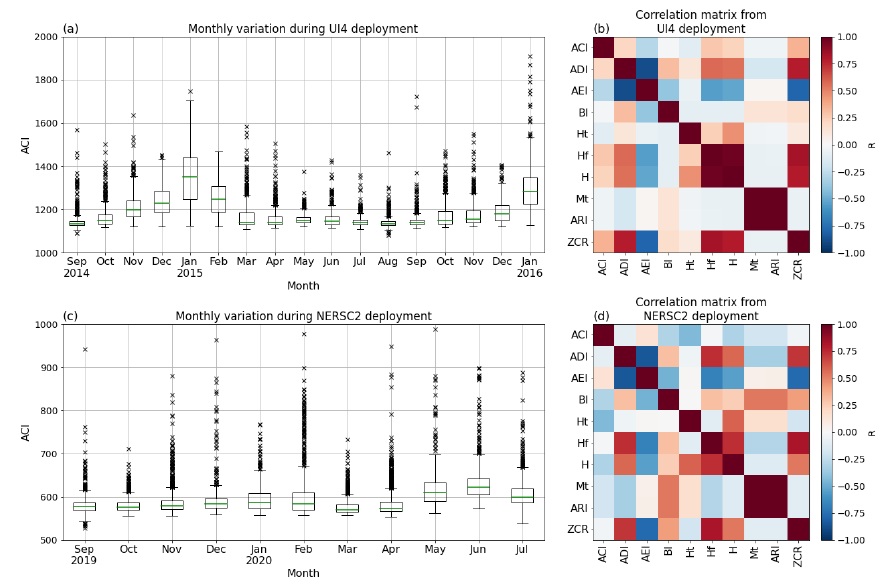 A A A Volume : 46 Part : 1 Proceedings of the Institute of Acoustics Automatic identification of biophonics and sea ice processes in large datasets from the High Arctic Ocean J Cleverly, Department of Physics, University of Bath, Bath, Somerset, UK Ph Blondel, Department of Physics, University of Bath, Bath, Somerset, UK H Sagen, Acoustic and Oceanography Group, Nansen Environmental and Remote Sensing Center, Bergen, Vestland, Norway M Dzieciuch, Scripps Institution of Oceanography, University of California San Diego, San Diego, California, USA E Storheim, Acoustic and Oceanography Group, Nansen Environmental and Remote Sensing Center, Bergen, Vestland, Norway 1 INTRODUCTION Accelerated climate change in the Arctic region is leading to major modifications to its underwater soundscapes 1. With the reduction of sea ice coverage across seasons, marine mammals are having to adapt their migratory behaviours2,3 and waters are opening up for maritime industries4,5, phenomena which can be monitored acoustically. Advancements in offshore technology for the challenging Arctic conditions have allowed for multi-sensor moorings to run continuously across seasons, in particular with hydrophones for acoustic thermometry and to better understand local soundscape variations. However, the accumulation of data requires automation in processing to identify times featuring processes of interest. The terrestrial ecoacoustics community is facing the same issue of ”big data” 6, but they have developed acoustic indices to concisely summarise temporal and spectral variations within audio recordings, which can then be used to determine levels of biodiversity. Acoustic indices have been successfully implemented in ecological studies across a range of terrestrial environments, although their application to marine environments has not yet been widely accepted, with most studies considering coastal and coral reef ecosystems7,8, while only a few deep-water ecosystems have been considered9. The use of acoustic indices to study Arctic soundscapes has yet to be explored10, with few observations into how they respond to the highly variable sounds from sea ice processes. Recent ecoacoustic studies in the Southern Ocean were successful in obtaining insightful biodiversity findings despite the presence of sea ice sounds, but this is still a topic that needs further assessment11. This study investigates how acoustic indices can be used as a preliminary marker for seasonal trends of biophony and sounds from sea ice processes (hereinafter ”cryophony” and ”cryophonics”) within large acoustic datasets. Data was taken from the long-term research projects “Acoustic Ocean Under Melting Ice” (UNDER-ICE, collecting data across the Fram Strait from 02/09/2014 to 06/03/2016)12 and the “Coordinated Arctic Acoustic Thermometry Experiment” (CAATEX, collecting data along the Eurasian Basin from 31/08/2019 to 02/08/2020)13. Mooring positions for both experiments are presented in Figure 1, along with satellite data of sea ice thickness across the region in April 2020. As whale presence and migratory patterns in the Arctic are influenced by climate change, there was interest in detecting their vocalisations, especially those of bowhead whales (Balaena mysticetus). To count individual vocalisations in the UNDER-ICE dataset, we use energy analyses and image processing of the individual spectrograms. Figure 1: Mooring positions for UNDER-ICE (UI1-5)12 and CAATEX (NERSC1-3)13 experiments across the Fram Strait and Eurasian Basin. Sea ice thickness across the region in April 2020 is measured by the Copernicus programme14,15,16. Map created using Cartopy17). 2 METHODOLOGY 2.1 Data Processing UNDER-ICE acoustic measurements were made at a sampling rate of 1,953 Hz, with two recordings of 130 s separated by a few minutes, every 3 hours. The moorings were 230 to 570 m deep along the Fram Strait, the Arctic Ocean’s only deep water connection to the rest of the world ocean, therefore experienced pulldowns from strong ocean currents, causing a significant amount of self-noise from cable strumming across the duration of the experiment18. The UI4 mooring was least affected by self-noise and selected for analysis here. Recordings from CAATEX were captured every 12 hours at 976 Hz sampling frequency, each with a duration of 45 minutes and 12 seconds, each mooring featuring two time synchronised hydrophones. Every 3 days, an acoustic thermometry signal was transmitted from NERSC1, dominating the first 17 minutes of recording. These segments were removed to evaluate the seasonal trends of acoustic indices. Spectrograms were computed on segments 2 s long for the acoustic indices study and 0.1 s long for the whale vocalisation detection study. In both studies, the spectrograms used 50% overlap and Hann windows, in line with PAMGuide practice 10,19. Hydrophone calibration was provided by NERSC: receiving sensitivity of -168 dB re 1 µPa, 12 dB gain and analogue-to-digital conversion voltage of 2.5 V. Spectro-grams of typical cryophony and biophony are given in Figure 2. Figure 2: Example spectrograms of cryophony (a) and bowhead whale calls (b), made with be- spoke code inspired by PAMGuide19 and PAM2Py20. 2.2 Acoustic Indices Acoustic indices were computed using scikit-maad, an open source soundscape analysis package written in Python21,22. A variety of popular acoustic indices were considered for the study, including the Acoustic Complexity Index (ACI)23, the Acoustic Diversity Index (ADI)24, the Acoustic Evenness Index (AEI)24, the Acoustic Richness Index (ARI)25, the Biodiversity Index (BI)26 and Acoustic Entropy (H)27. While not an established acoustic index, the zero-crossing rate of the signal (ZCR), i.e. the rate in which the signal amplitude changes sign, was also computed as it can be used to emphasise impulsive or ”percussive” sounds in the signal28, which may have potential for highlighting transient-like cryophonics. Constitue