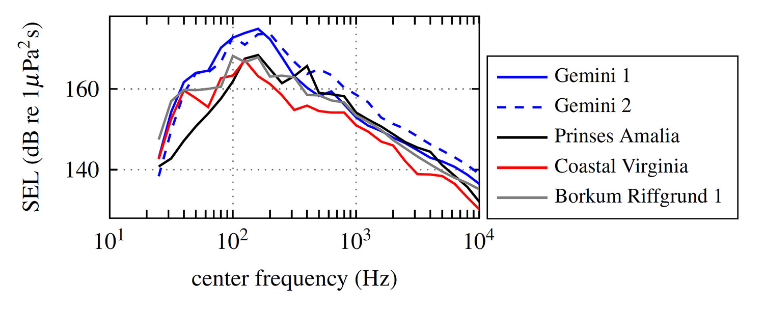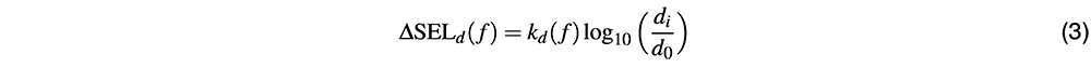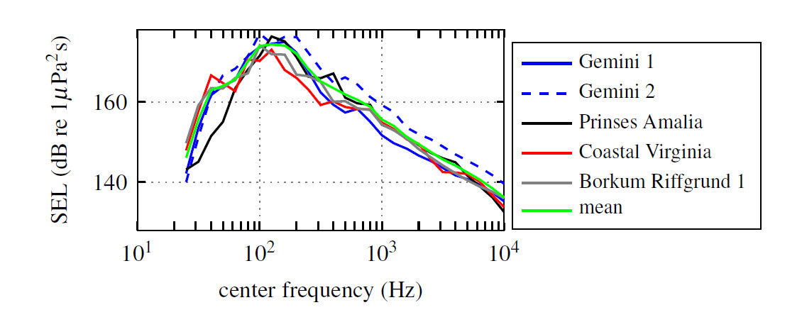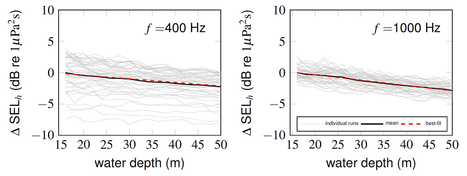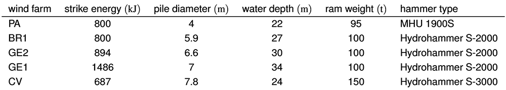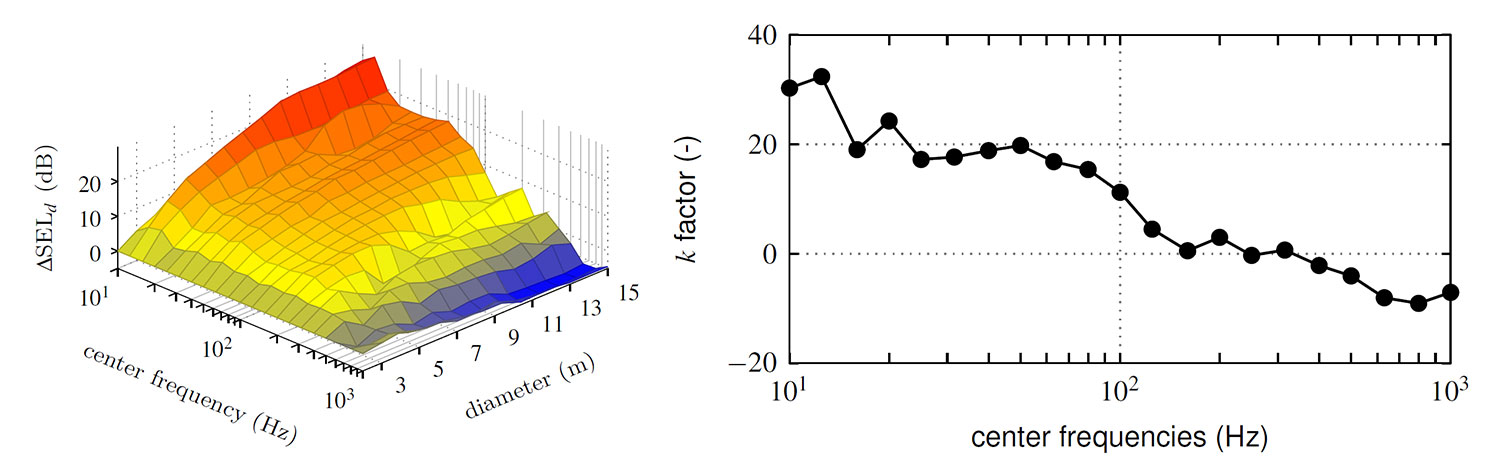 A A A Volume : 46 Part : 1 Proceedings of the Institute of Acoustics Scaling offshore pile driving noise: Application to frequency weighted sound levels J. von Pein, DHI Wasy GmbH, Hamburg, Germany M. Ram, DHI Wasy GmbH, Hamburg, Germany F. Thomsen, DHI A/S, Hørsholm, Denmark 1 INTRODUCTION The biological impact of pile driving noise during the installation of offshore wind turbines is one of the key issues for the environmental management of marine renewable energies in Europe and beyond. Pile driving leads to relatively high impulsive noise emissions into the water, which can be a potential threat to marine life. Therefore, the accurate prediction of the emitted acoustical energy is a prerequisite for any biological risk assessment of offshore pile driving noise. Usually, numerical or empirical models based on measurements are used to assess the sound exposure level (SEL) that is emitted into the water column during piling1,2. Both approaches have the disadvantage that only few institutions and experts have access to them. As an alternative that is available for all regulators as well as the industry, scaling laws have been developed that are applied to existing data to estimate the emitted sound during offshore pile driving. The scaling laws define the dependence of the broadband SEL on the strike energy E, pile diameter d, water depth hw , and ram weight mr for scenarios without noise mitigation, see von Pein et al.3. To asses the species specific impact of the emitted sound levels, weighting functions are applied to account for different hearing characteristics4. The ongoing development of scaling laws for the one-third octave band spectrum of the SEL allows for the evaluation of scaling laws for frequency weighted SELs5. The study aims to investigate whether scaling laws derived for weighted SELs have a similar accuracy to those derived for the unweighted SEL3 and thus potentially provide another tool freely available to regulators and industrial professionals. The scaling laws for weighted SELs are derived by applying the identified frequency dependent scaling laws to the average of measured spectra and thus deriving the weighted SEL as a function of pile diameter and water depth. In the following, the frequency dependent scaling laws are applied to weighted spectra to derive a first estimate of the influence of the water depth and pile diameter on the NOAA-LF-, NOAA-PW-, and NOAA HF-weighted SEL4, which are referred to as LF-, PW-, and HF-weighted SEL. The respective weighing functions are shown in Fig. 1. Figure 1: The considered NOAA weighting functions. 2 FREQUENCY DEPENDENT SCALING LAWS The results of the model runs presented in von Pein et al.3 combined with additional model runs are evaluated to derive the dependence of the one-third octave band spectrum of the SEL on the pile diameter and the water depth. It is important to note that the scaling laws derived in the following are based on generalizations, assumptions and numerical model runs that come along with uncertainties. Furthermore, not all effects that may play a role at the considered frequency range are covered within the numerical model and are therefore also not covered within the scaling laws. The influence of the strike energy is assumed to be frequency independent and is scaled with The influence of the hammer type is usually taken into account in detailed numerical models by computing the interaction between hammer and pile. The hammer and pile geometries have a considerable influence on the specific frequency bands, which is hard to generalize. Therefore, the ram weight is also scaled without a frequency dependence by the broadband scaling law 2.1 Pile Diameter The influence of the pile diameter on the one-third octave band spectrum of the SEL is displayed in Fig. 2. Therein the differences between the computed SEL with a diameter of 2 m and results derived with diameters up to 15 m are displayed. It can clearly be seen that the increase at low frequencies is much higher compared to the increase at higher frequencies. This is linked to the higher increase in the radiation efficiency at low frequencies. In order to derive a frequency dependent scaling law the equation is fitted to every individual considered one-third octave band. The resulting frequency dependent coefficient kd ( f ) is displayed within the right plot of Fig. 2. Figure 2: The differences between the computed SEL at a range of 20 m over the center frequencies and the considered diameters (left) and the frequency dependent scaling factors kd ( f ) fitted for every individual frequency band (right). 2.2 Water Depth The influence of the water depth on the one-third octave band spectrum can be separated into four different main effects. The cutoff effect describes the influence of the water depth on the lowest frequency that is able to propagate. Since the affected frequency range is well above the cutoff frequency, this effect is not considered in the following. The water depth in combination with the pile geometry (diameter, length, wall thickness), soil type, and the penetration depth define the modal shapes of the pile. The influence of distinct modes is mainly at frequencies up to 100 Hz. The actual interaction behavior of pile and water depends on several factors such as the pile geometry and soil. An attempt is made to generalize these. However, its influence on the weighted levels is rather small due to the affected frequencies. Frequencies of up to 200 Hz showed in the results that the influence of the water depth can be scaled with the damping term of the Damped Cylindrical Spreading model6 as presented in3. Figure 3: The dependence of the SEL on the water depth evaluated at 20 m derived with 50 different geometry combinations. As shown in Fig. 3, frequencies above 200 Hz show a linear decaying trend in the SEL with increasing water depth. This linear decay becomes more distinct with increasing frequency. 2.3 Application to Measuremen