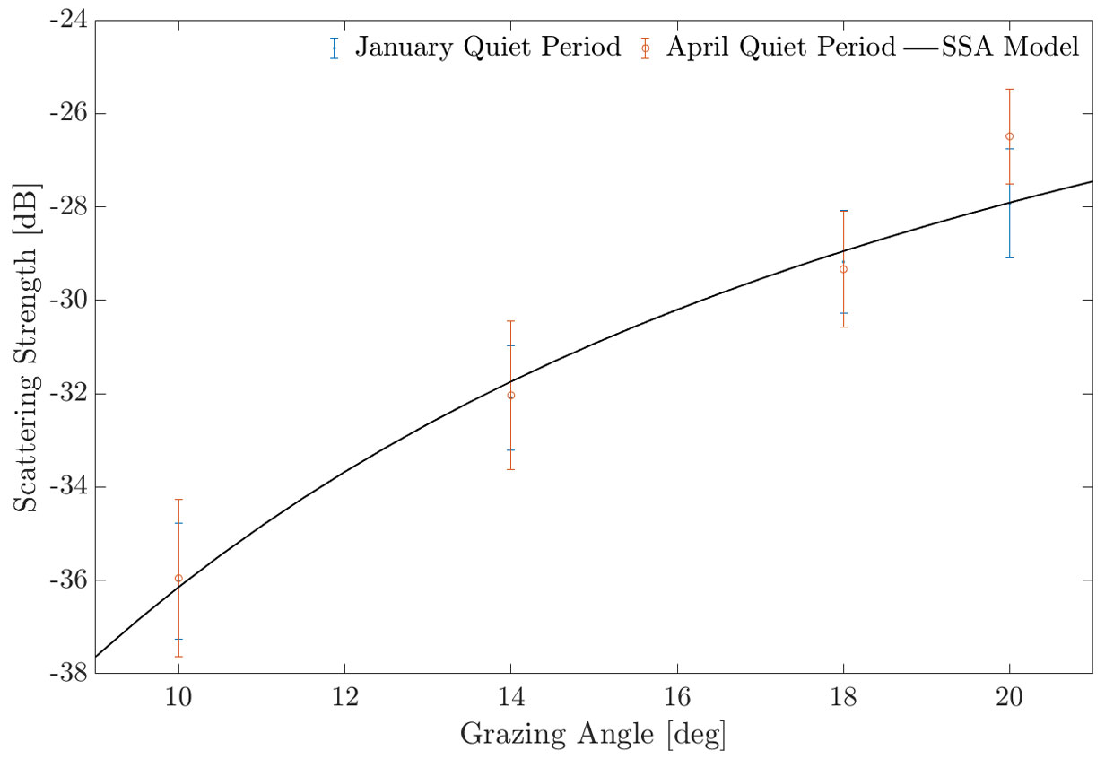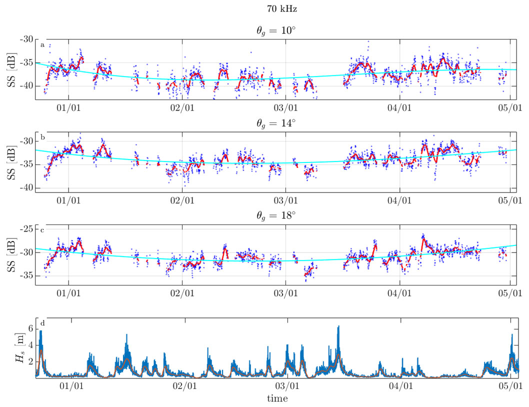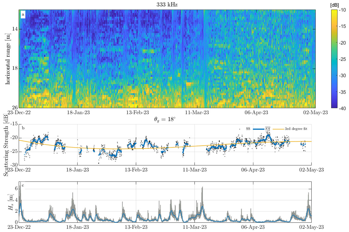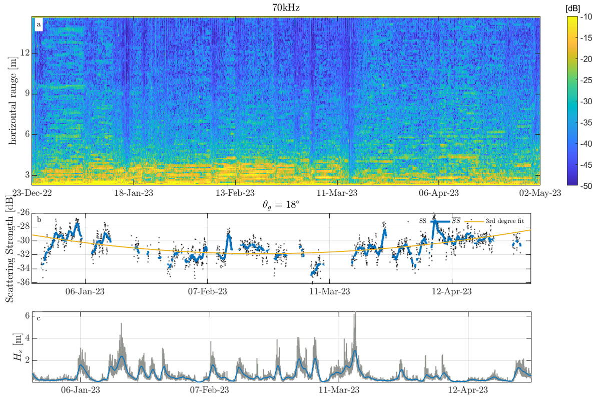 A A A Volume : 46 Part : 1 Proceedings of the Institute of Acoustics Temporal variability of high frequency seafloor acoustic backscatter from a sandy site in the Gulf of Maine Kaan Cav, Center for Coastal & Ocean Mapping, University of New Hampshire, USA Jenna Hare, Center for Coastal & Ocean Mapping, University of New Hampshire, USA Anthony Lyons, Center for Coastal & Ocean Mapping, University of New Hampshire, USA John Hughes-Clarke, Center for Coastal & Ocean Mapping, University of New Hampshire, USA 1 INTRODUCTION Active sonar systems are used for many remote sensing applications such as hydrography, seafloor characterization, and target detection. The effective use of these sonar systems is dependent on a robust understanding of the seafloor acoustic response. Previous work has focused on the dependence of backscattering strength (SS) on sediment type, grazing angle, and frequency, however the temporal variability of SS has not been studied as extensively6,15. Two studies that have investigated temporal variability only spanned weeks and did not report SS time series, instead decorrelation methods were used to track temporal variability10,5. Another experimental study investigated how biological activity affected SS over a period of 60 days by introducing animals (e.g. tethered crabs, mollusks, fish, cockle) within the acoustic footprint of the transducer14. Jumars et al.11 investigated a silty area off the coast of Northern California and observed a circadian pattern in temporal SS variability over a period of 49 days that was most likely driven by benthic change. High energy events that occur on various timescales (seconds to years) are known to alter the parameters that affect SS4,9. Seafloor roughness is an important driver of temporal SS change12. For example, near bed hydrodynamics caused by storms can alter seafloor roughness. Biological activity (bioturbation) can both create and destroy roughness elements (e.g smoothing sharp features, reducing bedform heights, deposit feeding)3,9. Seasonal changes occurring on time spans of days to months can be caused by environmental factors such as the presence of sea grass13. This work builds upon previous studies conducted by Catoire4 and Hare et al.7. Research presented here focuses on the analysis of temporal variations in SS observed from a stationary tripod located in a shallow water, sandy region at the mouth of the Piscataqua River, New Hampshire, USA. The data spans the winter of 2022-2023, covering temporal variability of SS on timescales of hours to months. Increasing our understanding of the environmental parameters that drive changes in SS can inform future remote sensing applications, improve model implementation, and support the development of new multibeam calibration techniques. Figure 1: (a) Map showing tripod location (red star) (b) Instruments mounted to custom-made tripod 2 METHODS 2.1 Equipment Data were collected using a stationary platform on the seafloor in the Gulf of Maine near the mouth of the Piscataqua River (Fig. 1a). The deployment was from December 2022 to May 2023. The average depth of the study site was 16 m. Previous research15 found the area to be sandy with median grain sizes ranging between 0.088 mm and 0.125 mm. The platform was a custom-built tripod4(Fig. 1b), with a height (h) of 2.12 m. The tripod was equipped with three transducers that operated at 70 kHz, 200 kHz, and 333 kHz having beam widths of 18◦, 7◦, and 7◦, respectively. Only the 70 kHz transducer was used as a split beam. The transducers were controlled by a SIMRAD Wide Band Autonomous Transceiver (WBAT). Fifty pings with a pulse length of 256 µs were transmitted on the hour, every hour. The tripod was also equipped with a CTD to collect environmental measurements (e.g. temperature, salinity, significant wave height). An Olympus TG-6 underwater camera provided photographs of the seafloor for the first 30 days of the deployment. The photographs of the seafloor show the presence of shell pieces and small bedforms. The transducers are mounted to the tripod so that the grazing angle of their main beams’ with respect to a flat seafloor would be 20◦. The geometry of the tripod allowed us to study a patch of the seafloor that spanned 4 m to 11 m in front of the tripod with the 70 kHz transducer and 4.9 m to 7.2 m with the narrower beam width of the 333 kHz transducer. 2.2 Data Processing The power of the scattered field received by the transducer was internally calculated by the WBAT2. Transducer beam widths were accounted for based on values provided by the manufacturer. The sound intensity levels of the 50 pings were averaged. Scattering strength (Sb) was then calculated using the averaged sound intensity level for each hour and applying area corrections (A), beam corrections (BP) and transmission losses (T L) as seen in Eq. 1. Slant range (R ) was computed using two way travel time and the measured sound speed. Horizontal range (x) was computed using During stormy periods, the acoustic response of the seafloor was sometimes masked, likely due to bubbles or suspended sediment. The data were assessed for loss of seafloor acoustic response using the measured phases from the split beam transducer. For every ping, the phase differences of the split beam were computed. The standard deviation of the phase differences (σ) among the 50 pings was calculated and from that an average of σ from 4-10 m slant range was taken (). Periods of high coincided with storm events. Data above a specified threshold of 0.28 for were rejected. After periods that lacked seafloor acoustic response were removed, 56% of the data remained. When analyzing the phase data from the split beam, a sudden shift in the physical echo arrival angles was observed likely due to settling of the tripod. The physical echo arrival angles relative to the main beam axis were computed from the phase data2. The physical echo arrival angles in the fore/aft direction (θ) were 