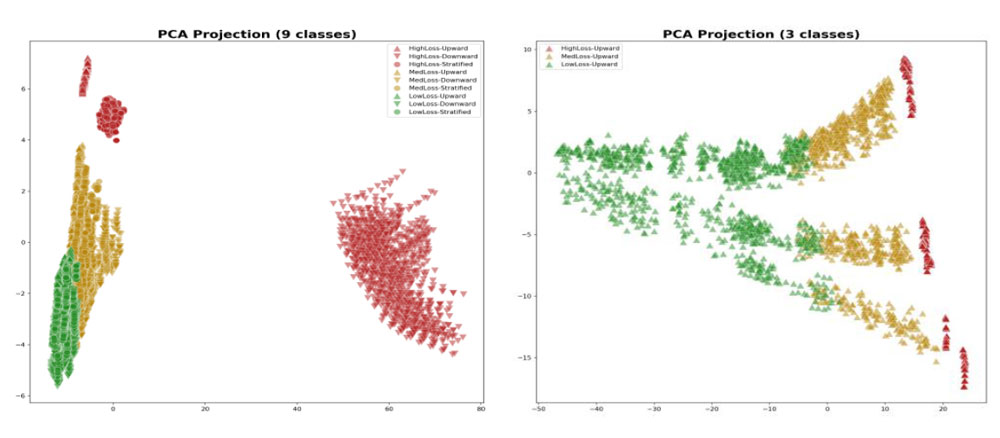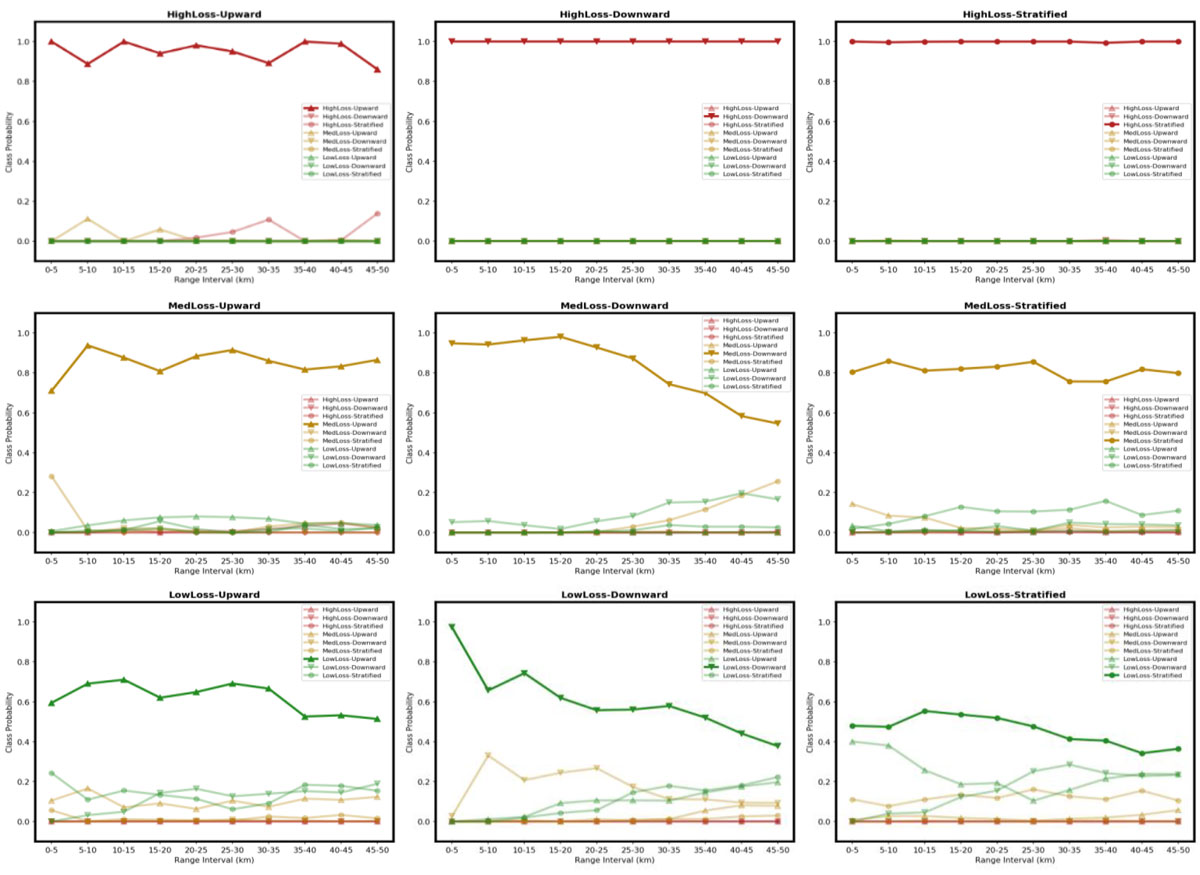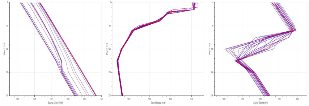 A A A Volume : 46 Part : 1 Proceedings of the Institute of Acoustics Machine learning for classifying the underwater environment from transmission loss data M. Donnelly, Systems Engineering & Assessment Ltd, Beckington, UK M. Tipping, University of Bath, Bath, UK F. Cowie, Airbus Defence and Space, Chippenham, UK Ph. Blondel, University of Bath, Bath, UK 1 BACKGROUND AND MEASURES OF PERFORMANCE Future sonar operations will be increasingly autonomous, including uncrewed vehicles operating over long periods of time in remote areas with little or no mission planning/replanning input from expert operators. Machine Learning (ML) has the potential to support the autonomous repositioning of vehicles for optimising sonar operations. To investigate this potential, work was conducted to develop and test probabilistic ML algorithms for classifying the underwater environment using only acoustic Transmission Loss (TL) data. Environmental classification would then enable appropriate positioning strategies, for example adjusting spacing between distributed sonar systems in order to maintain detection coverage for environments with differing acoustic propagation characteristics. An incorrectly classified environment could lead to inefficient use of sensors (i.e. too closely spaced when the TL in the environment is actually low but is classified as high) or poor coverage (i.e. the reverse). Measures of Performance (MoPs) are required in order to assess the ML classification algorithms. The standard metrics of classification accuracy and confusion matrix were used. In addition, a ‘detection coverage’ MoP was constructed in order to assess the practical impact of misclassification. Given a TL versus range curve, this was defined as the fraction of the ranges for which the TL is less than a fixed Figure of Merit (i.e. the maximum TL which can be tolerated for a given set of sonar, contact and background noise characteristics). It was used to construct a cost matrix which, when combined with the confusion matrix, enabled an overall performance metric to be calculated. The cost matrix was the same size as the confusion matrix, with zeros along the diagonal and the off-diagonal terms calculated from the absolute difference between the detection coverage MoP for the environment classes at the row and column indices (i.e. true versus that selected by the classifier). 2 ENVIRONMENTS AND ACOUSTIC MODELLING The underwater environments were defined by a temperature and salinity profile, a seabed type (with associated density, compressional wave sound speed and attenuation values), and water depths (both flat and sloping seabed topographies were modelled). The oceanographic profiles and water depths were chosen to be representative of the UK North-West approaches’ continental shelf. Temperature and salinity data were obtained from the Copernicus Marine Environmental Monitoring Service (CMEMS). The Atlantic-European North West Shelf Ocean Physics Analysis and Forecast dataset [1] was used, which provided hourly interval forecasts from the Nucleus for European Modelling of the Ocean model, produced by the UK Meteorological Office. Temperature and salinity profiles were downloaded for the location 57.5°N, 8.5°W. Sound speed was calculated from temperature and salinity using the UNESCO standard Chen and Millero equation [2]. Seabed type was taken from the US Naval Oceanographic Office Bottom Sediment Type (BST) version 2 database [3]. The High Frequency Environmental Acoustics dataset was used, which contains 23 descriptive seabed types; the corresponding geo-acoustic parameters were taken from Section IV Table 2 of [4]. Nine classes of underwater environment were defined, corresponding to all permutations of three types of sound speed profile (Upward Refracting, Downward Refracting and Stratified) and three types of seabed (Low Loss, Medium Loss and High Loss). Within each of these classes, multiple variants were created, in order to generate training and test datasets for the ML algorithms. The temperature and salinity profiles used in calculating the sound speed profiles corresponded to a 48- hour period from midnight on the 14th to midnight on the 16th of January 2018 (Upward Refracting), July 2018 (Downward Refracting) and October 2018 (Stratified) – see Figure 1. The bathymetry profiles consisted of flat and sloping seabed variants with constant gradients for the sloping variants. For the training data, 1200 variants were created, corresponding to all permutations of: 16 sound speed profiles, taken from ocean model forecasts every 3 hours over a 48-hour period starting at 0 hours, i.e. at times 0, 3, 6 … 45 hours; 5 seabed types (similar types within the available BST types); 15 bathymetry profiles, both flat and sloping, with water depths between 150 m and 200 m. For the test data 320 variants were created, corresponding to all permutations of: 8 sound speed profiles, taken from ocean model forecasts every 6 hours over a 48-hour period starting at 1 hour, i.e. at times 1, 7, 13 … 43 hours; 4 seabed types, linearly interpolated at the midpoints between the five training variants; 10 bathymetry profiles, similar to but not the same as the training profiles. Hence the test dataset is completely independent of the training dataset. Figure 1: Sound speed profiles: upward refracting (left), downward refracting (centre) and stratified (right). The blue curves are training data, the red curves test data. All profiles go to the maximum modelled water depth of 200m. The sound speed varies over depth by approximately 3m/s, 20m/s and 5m/s for the upward refracting, downward refracting and stratified cases respectively. The Low Loss seabed variants were taken from BST indices 2 to 7 (Rock, Cobble or Gravel or Pebble, Sandy Gravel, Very Coarse Sand, Muddy Sandy Gravel), the medium loss variants from indices 9 to 13 (Medium Sand or Sand, Muddy Gravel, Fine Sand or Silty Sand, Muddy Sand, Very Fine Sand), and the hi