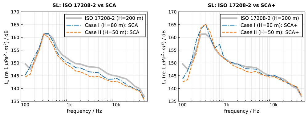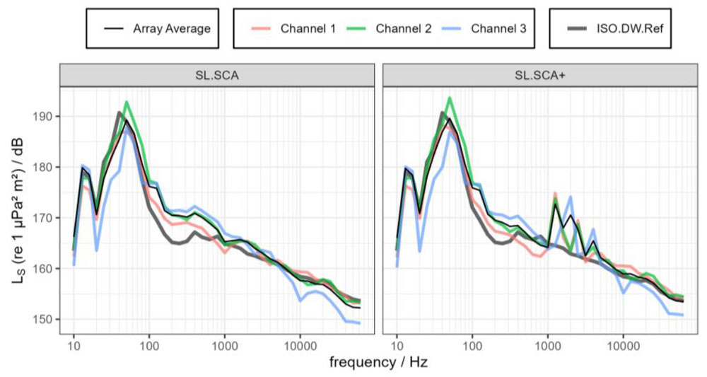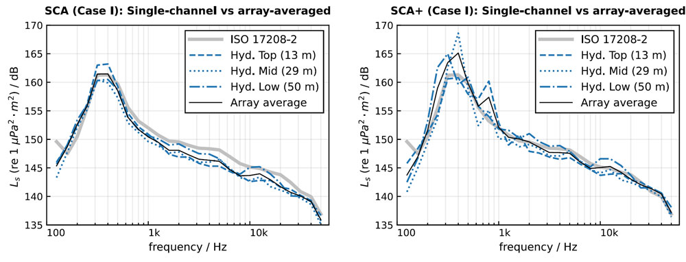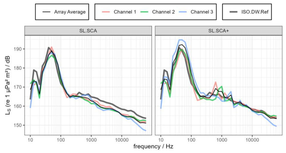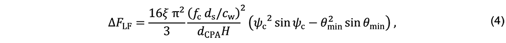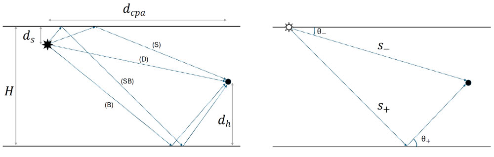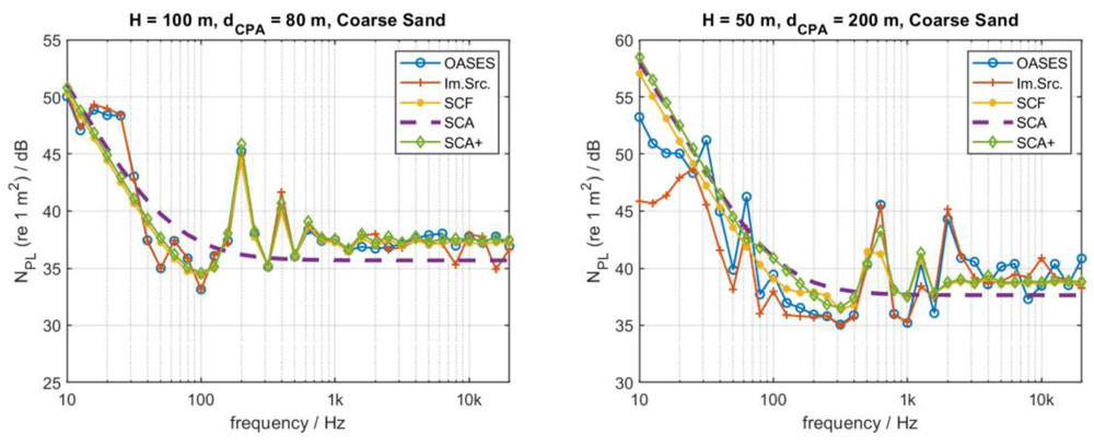 A A A Volume : 46 Part : 1 Proceedings of the Institute of Acoustics Ship source level measurement in shallow water using an enhanced seabed critical angle method MA Ainslie, JASCO Applied Sciences, Schwentinental, Germany AO MacGillivray, JASCO Applied Sciences, Victoria, BC, Canada R Yubero, TSI, Madrid, Spain CAF de Jong, TNO, The Hague, Netherlands LS Wang, NPL, Teddington, United Kingdom 1. INTRODUCTION Distant ships are a dominant source of ambient underwater sound at low frequency (50–100 Hz),1, 2 while nearby ships can cause disturbance at frequencies of multiple kilohertz.3 Measurement of a ship’s source level (SL) is needed for soundscape prediction, for quiet ship certification and for validation of prediction models. An international measurement standard exists for the determination of SL using deep water measurements (ISO 17208-24). A draft international standard (DIS) for measuring SL in shallow water, currently under development (ISO/DIS 17208-35), needs an SL formula that is both accurate and straightforward to implement. The seabed critical angle (SCA) method provides a simple formula for the propagation factor F, as introduced by MacGillivray et al.6 The SCA method is specified by ISO/DIS 17208-35 for converting measurements of sound pressure level in shallow water to ship (or vessel) SL by adding propagation loss (PL) given by The semi-coherent formula (SCF) refers to a semi-coherent image sum method for calculating F using a semi-coherent sum over images.7 The SCA and SCF methods are compared in DIS 17208-3.5 SCA underestimates PL by 1–2 dB at frequencies above about 1 kHz. Our present purpose is to describe a formula to improve SCA. In principle, one could use the full SCF, as specified by Ainslie and Wood,7 but SCF can be simplified, if desired, by approximating the discrete sum over multipaths by an integral. In the following, a formula is presented, referred to as “SCA+”. The SCA+ method is specified in Section 2, followed by its verification and validation in Sections 3 and 4. Conclusions are drawn in Section 5. Underwater acoustical terminology follows ISO 18405:2017.8 2. ENHANCED SEABED CRITICAL ANGLE FORMULA (SCA+) Inputs to the SCA+ method are sound speed in water ( 𝑐w ) and sediment ( 𝑐b ), density of water ( 𝜌w ) and sediment ( 𝜌b ), water depth ( 𝐻 ), source depth ( 𝑑s ) and hydrophone depth ( 𝑑h ), decidecade band centre frequency ( 𝑓c ), and horizontal closest point of approach (CPA) distance ( 𝑑CPA ). The proposed SCA+ formula is: where 𝐹0 is the contribution from direct and surface-reflected paths, and Δ𝐹 is the sum over all other paths, the form of which depends on frequency as indicated by the subscripts LF (low frequency) and HF (high frequency). The quantities 𝐹0 , Δ𝐹LF , and Δ𝐹HF are given by Equations 3 to 5. 𝐹0 is the contribution from the direct and surface-reflected paths with either zero or one bottom reflection (i.e., D, S, B, and SB, not BS; Figure 1): and where 𝜉= (1 + 𝑓hi /𝑓lo + 𝑓lo /𝑓hi ) / 3 ≈1.0177 , the upper and lower band edge frequencies are 𝑓hi = 100.05 𝑓c and 𝑓lo = 10−0.05 𝑓c , respectively, and In Equation 3, the slant range is 𝑠 ± = 𝑑CPA sec 𝜃 ± . Figure 1: Left: Ray geometry for the contributions from direct and surface reflected paths. (S) is the source-surface-hydrophone path, (D) is the direct path, (B) is the source-bottom-hydrophone path, and (SB) is the source-surface-bottom-hydrophone path. Right: Paths included in the F0 computation, 𝑠_ is a simplification that accounts for paths (D) and (S), while 𝑠 + accounts for paths (B) and (SB). The dipole source assumed in this simplification is placed on the surface. The seabed reflection coefficient 𝑅 is approximated using: and the ray angle relative to the surface from source to hydrophone is: The frequency band averaged dipole interference term is: where 𝜙hi ,± = 2π𝑓hi𝑇 ± and 𝜙lo ,± = 2π𝑓lo𝑇± , and the delay time is: In Equations 4 and 5, the minimum ray angle is: The SCA+ method adds the following enhancements to the SCA method 6 : It includes the minimum ray angle in the calculation of the contribution of multiply reflected ray paths ( Δ𝐹 ). Ignoring this minimum angle was a main source of bias in the SCA method. It includes an analytical averaging within each decidecade frequency band. It includes a contribution from the first seabed reflection for grazing angles greater than the seabed critical angle, with an approximation based on the power reflection coefficient for normal incidence. It uses the horizontal range 𝑑 CPA in the equations for Δ𝐹 , whereas the SCA method uses the slant range to the hydrophone. 3. VERIFICATION In this section, the SCA+ method is compared with SCA on synthetic scenarios. 3.1. Inputs for verification (synthetic scenarios) Two numerical test cases were selected for comparing the propagation loss calculations from the SCA and SCA+ methods with results from the OASES wavenumber-integration model9 and MatlabTM implementations of a coherent image source model. See Oppeneer et al.10 for a brief description of these models. The results are also compared with the semi-coherent image model proposed by Ainslie and Wood.7 The two test cases represent different measurement geometries that are considered in ISO/DIS 17208-3.5 One is for measurements at a CPA distance that is shorter than the water depth, and the other is for measurements at a larger CPA distance of four times the water depth. The results shown are for the deepest hydrophone and for an environment with a coarse sand and a fine silt sediment. The sediment properties are taken from Table 4.18 in Ainslie11. Table 1 gives an overview of the parameters for the two test cases. 3.2. Verification results Figures 2 and 3 show propagation loss versus frequency for the selected test cases as calculated by the different models. These propagation loss curves repr