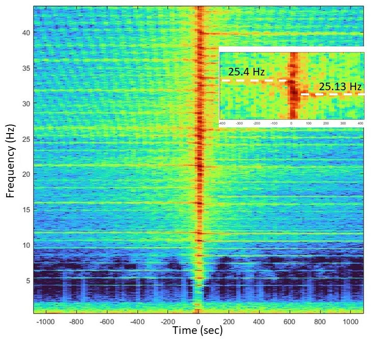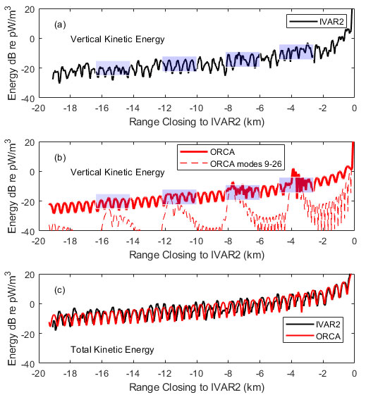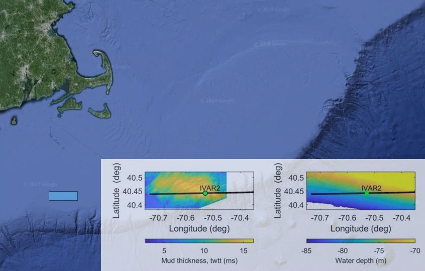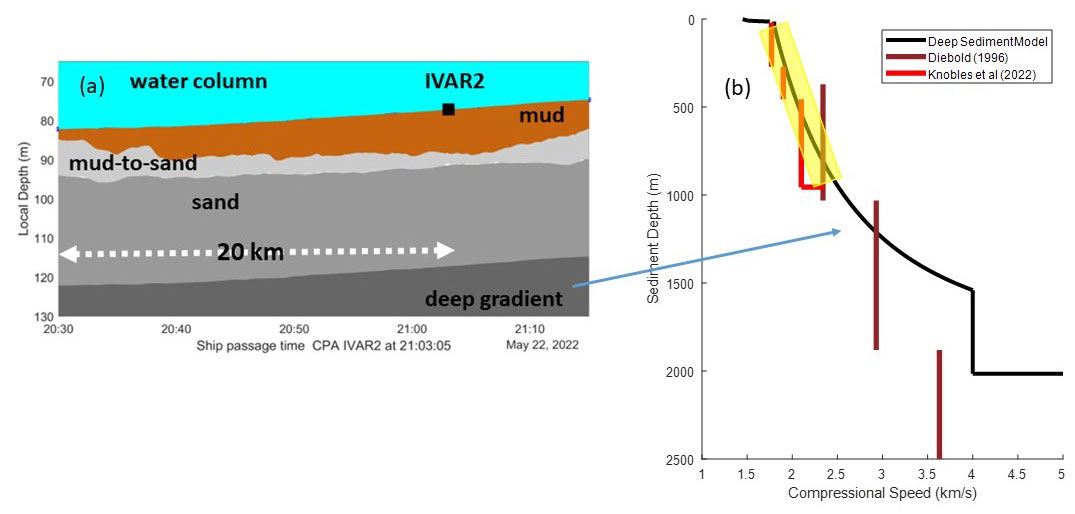 A A A Volume : 46 Part : 1 Proceedings of the Institute of Acoustics Vector acoustic observations and modeling of underwater noise from a ship closing towards the sensor location over a 20 km range P. H. Dahl, Applied Physics Laboratory, University of Washington, Seattle, USA D. R. Dall’Osto, Applied Physics Laboratory, University of Washington, Seattle, USA 1 INTRODUCTION Vector acoustic observations of underwater noise emissions from a merchant ship are made as function range in waters of depth 77 m on the New England Mud Patch, an area approximately 100 km south of Cape Cod, MA. The measurements took place in conjunction with the 2022 Seabed Characterization Experiment (SBCEX). The primary objective of SBCEX is the study of sound propagation involving sea floors consisting of fine-grained sediments; in this region manifested as a mud-like layer of order 10 m thickness, commencing at the water-sediment interface (Fig. (1)). The observations were made with the Intensity Vector Autonomous Recorder (IVAR2) a system that records four coherent channels of acous- tic data continuously, one channel for acoustic pressure and three for acoustic acceleration from which acoustic velocity is obtained. Stratigraphic analysis of experimental area identifies sub bottom layer structure over the first ∼ 50 m of seabed commencing with the first, low-speed, mud layer. The observed ship transect (via AIS) spans more than 20 km in closing and 10 km in opening about IVAR position, and the stratigraphy data over this range span is incorporated in the form of adiabatic modeling. The focus of this presentation is on low frequency observations (approximately 25 Hz) that probe deeper sediments beyond this observed stratigraphy. The paper is organized as follows: In Sec. 2a brief description of the data based on the ship transit through the SBCEX experimental area is given along with details on data processing. Section 3 gives a geoacoustic description of the upper sediments based in part on the known stratigraphy and informed by several SBCEX published results, and describes a proposed geoacoustic model for the deeper sediments. Evidence for characterizing a large ( ∼ 1000 m) portion of deeper sediments with compressional sound speed increasing approximately linearly with depth is provided in Sec. 4 by way of observations and modeling of vertical kinetic energy. Conclusions are provided in Sec. 4. 2 DATA DESCRIPTION The M/V Glen Canyon is a 285-m container vessel, powered by a 11-cylinder diesel-electric engine. The IVAR2 sensor was located at 40.4416 ◦ N, 70.5282 ◦ W (during this particular deployment of SBCEX), with the closest point of approach (CPA) of the Glen Canyon with IVAR2 occurring at 21:03 UTC 22 May, 2022, while at a speed pf approximately 20 kt. The CPA as determined by Automatic Identification System (AIS) data is of order 10 m from the IVAR2 locaion on the seabed in terms of horizontal range on the sea surface, although such a small length scale relative to size of the ship can remain indeterminate without impacting this analysis. Figure 1: Experimental area for SBCEX approxiimately 100 km south of Cape Code, MA (blue rectangle). Insets show path of the M/V Glen Canyon over the IVAR2 sensor (green dot) in terms mud thickness as linked to two-way travel based on time high-resolution chirp sonar (left) and water depth (right). Figure 2: Acoustic pressure as a function of time and frequency for the transit of the M/V Glen Canyon over the IVAR2 sensor. Time is relative to CPA with negative and positive time represent- ing closing and opening in range from IVAR2, respectivley. Inset shows the spectral line near 25.4 Hz during closing phase and downshift to 25.13 Hz during opening phase. Plot color scale is relative pressure spectral level, increasing in level from blue, green to red. A time-frequency analysis of the ship passage closing and opening about CPA (Fig. 2) shows broad band and line spectral components. The latter are of primary interest, with the 25.4-Hz spectral line being representative. In view of the speed, this line represents an upshifted frequency from the original source emission near 25.28 Hz. The upshifted-line undergoes a small down-shift of ∼ 0.27 Hz, consistent with the approximate propagation angle, ∼ 30 ◦, relative to horizontal near CPA. 2.1 Potential and Kinetic Energy Estimates In this study, vector acoustic observations of the underwater ship noise at the IVAR2 site are limited to estimates of complex, narrow band acoustic pressure p̂(t ) and acoustic velocity V̂x,y,z (t ) in the x, y, z directions as a function of time t. The center frequency of the spectral line (Fig. 2) subject to further analysis is 25.4 Hz with bandwidth ± 0.25 Hz, although numerous other spectral lines associated with underwater noise emissions from the ship are available for study. Data are initially recorded at sample rate 16000 Hz, and baseband demodulated and decimated to a sample rate of 100 Hz for this low-frequency analysis. From these quantities the acoustic kinetic energy Ek, and the vertical component kinetic energy Ekz are evaluated as follows: and where ρw is sea water density equal to 1028 kg/m3. For reference the acoustic potential energy Ep(t ) is evaluated as where cw is sound speed measured on the IVAR2 platform and equal to 1491 m/s. The time T=12s, is the period over which a moving average is taken to yield the energy quantities as a function of time t, which are expressed as their decibel equivalents in dB re pJ/m3. 3 UPPER SEDIMENT STRUCTURE AND MODEL FOR DEEP SEDIMENTS The upper sediment structure in the SBCEX experimental area has been studied extensively using a combination of high-resolution chirp acoustic reflection data1, e.g., producing the map of two-way travel time data in Fig. 1, along with sediment cores and various acoustic propagation measurements providing data for inversion of seabed properties2,3. Three prominent horizons from the two-way trav