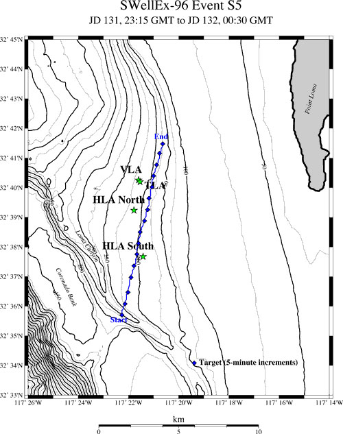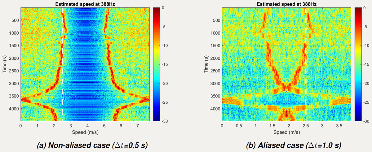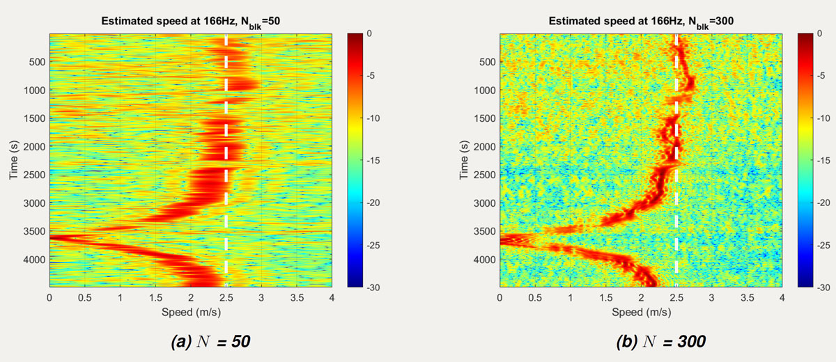 A A A Volume : 46 Part : 1 Proceedings of the Institute of Acoustics Signal processing criteria for single hydrophone sound source ranging in shallow waters Sung-Hoon Byun, Korea Research Institute of Ships and Ocean Engineering (KRISO), University of Science and Technology (UST), Korea Jeong-Bin Jang, Korea Research Institute of Ships and Ocean Engineering (KRISO), University of Science and Technology (UST), Korea 1 INTRODUCTION It is common to use a hydrophone sensor array to localize underwater sound sources. However, its performance being dependent on the number of sensor elements, sufficient array dimension is required to guarantee the localization performance, which makes handling the array difficult and place the burden of processing large amounts of data. As an alternative to the array processing, a single-hydrophone source localization based on various waveguide effects have been studied1,2,3,4,5. In particular, the field differencing1 of a single hydrophone signal has the advantage of being simple to calculate and being able to use various types of sound sources. Basically, the field differencing method correlates the received pressure fields at different ranges from a radiating source, and the resulting cross correlation field has an oscillation pattern providing clues about the radial velocity of moving sound source. Accordingly, the estimated radial velocity can be used to calculate the range from the receiver via fitting with the closest point approach (CPA) velocity model if the CPA is observed or from the waveguide invariant if it is not observed. Its effectiveness was proven using shallow water environmental experiment data1,4 and was also proven even for the reliable acoustic path (RAP) experiment data3 where the receiver depth was 4500m. Recently, its application has been extended to tracking underwater unmanned vehicle2. Although the field differencing method is quite simple, it has been observed that errors can occur in the velocity estimation, and performance can deteriorate depending on the parameter values used in the signal processing. With respect to it, this study reviews the signal processing parameters used in the field differencing method and their underlying constraints which needs to be considered during its application. We focus on the velocity estimation problem since the range calculation can be regarded as a subsidiary procedure of velocity estimation if the environmental information such as sound speed profile and waveguide invariant are known accurately enough. 2 SOURCE VELOCITY ESTIMATION BY THE FIELD DIFFERENCING METHOD The field differencing method1 uses the cross-correlation field Ic (R, ∆r ) which is defined as where R is the average range of the source, and ∆r is the range interval between the cross correlated signals when the source is at R. ℜ [·] denotes the real part of a complex value. When the source moves with the radial velocity vr, the cross-correlation field can be shown to have the following relation according to the normal mode theory1,6, where is the average wave number of modes, f is the signal frequency, and vp is the average modal phase speed, i.e. . It is observed that Eq.(2) will have the maxima when ∆r is an integral multiple of 2π. Both the broadband and the narrowband signal can be used to estimate vr from Eq.(2). For narrowband case, we can vary the time interval ∆t with f fixed, whereas for broadband case, we can vary the frequency f with ∆t fixed to find the remaining factors including vr. The radial source velocity vr can be estimated by the Fourier transform of Ic (R, ∆r). That is, Ic (R, 0), Ic (R, ∆t, . . . , Ic (R,(N − 1)∆t) are Fourier transformed to estimate vr at each range R. The peak position in the normalized abscissa of the transform domain contains the velocity information. In particular, if the peak position of the Fourier transform for the narrowband case is denoted as p, then vr is obtained by Here, can be approximated by the average sound speed in the waveguide, and f is the signal frequency in Hz. 3 SIGNAL PROCESSING PARAMETERS OF THE FIELD DIFFERENC ING METHOD In this section, we review the signal processing parameters for calculating the cross correlation field and discuss their impact on the velocity estimation. The SWellEX-96 experiment data7 was used for analyzing the effects of parameters. In particular, we used the VLA data of the event S5 which was from a source towed at a 54 m depth and at a constant speed of 2.5 m/s along a linear track as described in Figure 1. The data from the element no.13 at the depth of 189.8 m was used among twenty one elements available for the VLA. As shown in the figure, the track has the CPA point to the VLA after about three quarters of total track length. We discuss only the narrowband case in the below. However, because the frequency f and the time interval ∆t are reciprocal in Eq.(2), the constraints can inferred similarly for the broadband case. Correlation time interval (∆t) Correlation time interval ∆t controls the time lag between two signals correlated in Eq.(1) where ∆r = vr∆t. When Ic is Fourier transformed to estimate the velocity, ∆t plays the role of sample period. Thus, it determines the maximum radial source velocity according to the sam pling theorem. Figure 2 shows the results for different time intervals, where the case (b) ∆t = 1.0s exceeds the allowed sample period for the given source velocity. Using such a long time interval results in velocity aliasing, as shown in Figure 1(b). The relationship between the maximum radial velocity and the time interval is as follows: Figure 1: Map of the ship trajectory of the event S5 in the SWellEX-96 experiment. Another constraint on ∆t for the narrowband case is that it must be an integral multiple of signal period. This is because if the time interval is not a multiple of the cycle, the pressure field used for cross-correlation are phase shifted relative to each other,
