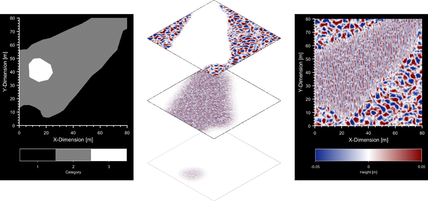 A A A Volume : 46 Part : 1 Proceedings of the Institute of Acoustics Content generation for SAS change detection simulations S. F. Johnson, The Pennsylvania State University, USA 1 INTRODUCTION Synthetic Aperture Sonar (SAS) based Change Detection requires estimating and accounting for differences in the navigation track between base and repeat pass collections. In dynamic environments, there are also changes of the seabed because of hydrodynamic and/or biologic activity, which can mask detection of the intended anthropogenic activity. Combined, these uncertainties make the use of collected data challenging for purposes such as validation of signal processing techniques and study of the spatiotemporal coherence of the scattered acoustic field. In this paper we describe the development of a dataset specifically generated for such assessments leveraging the prescriptive nature of simulation. Content generation is a topic which has received substantive investigation, with significant advances made in the fields of computer-generated imagery (CGI), and both recreational and “serious” gaming. Techniques used to generate and combine seabed textures, such as hydrodynamically-generated sand ripples, biotubatively-generated fish pits, and power-law roughness, will be described. To represent the evolving nature of the seabed in dynamic environments, a model for horizontal diffusion was employed. Two evolving seabed scenes were generated, with several collection aspects. For each of these combinations four sets of acoustic time-series data and reconstructed imagery were generated: an initial pass for a base image, an easy case with just a handful of localized disturbances, a medium case also including diffusive sand ripples, and a hard case also including a collection geometry mismatch. These sets of data are intended to test SAS reconstruction techniques, change detection techniques, and data/registration techniques. The process of developing these SAS datasets can be thought of in several discrete steps: Relief Generation (i.e. generating the ”world” that the sonar is operated in), Acoustic Rendering (i.e. calculating the sonar time series response of the ”world”), Image Reconstruction (i.e. application of synthetic aperture techniques), and Image Processing (i.e. image registration, and change detection). The focus here is the relief generation with Procedural and Declarative techniques and description of the dataset applicable to SAS based Change Detection. The intermediary steps of acoustic rendering and image reconstruction will be discussed only briefly as there are myriad other papers on these topics. The image registration and change detection steps are left to the consumer to develop and demonstrate. Figure 1: Semantic map (left), individual texture layers (middle), and composite seafloor relief (right). 2 CONTENT GENERATION 2.1 Overview For several decades, computer-generated imagery (CGI) has been utilized for generating or augmenting images and movies, relying on a combination of algorithmically or procedurally generated, along with manually or declaratively generated techniques. Perhaps the most notable improvement in the realism of procedurally generated content is often attributed to Perlin 1 following his involvement in the 1982 movie Tron. Interestingly, Bell2 mentions “procedurally defined objects” in the 1997 paper on side-scan sonar simulation. Here we describe combining both procedural and declarative content generation techniques to develop realistic and representative environments as the basis for a simulated dataset intended to test several aspects of Synthetic Aperture Sonar based Change Detection. 2.2 Procedural Generation Procedural approaches are those which are generated algorithmically, and are often driven by a stochastic component to promote variety and disrupt unnatural repetition. While certain algorithms are entirely heuristic, the more enticing and often realistic algorithms are based on models of physical processes. When procedural models are applied to textures, they can often be layered to create more heterogenous and interesting scenes. The upper limit of realism for procedural approaches is our ability to develop models for, and supporting parameterizations of, physical processes. Figure 2: Composite seafloor relief (left) and heightmap difference (right) for Scene 1. Seafloor relief has long been described as fractal, ranging from large scale bathymetry3 to small scale roughness where it is often described as power-law4. This physical basis, supported by known parameterizations and application to acoustics5,6, combined with algorithmic implementations in both spatial and wavenumber domains, make random fractal or power-law roughness texture a common starting point for use in sonar simulations2,7. To expand upon random roughness, several other models have been applied in a procedural approach. Tang8 proposed a rippled-sand texture model, which was applied to the generation of computationally efficient SAS-like imagery9. The effect of bioturbation was modeled with horizontal diffusion10, and utilized to simulate the decay of sand ripples11,12 and subsequent decorrelation of simulated SAS imagery11. A spatial domain model for a fish-feeding pit13 was combined with the horizontal diffusion model10 to simulate production of a random roughness seafloor texture with a spectrum that is power-law-like attributable to bioturbation14. These basis textures of random roughness, rippled-sand, bioturbation, and the process of horizontal diffusion serve as the procedural textures for this work. 2.3 Declarative Generation Declarative approaches are those which are generated manually, and often rely on the expertise of the user to ensure realism. In the entertainment industry this is often an artist composing content, while in the education industry it may be by the participation of an instructor to manipulate content of a serious game in a pedagogical manne