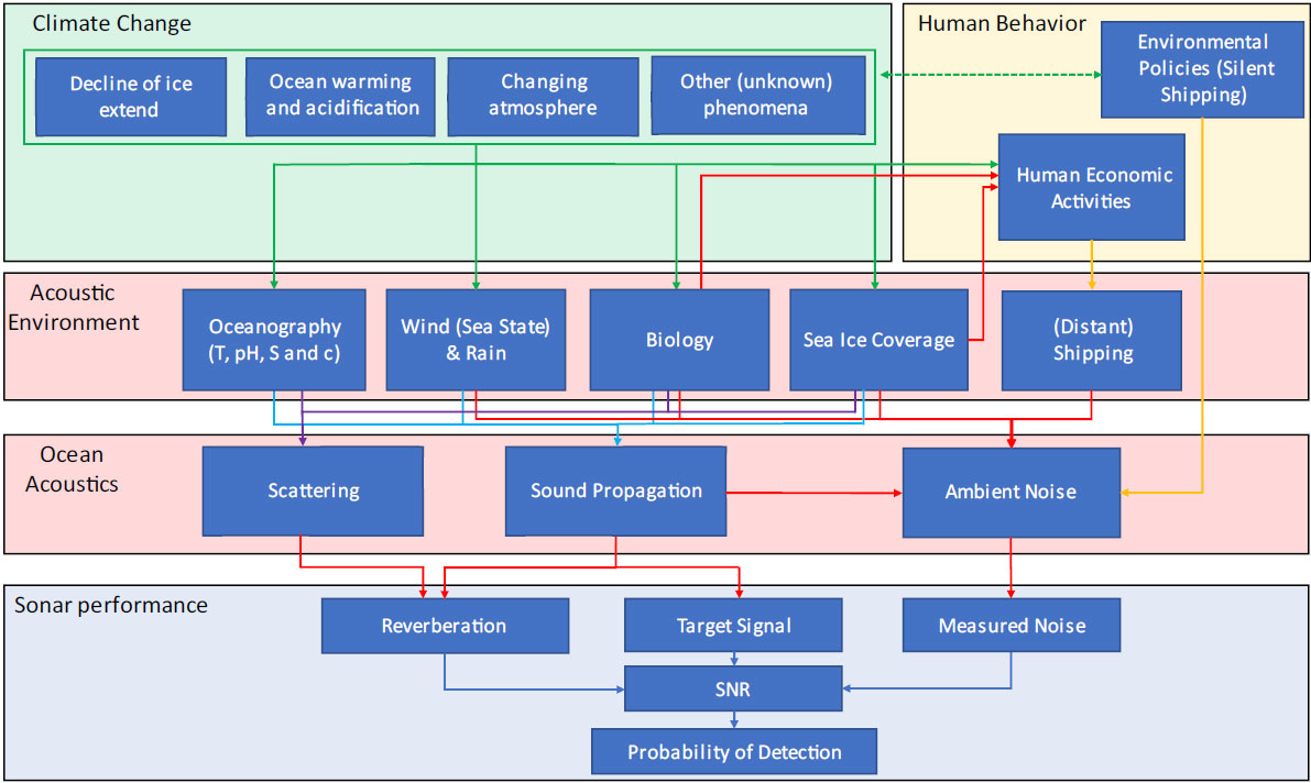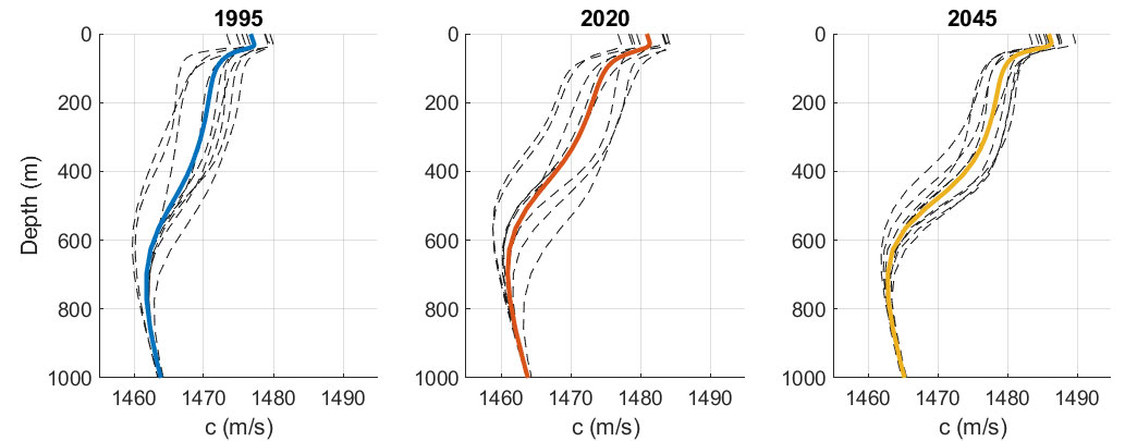A A A Volume : 46 Part : 1 Proceedings of the Institute of Acoustics The impact of climate change on sonar performance: A case study in the High North V. O. Oppeneer, TNO, The Hague, The Netherlands N. Risser, TNO, The Hague, The Netherlands R. van Vossen, TNO, The Hague, The Netherlands K. Pelekanakis, TNO, The Hague, The Netherlands G. Giorli, CMRE, La Spezia, Italy A. Russo, CMRE, La Spezia, Italy 1 INTRODUCTION It is currently well known that climate change is affecting the Earth [1]. About 90% of the added heat energy resulting from anthropogenic perturbations (e.g. greenhouse gases) is absorbed by the oceans [2] [3]. Consequently, the oceans’ temperatures are increasing globally. In polar regions this is accompanied with the melting of ice, which impacts the salinity gradients. These trends have local differences and depend on the area of interest (cf. chapter 2). This phenomenon affects the propagation of sound, and consequently sonar performance [4]. Oceanographic conditions are not the only factor affecting sonar performance. Wind, rain, biology, and anthropogenic sources such as shipping also contribute and must be taken into. In this work, climate change is related to sonar performance. A top-down approach is developed in a block diagram which relates climate change to sonar. Finally, this approach is illustrated using a passive sonar scenario case study in the high north. 2 CLIMATE CHANGE AND ITS RELATION TO SONAR PERFORMANCE Ocean temperature affects the acoustic sound propagation as well as other factors also contributing to the performance of a sonar system. Figure 1 presents a comprehensive approach relating climate change to sonar performance. This happens in several stages, climate change and human activities affect the Acoustic Environment, which describes all the important factors necessary to determine the Ocean Acoustics. The Ocean Acoustics describes the propagation, scattering and noise. Finally, the Ocean Acoustics affects the Sonar Performance, both on the signal and the noise side. The block diagram from Figure 1 can be used to analyse the impact of climate change in the area of interest, and gives insight in what literature or knowledge is necessary. Many institutes do climate modelling to compute the oceanography (temperature, salinity, pH) for a future date, [1], [5], [6]. Similar work is done for the wind and rain [7], [8], [9], although results do not always agree [10], [11]. However, future biology and shipping activities are hard to predict. The presence of a species depends on the oceanography, the overall ecosystem, and the presence of human activity as fishing. Most of the biology studies are conducted on few species, and to the best of our knowledge, there is no overarching work done on the change of animal and plankton distributions for future scenarios. Concerning marine traffic activity, we can separate it within shipping, leisure, and fishing. On one hand, the presence of fishing boats (and therefore the noise produced by them) depends on the presence of preys to capture, for which no real prediction is available. On the other hand, new commercial shipping routes are expected to open in the Arctic [12]. There is currently a lot of work being done on predicting the sea ice coverage in the Arctic. Predictions support a decrease in the ice sea coverage, more important in summer than in winter, [13], [14]. Eventually, the Arctic is predicted to be ice-free in summer time, even if all prediction don’t always agree of when this will happens or for how many months [15], [16], [17]. When enough information is gathered on the Acoustic Environment, modelling for scattering, propagation, and ambient noise can be applied to compute the relevant inputs for a sonar performance calculation. Figure 1: A block diagram, relating climate change to sonar performance. Arrows indicate how different blocks interlink with each other but not the strength of the link. 3 A PASSIVE SONAR CASE STUDY IN THE NORTH ATLANTIC 3.1 Scenario description The scenario that will be considered here is a passive sonar scenario. This means solving the passive sonar equation, which can be written as [18], [19], [4]: where 𝑆𝑁𝑅 denotes the signal-to-noise ratio in a given frequency band. 𝑅𝑁𝐿 is the radiated noise level, the sound radiated by the object of interest. 𝑃𝐿 is the propagation loss. 𝑁𝐿 is the ambient noise level, which is a combination of sea state noise (wind noise), rain noise, and shipping noise and 𝐴𝐺 is the array gain. The 𝑆𝑁𝑅 can be converted to a probability of detection using equation 7.34 of [19] as: where 𝑝𝑑 is the probability of detection, 𝑝𝑓𝑎 is the probability of false alarm, and 𝑅 is the linear SNR computed as: which is assumed to be 10−5. Furthermore, the detection range in this work is assumed to be the largest distance for which 𝑝𝑑 = 0.5 . In the scenario, a latitude of 76 degrees and a longitude of 10 degrees are chosen, where the water depth is 2200 m, as reported in [20]. The sediment is assumed for this case study to be medium sand (with properties described in [19]). A single hydrophone receiver at 30 meters depth is placed at these coordinates. The hydrophone is assumed to have a 1 s integration time, resulting in a processing bandwidth of 1 Hz. Furthermore, a submerged target is located at 40 m depth. It has two tonals, based on [21]. The first tonal is at 63.096 Hz, bandwidth is 0.1 Hz, and the integrated radiated noise level over this bandwidth is 130 dB re μ Pa2 m2. The second tonal is at 6309.6 Hz, same bandwidth, and the same integrated radiated noise level. It is assumed that these tonals have top-hat spectra: constant value within the bandwidth, zero outside of it. The integration bandwidth of the receiver is wide enough to capture all the energy of the tonals. The oceanography is described in 3.2. Wind and rain distributions is described in 3.3. Biology is not considered in t