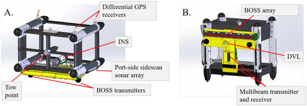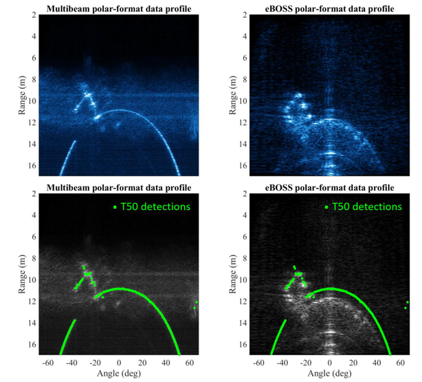 A A A Volume : 45 Part : 1 Proceedings of the Institute of Acoustics Augmentation of down-looking 3D SAS data with a high frequency multibeam sonar TM Marston, The Applied Physics Laboratory, University of Washington, Seattle, WA, USA KL Williams, The Applied Physics Laboratory, University of Washington, Seattle, WA, USA B Brand, The Applied Physics Laboratory, University of Washington, Seattle, WA, USA N Michel-Hart, The Applied Physics Laboratory, University of Washington, Seattle, WA, USA INTRODUCTION The Buried Object Scanning Sonar (BOSS) is a low frequency down-looking synthetic aperture sonar (SAS) that creates volumetric imagery by combining an along-track synthetic aperture with an across track real aperture.1 The low frequencies transmitted by the BOSS allow for significant acoustic penetration into sediment, enabling imaging of the sediment volume and detection of buried objects. In sediments presenting a small impedance discontinuity with the water, the precise location of the interface may be difficult to discern, especially in off-nadir directions where no specular backscattering contributions from the interface exist. In this case an accurate estimate of the burial depth of a detection – an important parameter for remediation – can be difficult to ascertain from volumetric imagery. One method for mitigating this issue is to augment the volumetric data with surface detections from a multibeam sonar. Not only does this mitigate the issue of water/sediment interface location ambiguity in the low frequency volumetric BOSS imagery, but it simplifies and enables the automation of near-surface feature extraction from the volumetric imagery. This paper describes the mechanical integration of a multibeam sonar onto a multi-sensor platform developed at the Applied Physics Laboratory, University of Washington (APL-UW) for detecting and classifying unexploded ordnance (UXO). Subsequently, data-fusion combining the output of the multibeam sonar with data simultaneously captured by a buried object scanning sonar mounted on the same sensor platform will be demonstrated. MULTIBEAM INTEGRATION ON THE MULTISENSOR TOWBODY The Multi-Sensor Towbody (MuST) is a sensor platform built around a MacArtney FOCUS 3 Towbody. The platform, developed by APL-UW via funding from the Strategic Environmental Resource and Development Program (SERDP) and Environmental Security Technology Certification Program (ESTCP), was designed for the detection and classification of proud and buried UXO,2,3 but has also been used for detailed sub-sediment survey applications and cable tracking. The acoustic UXO detection sensors on the platform include a Edgetech Buried Object Scanning Sonar (eBOSS), a dual frequency high resolution sidescan sonar also manufactured by EdgeTech and, most recently, a Reson T50 multibeam sonar. Position augmentation sensors, including an IXblue Rovins Nano inertial navigation system (INS) and Teledyne Pathfinder Doppler velocimeter (DVL), are also integrated onboard the system and are used for determining the underwater location of the towbody. A dual GPS antenna is used for positioning when the towbody on the surface. Figure 1 shows two annotated CAD drawings of the MuST. The main frame, resembling a box-kite, is composed of the FOCUS 3 towbody. The FOCUS 3 has control surfaces for controlling the roll, pitch and heading of the towbody, as well as changing the depth and steering port to starboard. As annotated in the figure, various sensors for UXO detection are mounted onto this towbody. Figure 1: A CAD model of the MuST towbody viewed from the front (A) and from beneath (B). Navigation systems, including an INS, DVL and GPS (for when the system is on the surface) are annotated. The location of the sidescan arrays on the nacelles are indicated, and the eBOSS and multibeam sonars are visible in the figure on the right. For scale reference the eBOSS array is 1.6 meters wide. The acoustic sensors integrated on the MuST are all mounted on the lower side of the towbody, with the sidescan sonar arrays being mounted on the outside of the lower port and starboard nacelles and the eBOSS, DVL and Multibeam being combined on the underside in a mechanical fairing. Along with the other sensors, the multibeam has a dedicated gigabit Ethernet channel used to stream data and communicate top-side with the ship. The data streams from the various sensors on the towbody are received by a data hub in the ship main lab where they are simultaneously recorded and redistributed for the purpose of real-time processing and display for towbody control and monitoring. Timing for the multibeam, INS and onboard sensors is performed via a Network Time Protocol (NTP) server, with the Multibeam having an additional 1PPS trigger to lock in the timestamps. LAKE WASHINGTON DATA FUSION TRIALS Lake Washington, located near APL-UW, is a large body of freshwater that has been used as a testing and performance verification site for the MuST. The lake, formed from a glacial trough, has an approximate surface area of 89 km2, a maximum depth of 65 meters,4 and a large number of natural and man-made targets of interest including many shipwrecks, plane wrecks and man-made debris. Strong currents are not present in the lake, and the average water residence time is approximately 2.3 years.5 The lake has undergone significant limnological changes over the last ~70 years, primarily as a result of fluctuations from phosphorous loading.5 Fine particles deposited from the Cedar and Sammamish rivers and local tributaries have formed a silty layer over much of the lakebed.6 Acoustically, this silty layer has a very similar acoustic impedance to water and, in the operational band of the MuST, appears very nearly acoustically transparent. Though a weak specular scattering contribution is often detectable, very little scattering from the surface or volume is present off nadir. Figure 2 illustrates this, showing along track vertical slices capt