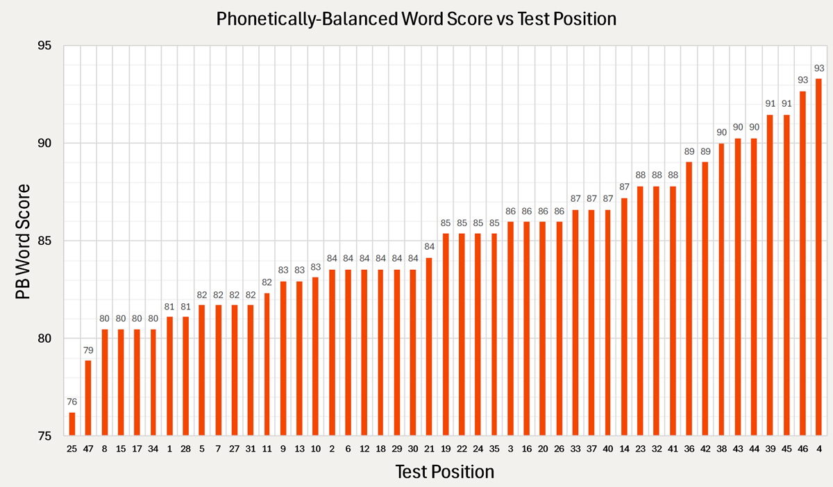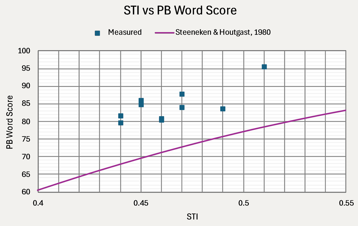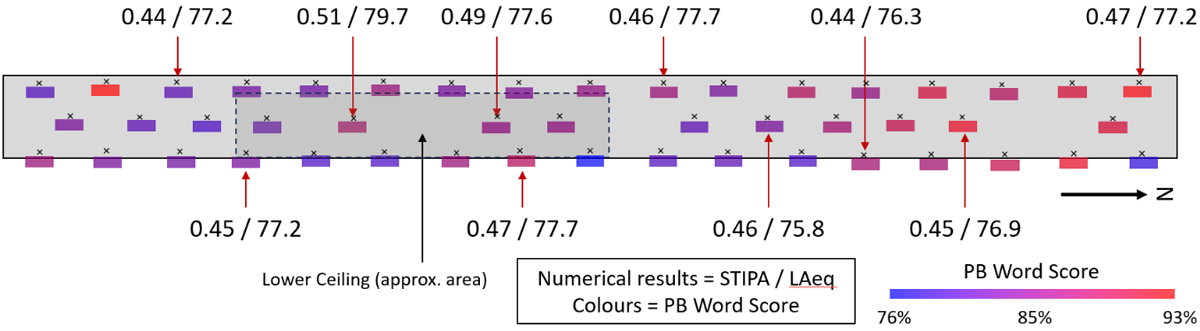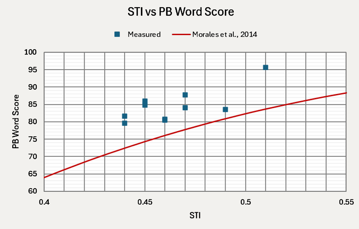 A A A Volume : 46 Part : 3 Proceedings of the Institute of Acoustics Word score vs. STI tests of a public address system in an underground train station platform O. Fong, Acoustic Directions, Australia C. Hanrahan-Tan, Acoustic Directions, Australia G. Leembruggen, Acoustic Directions, Australia 1 INTRODUCTION A mismatch was found by the authors between measured speech transmission index (STI) results using STIPA measurements and the STI derived from measured 1000-word phonetically-balanced scores on the platform areas of a new underground train station in Sydney. This paper presents the details and results of the testing that was undertaken on the platform and provides a discussion of the reasons that may have led to the difference in results between the measured STIPA values and those calculated from PB-word score relationships. The project specification required the intelligibility on the platforms to meet a minimum STI of 0.5 or Common Intelligibility Scale (CIS) rating of 0.7 as per Australian Standard AS 1670-4:20181. This level of intelligibility is required in areas that have a signal-to-noise ratio of 10 dB or more between the broadcast speech and the background ambient noise, and a reverberation time of less than 1.5 seconds. During the project’s commissioning phase, initial STIPA benchmarking on the platform area showed non-compliance with the project’s STI requirements and we were asked to assist with improvements. As the PA system was already installed, the system could only be optimised using equalisation and broadband level adjustments. Equalisation was undertaken to improve the perceived intelligibility and the STI in the presence of ambient noise. Although substantial equalisation, particularly at high frequencies can be used to maximise STI, the resulting tonal balance can actually degrade perceived intelligibility. As it was important to maintain natural voice tonality for listening comfort and perceived intelligibility, equalisation was undertaken to achieve these outcomes. Measurements made on the platforms after optimisation showed that the average STI was still unlikely to meet the project’s intelligibility requirements over the entire platform. This was due to a number of factors including i) the type of speaker used and their placement, ii) the restricted system architecture and rudimentary nature of the digital signal processing (DSP) and iii) architectural acoustics including limited sound absorption in the lateral direction and large parallel reflective surfaces. As conformance to the project’s specification was critical, the client suggested to attempt word score testing as an alternative method to demonstrate compliance. The phonetically-balanced-word (PB-word) score method using 1000 words was used to test for the percentage of words that was correctly heard. This percentage of correct words was then converted to its equivalent CIS and STI rating according to the conversion graph provided in AS 1670-4:2018, which is based on the original paper by Barnett & Knight2. The CIS and STI results obtained through PB-word scores complied with the project requirements. Letowski and Scharine3 provides a comprehensive discussion of various word and sentence tests and conclude that the phonetically balanced words are the most accurate of all the standardized tests and is recommended for use when high data accuracy and sensitivity are required. 2 TEST METHOD 2.1 Word Score Testing Word score testing was undertaken on two separate days in June and July 2024. As the station staff were busy preparing for handover and test trains were running, the listening test had to work around these intrusions. The test process broadly adopted the requirements provided in standard ANSI/ASA S3.2-20204 relating to the setup and administration of a word score test. In particular, this included the acoustic conditions at talker location, acoustic conditions at listener location, spoken test materials, and the selection and training of talkers to record the lists as per Section 6 and 7 of the ANSI/ASA standard. Using professional recording equipment, an experienced male voice-artist with an Australian accent recorded twenty lists of fifty phonetically-balanced words in a suitable recording studio. A carrier phrase (“Please write the word…”) preceded each test word and a seven second gap was provided between sentences. This gap allowed test subjects to write down the word and minimise cross-talk between sentences in the platform’s acoustic environment. The use of a single voice-artist as talker is a deviation from the recommendations in ANSI/ASA S3.2-2020, which recommends a minimum of five talkers. The use of only one talker would likely reduce the repeatability of the results. However, as the testing was undertaken as part of a commercial project, the engagement of an additional four voice artists would be costly and there was no requirement to repeat the test. Forty-seven test positions were marked out along the ground to cover the entire platform area, These test positions remained identical across both test days. At each location, the word score was calculated by counting the total correctly-identified words over the two days and dividing them by the total number of presented words. The measured spatially-averaged ambient noise level on the platform was 61 dB (LAeq) and the broadcast speech level was approximately 76 dB to 80 dB (LAeq) during testing. These levels were measured as a spatial average of approximately one quarter of the platform area. The pre-recorded word lists were preloaded to the station’s PA system and broadcast from the Station Masters Room to the loudspeakers serving the platform area. There was no contractual requirement to assess the STI with the tunnel ventilation system (TVS) operating, however word score tests conducted at ten positions with the TVS operating showed little change from the no TVS state. The selection of test subjects generally fo